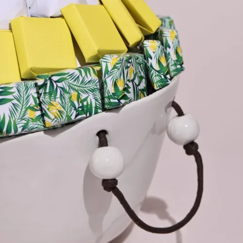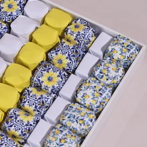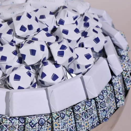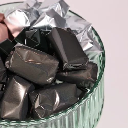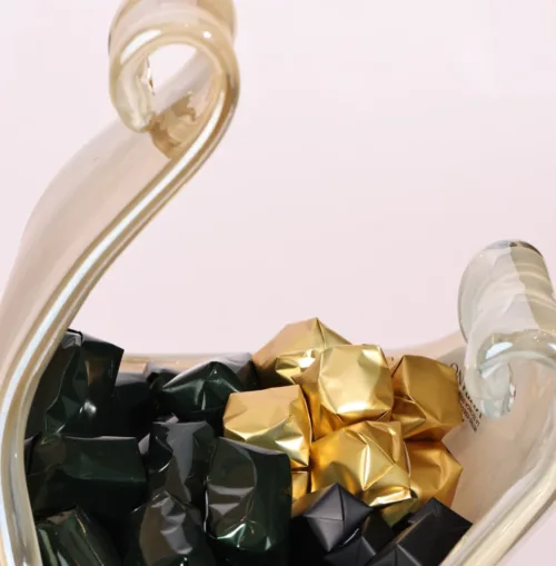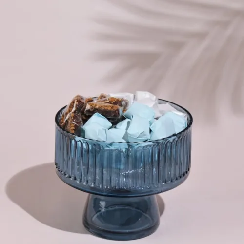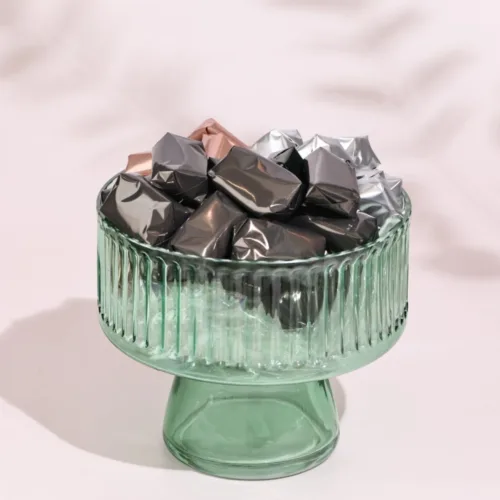 A colored glass bowl holding 1600 grams of 100% premium Belgian chocolate, including: -Milk chocolate with hazelnut pieces -White chocolate with wafer, hazelnut cream and coconut flakes -Milk chocolate with salted caramel and hazelnut pieces -Milk chocolate with yogurt cream, biscuit and strawberry jam -Milk chocolate with hazelnut ganache and caramel -Crispy balls coated with milk, dark and white chocolate -Chocolate-coated hazelnuts
