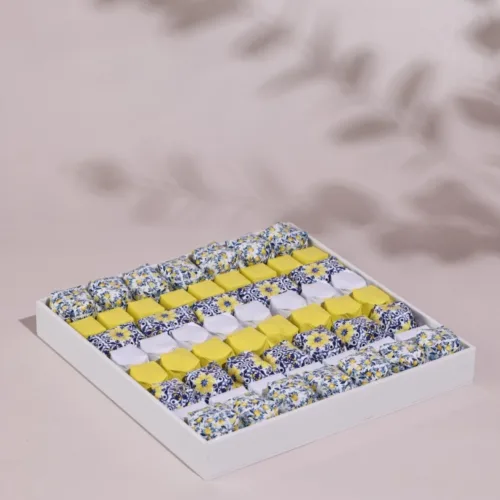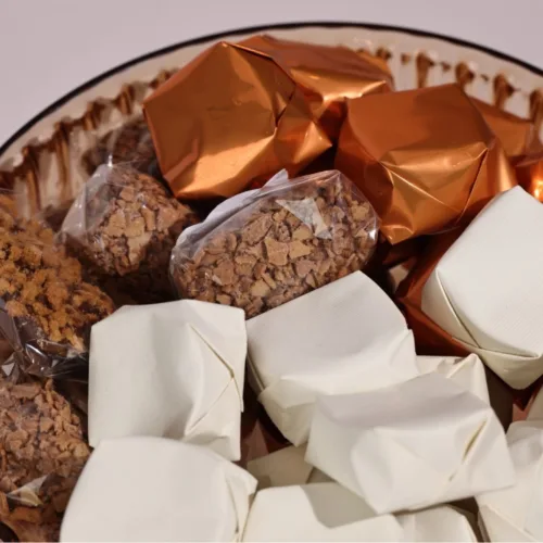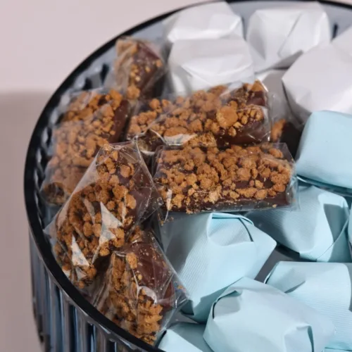 A glass tray holding 1000 grams of 100% premium Belgian chocolate, including: -Milk chocolate with hazelnut ganache and caramel -Milk chocolate with salted caramel and hazelnut pieces -White chocolate with wafer, hazelnut cream and coconut flakes -Milk chocolate with wafer and mocha cream -Milk chocolate with gianduja and hazelnut pieces -