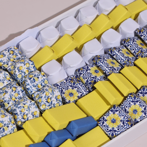 A marble stand holding 1120 grams of 100% premium Belgian chocolate, including: -Milk chocolate with hazelnut cream and crispy crêpes -Milk chocolate with hazelnut ganache mixed with cardamom and crushed coffee beans -White chocolate with matcha, caramel and pistachio cream -Dark chocolate with coffee cream -
