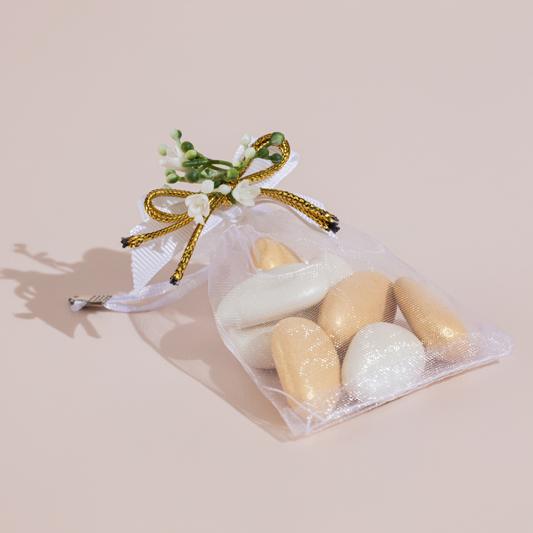 A decorated bag holding sugared almonds