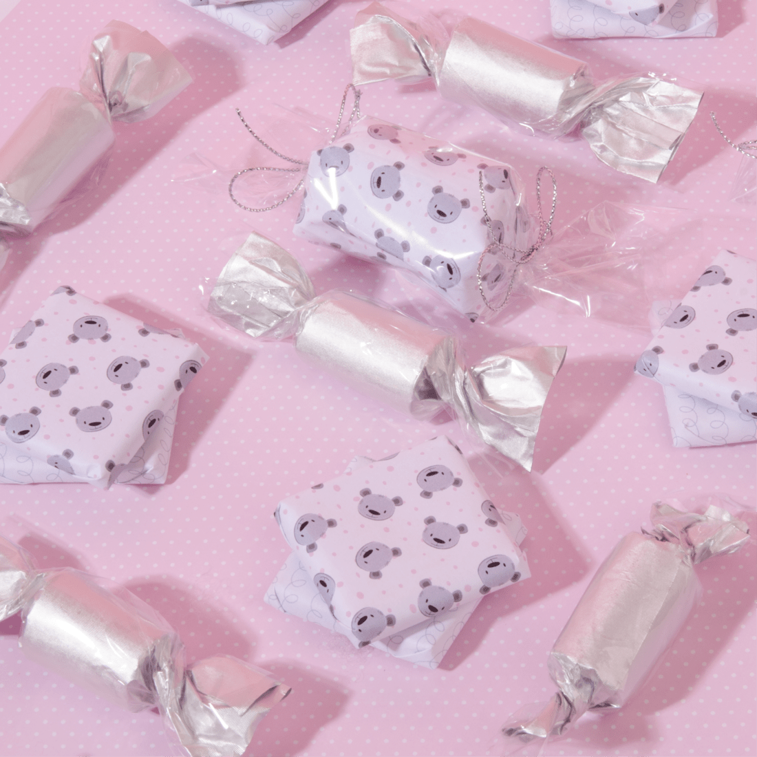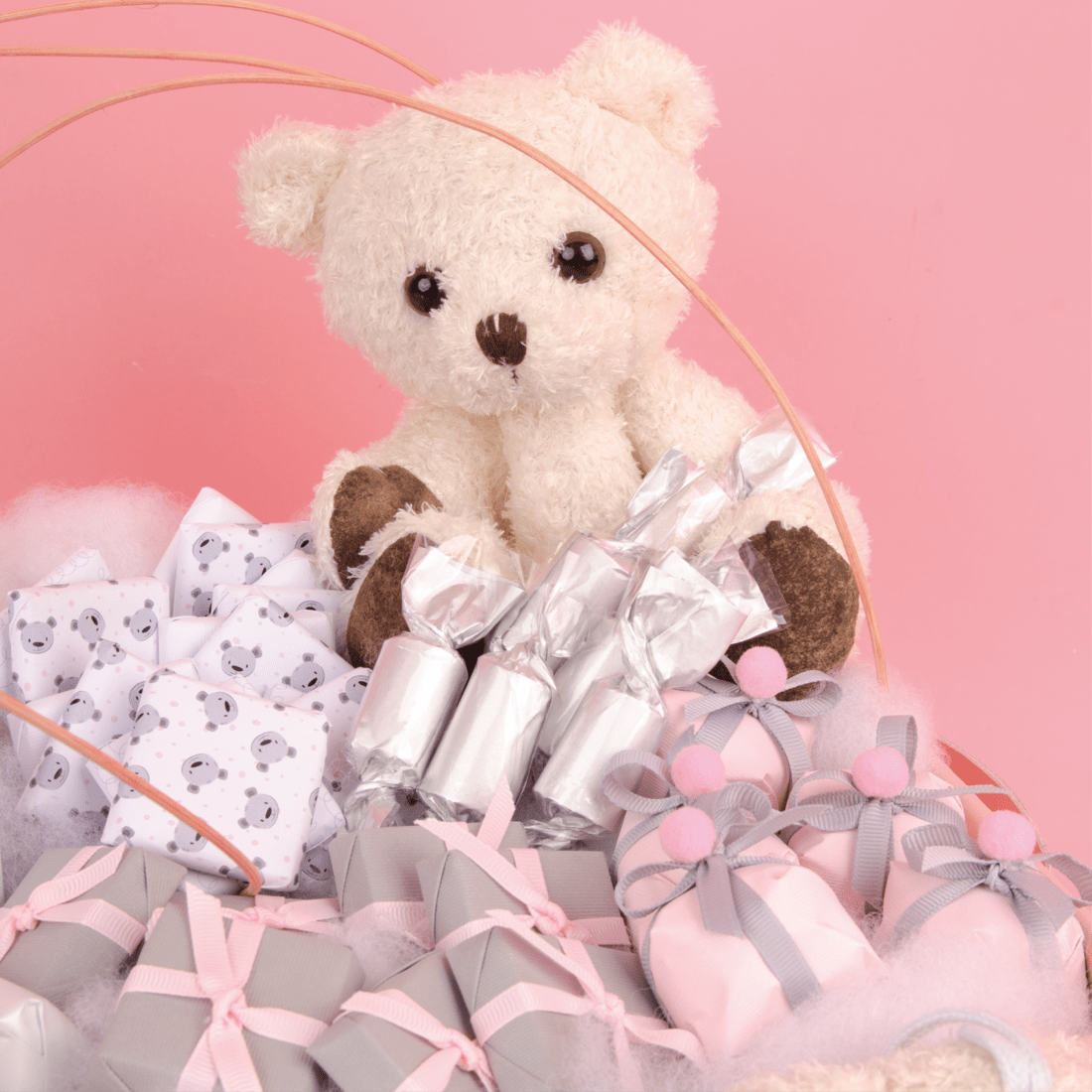 A pink leather basket holding 500 grams of 100% premium Belgian chocolate, a stuffed teddy bear and a ceramic teddy coin bank