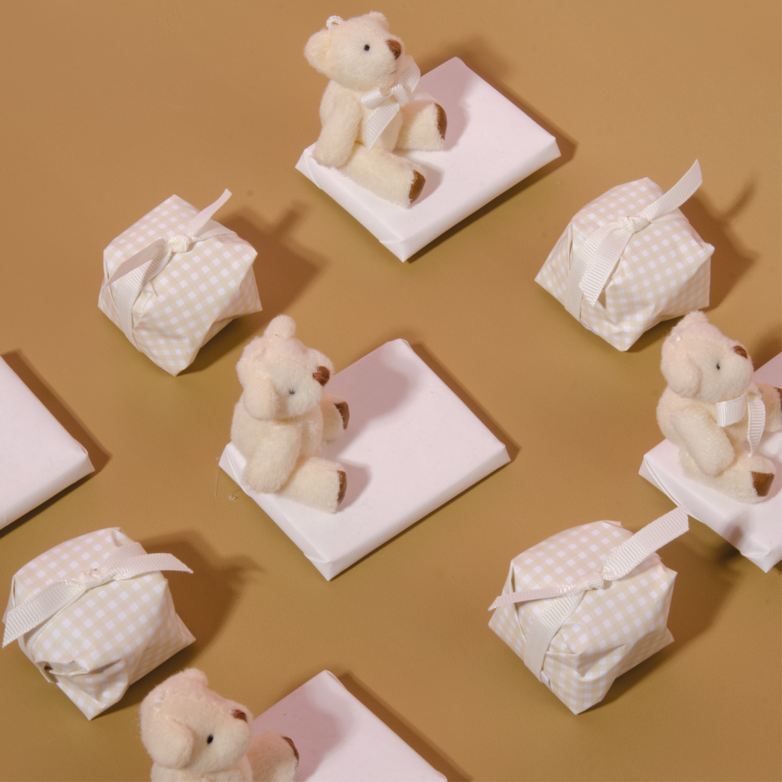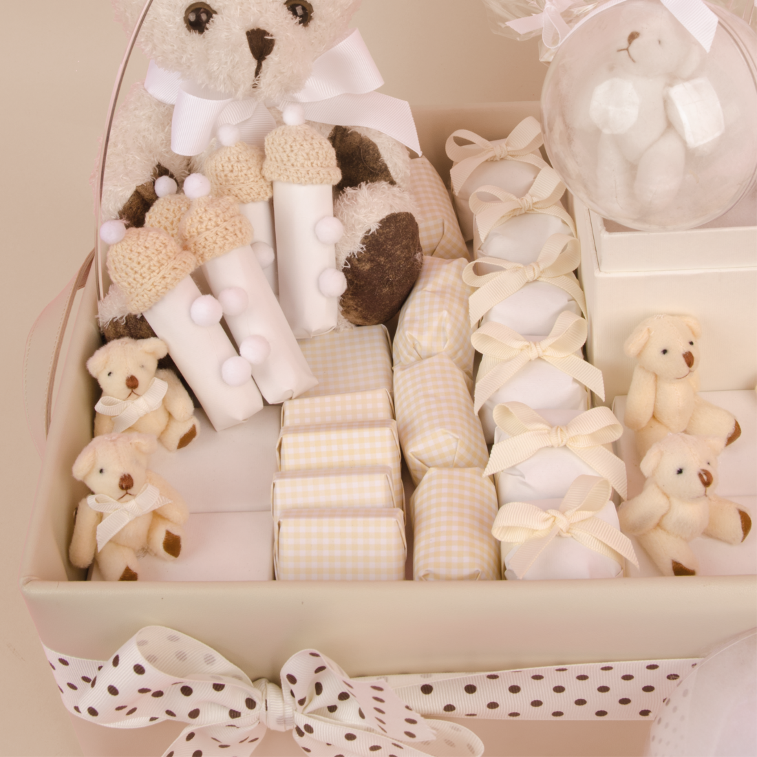 A beige leather basket holding 700 grams of 100% premium Belgian decorated chocolate, sugared almonds and a stuffed teddy bear