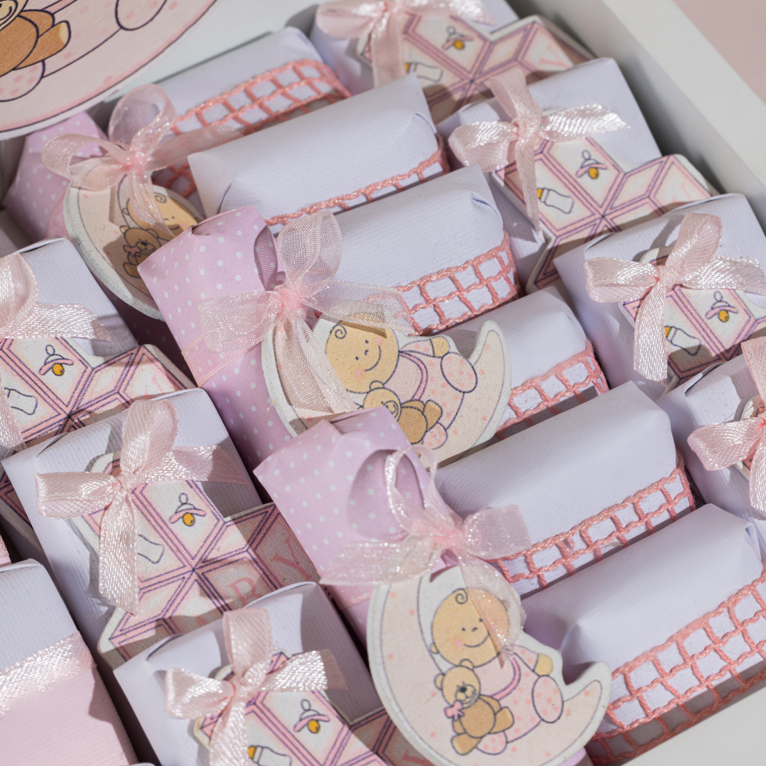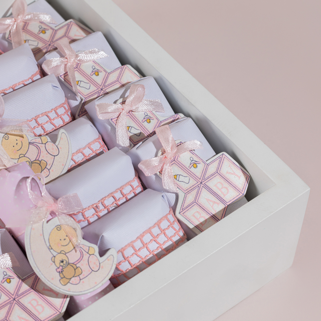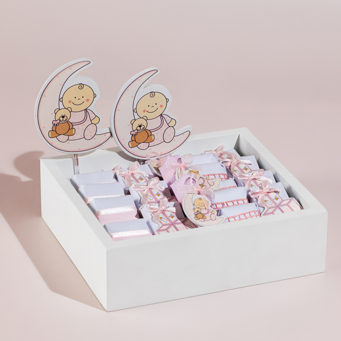 A white, wooden tray, holding 500 grams of 100% premium Belgian chocolate and two adorable little babies with moons