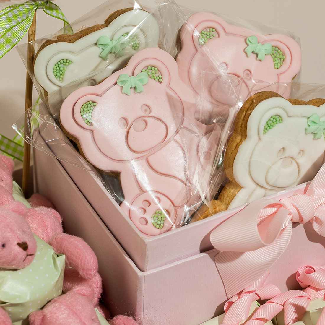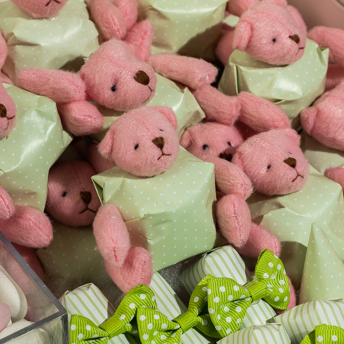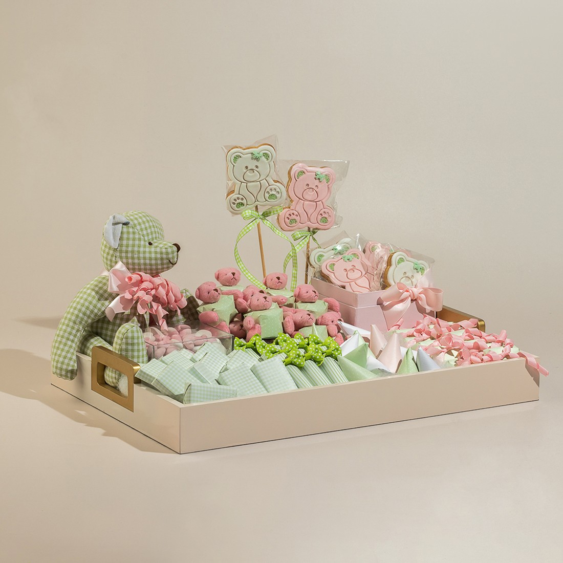 A pink, wooden tray with handles, holding 1500 grams of 100% premium Belgian chocolate and a stuffed teddy bear