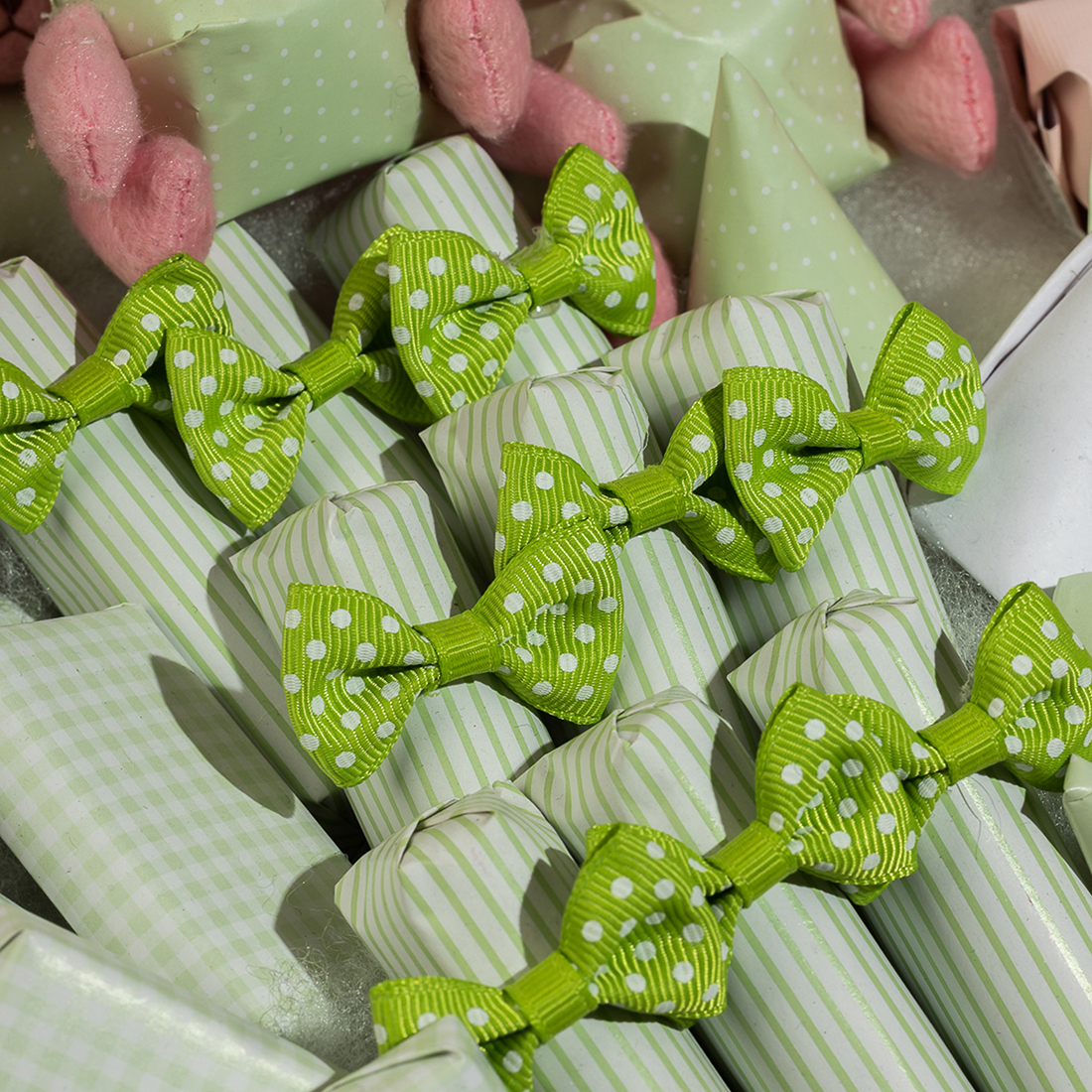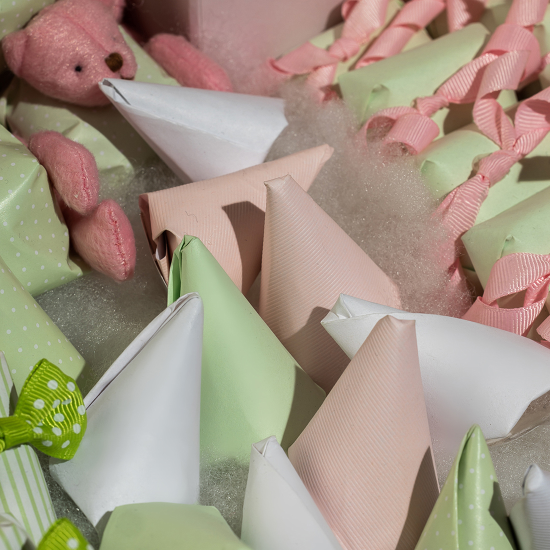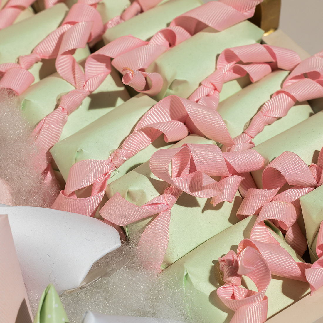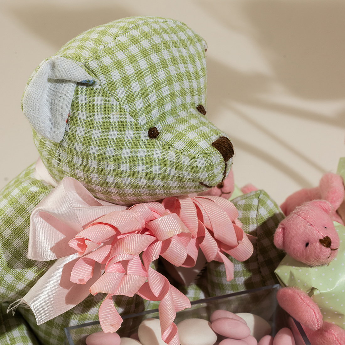 A pink, wooden tray with handles, holding 1500 grams of 100% premium Belgian chocolate and a stuffed teddy bear