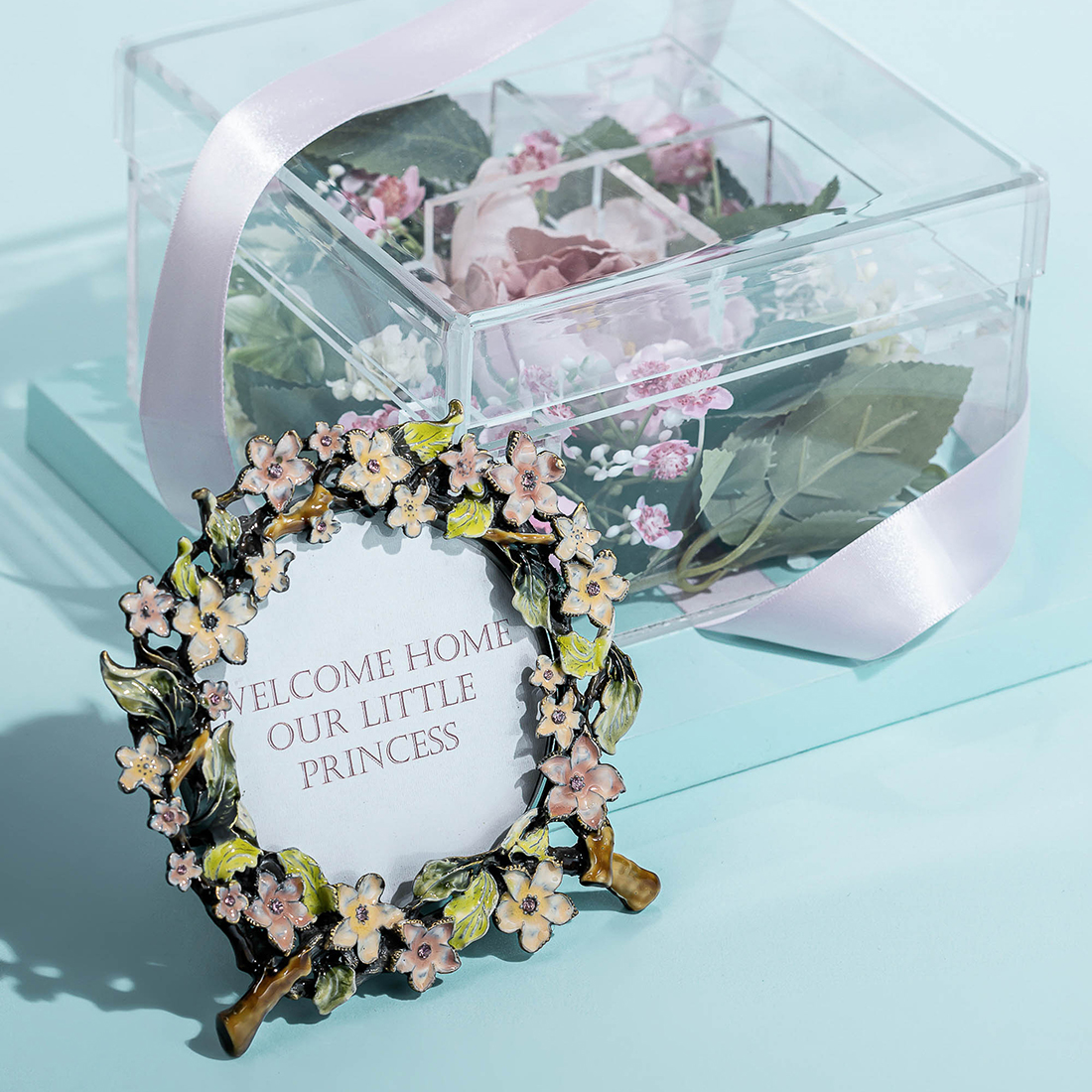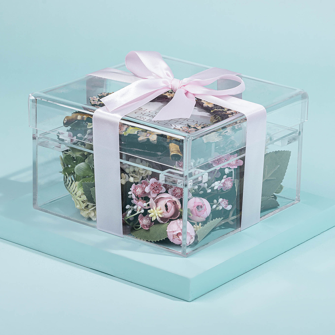 A see-through gift box filled with flowers, holding a floral frame with a quote