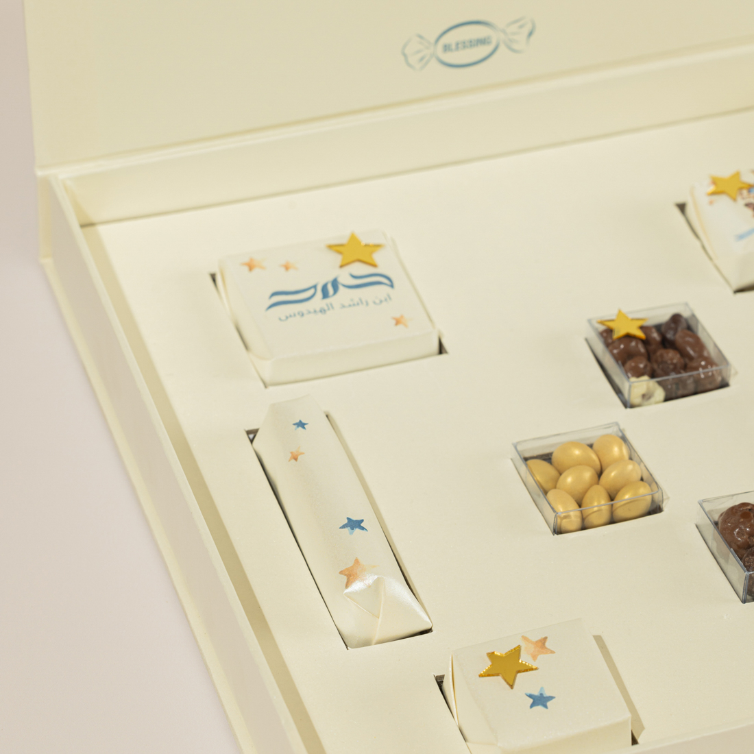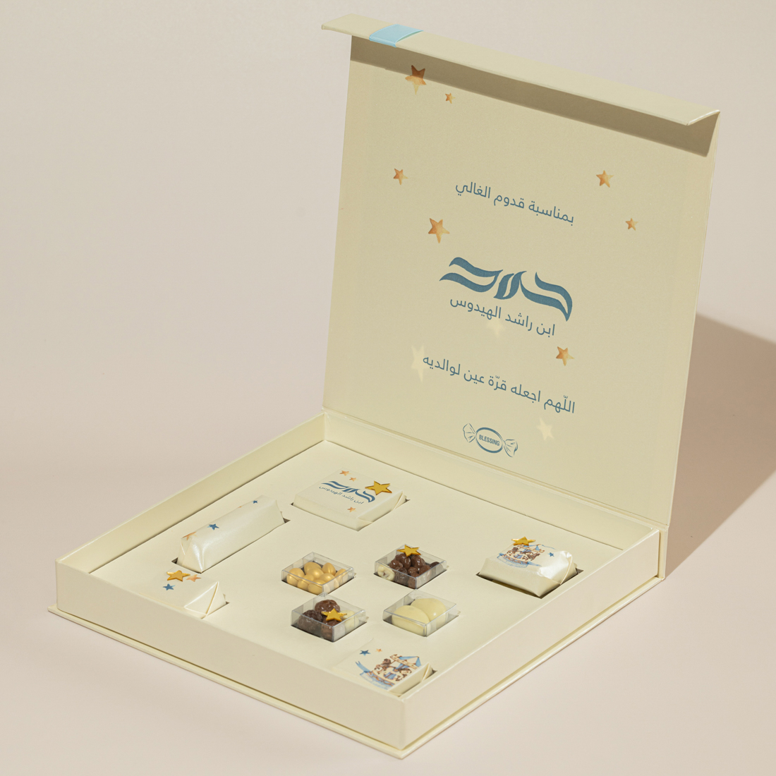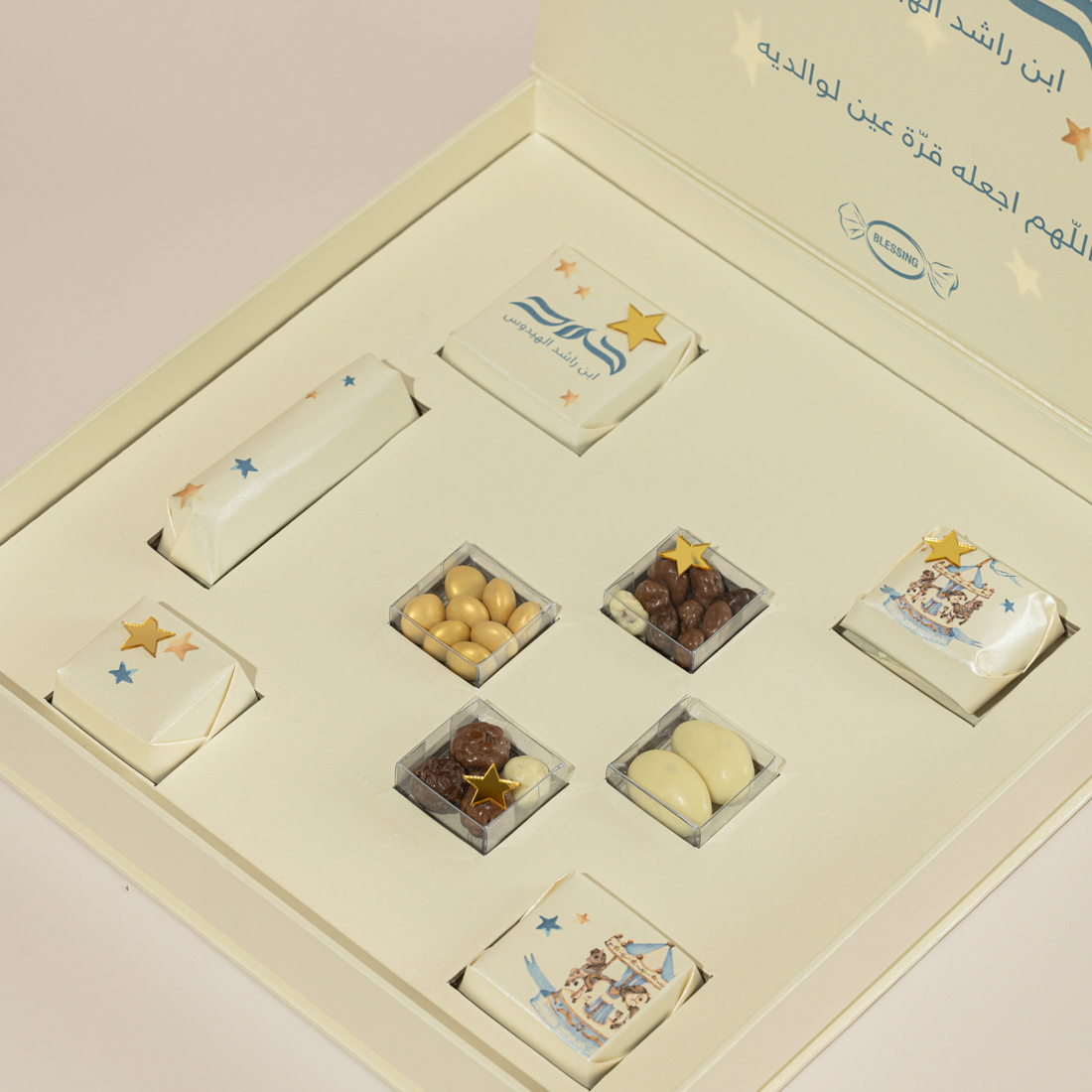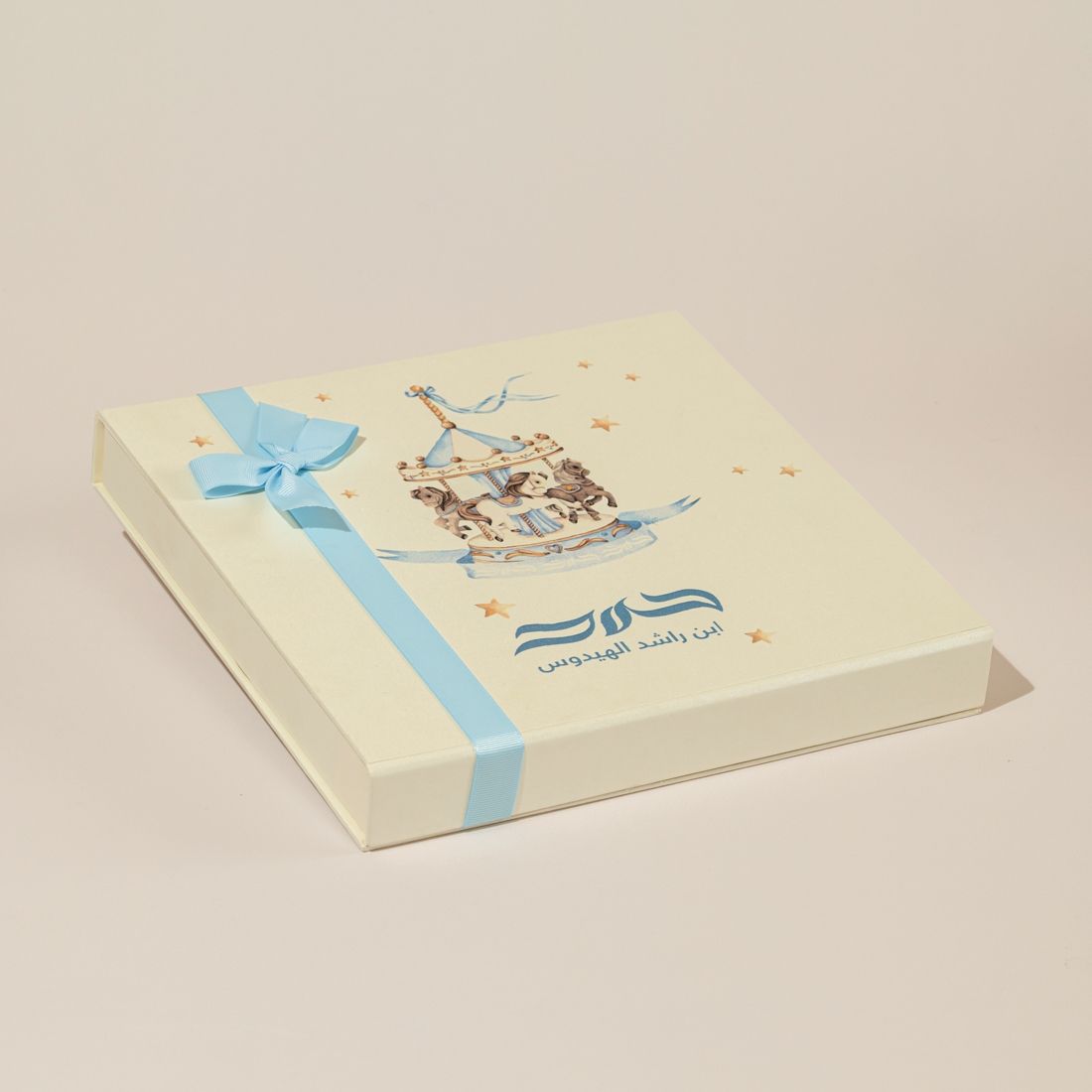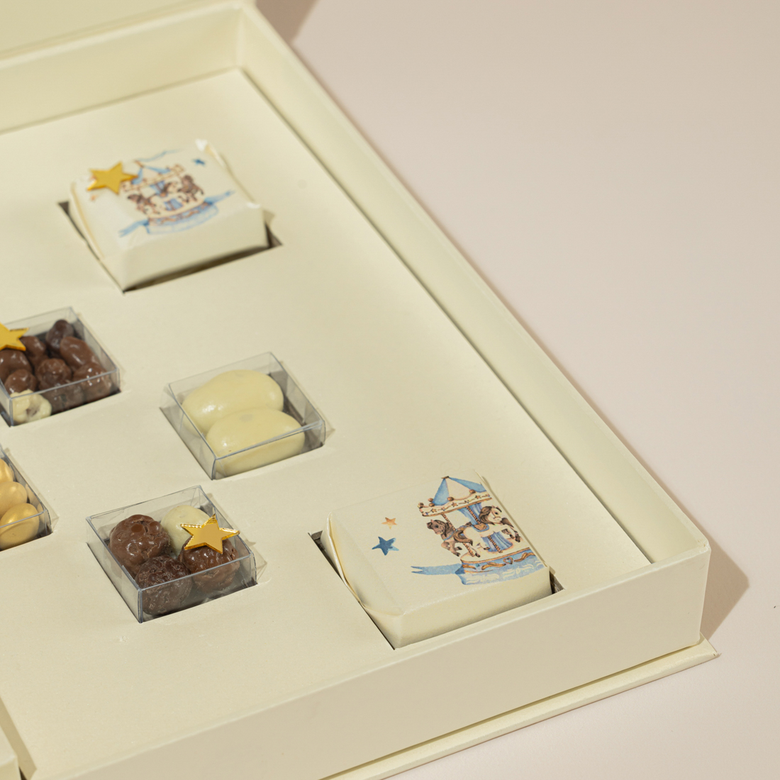 A personalized, carousel-themed box holding five pieces of decorated chocolate, sugared almonds and crispy chocolate balls