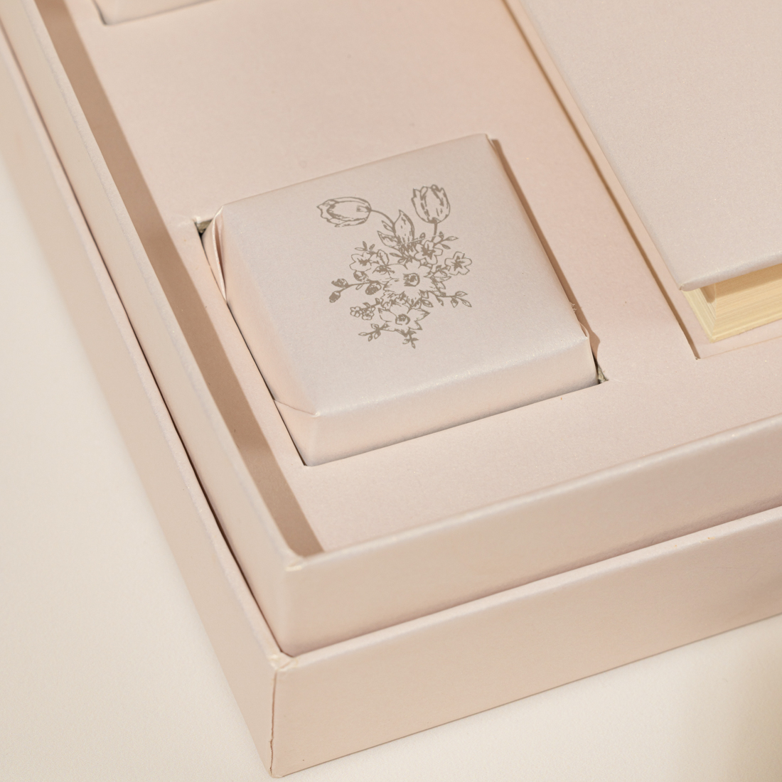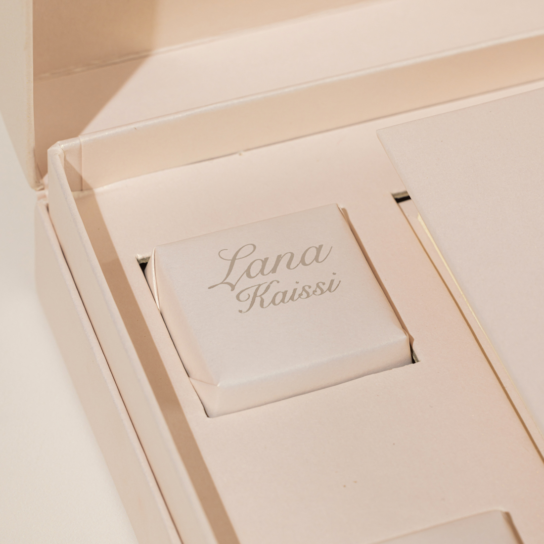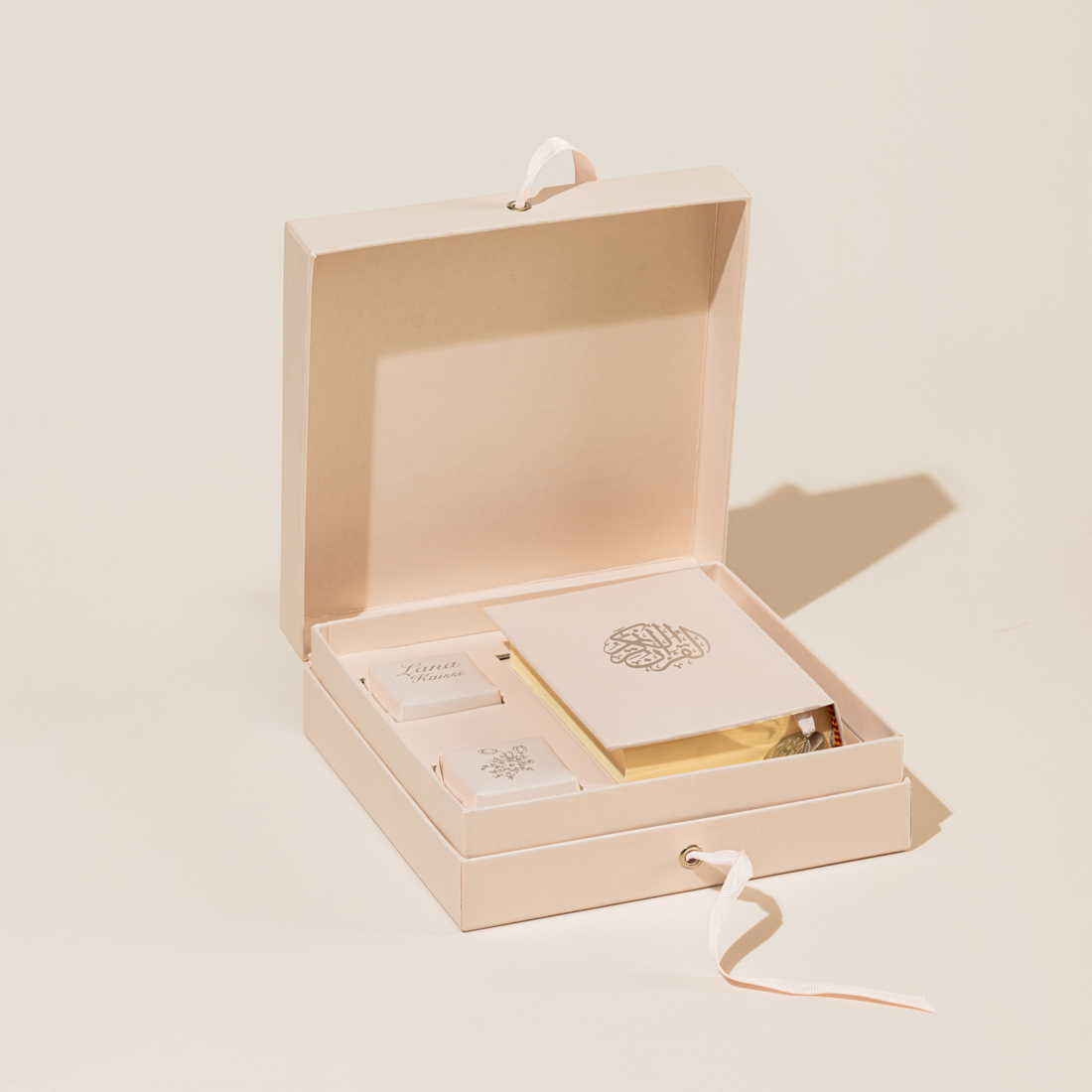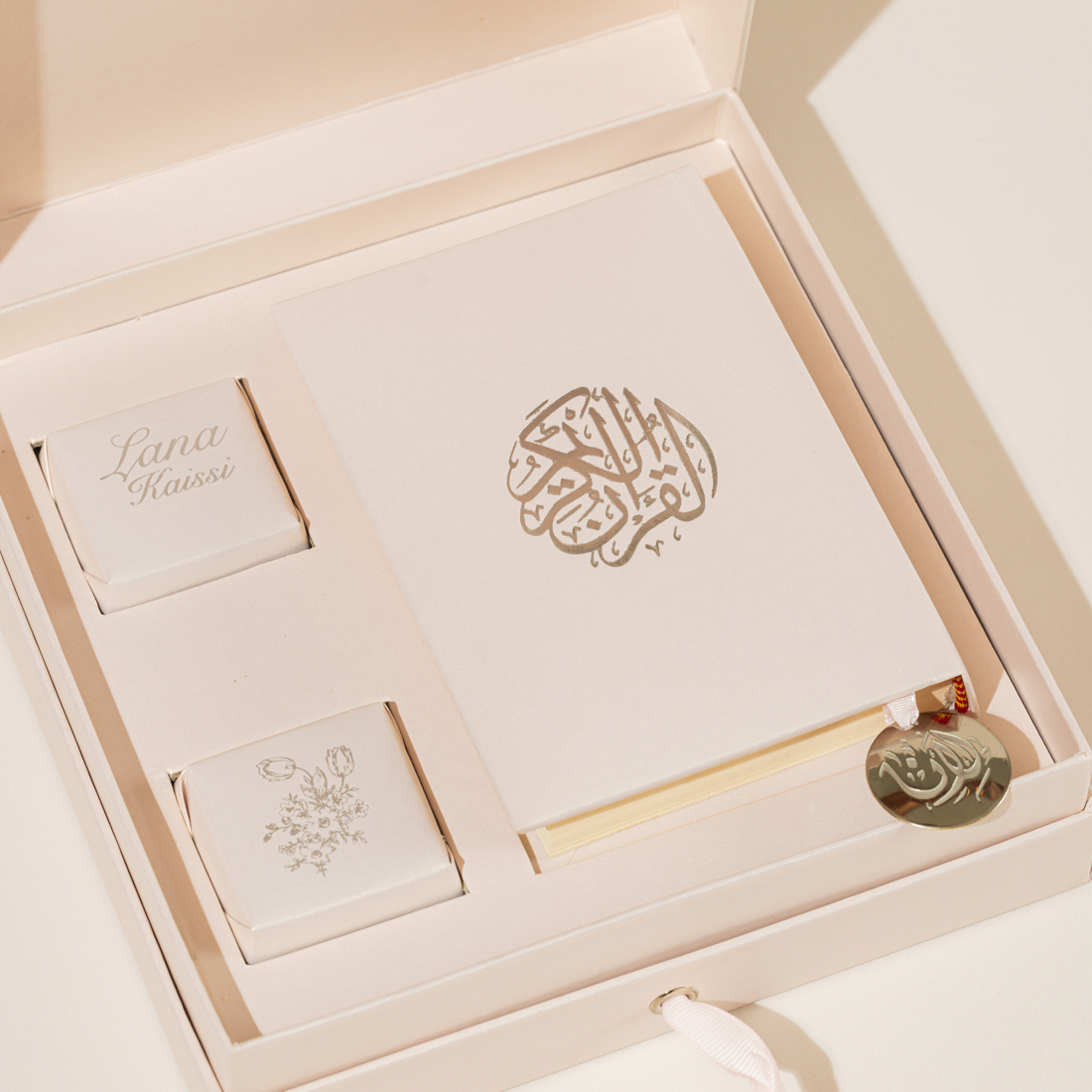 A gift set including the holy Quran and two personalized pieces of chocolate – all in a customized gift box