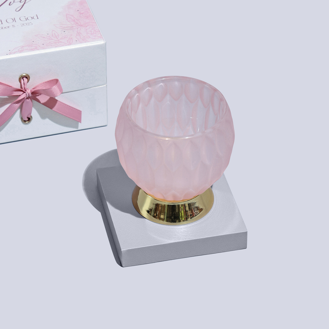 USD55A pink Murano glass candle in a decorated see-through box with a custom name plate. -