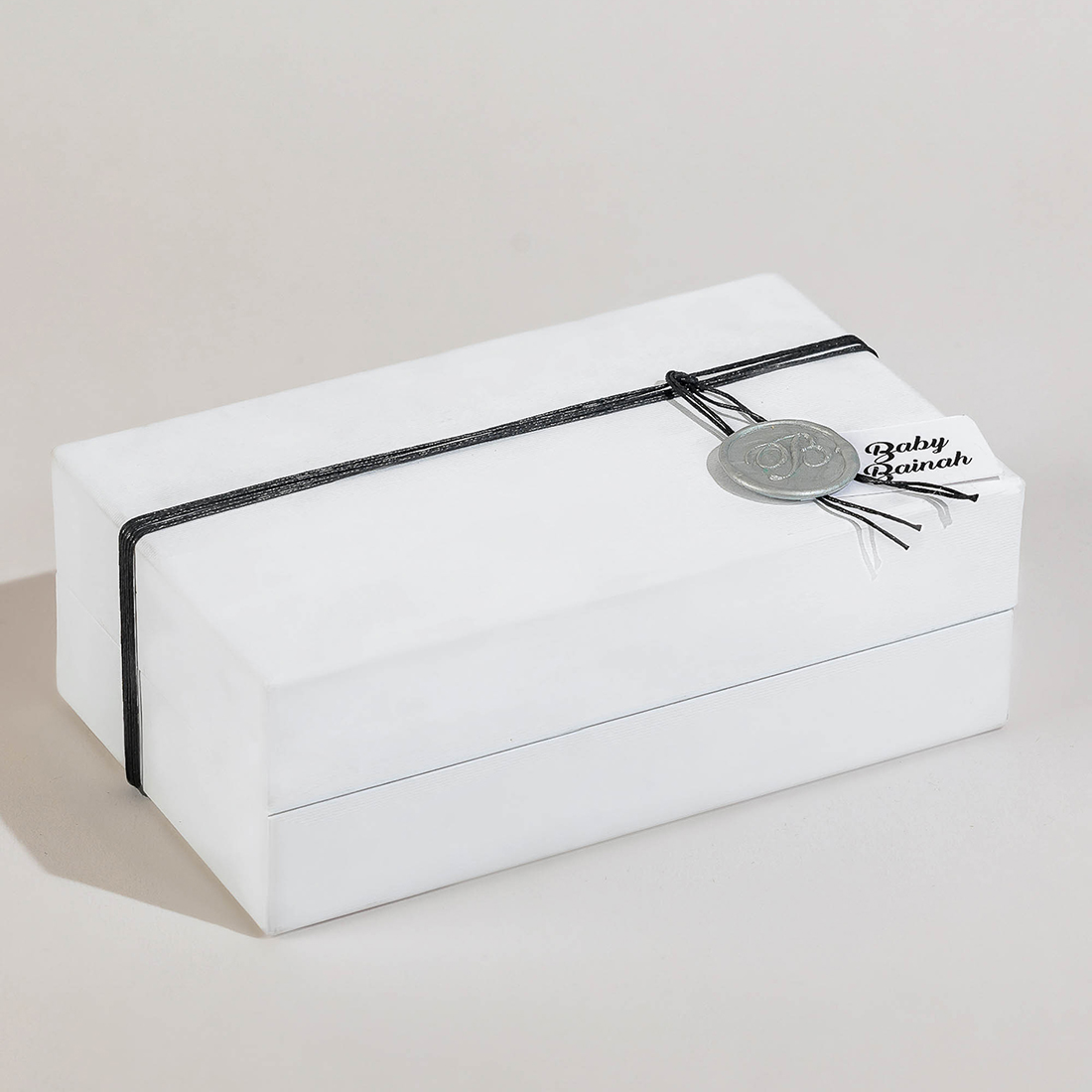 USD40A customized white gift box holding with five personalized chocolate pieces, two acrylic boxes of dragees, and a see-through box of personalized sugared almonds. -