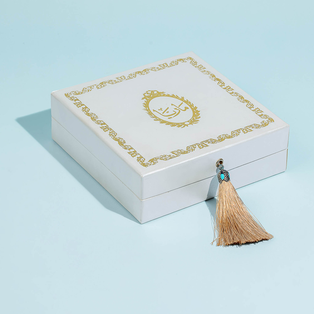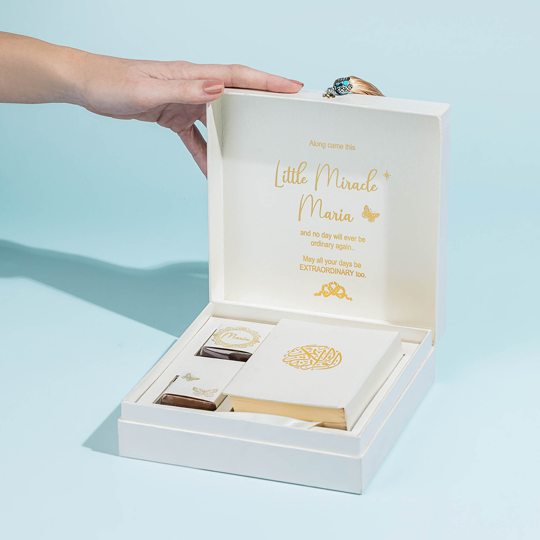 A gift set including the holy Quran and two personalized pieces of chocolate – all in a customized gift box