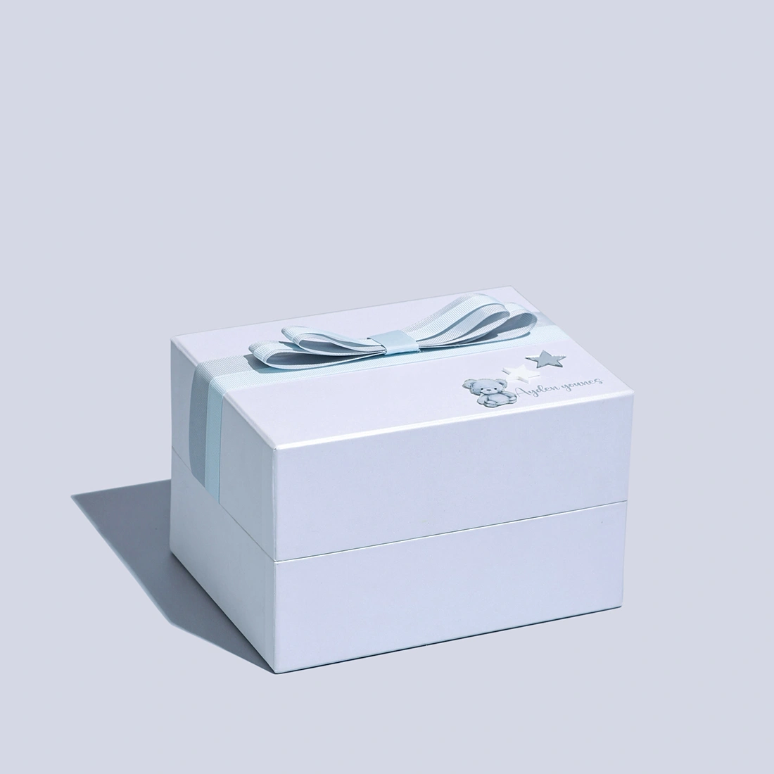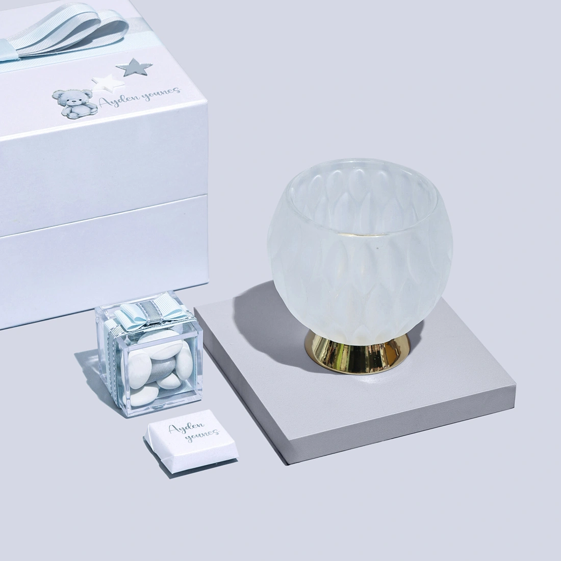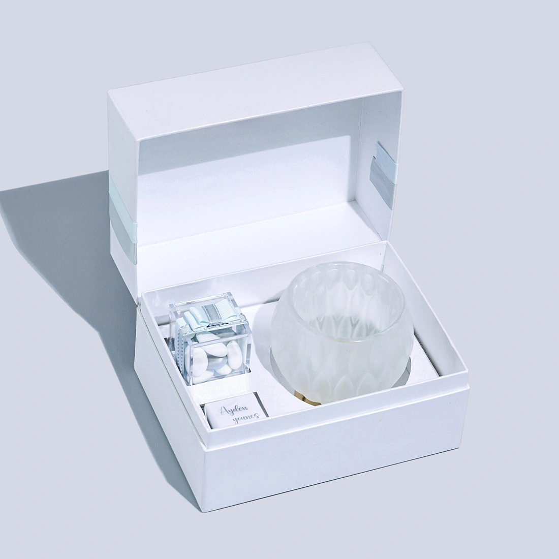 A gift set including a frosted glass souvenir with a personalized piece of chocolate and a box of sugared almonds.