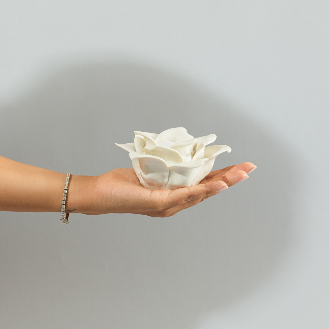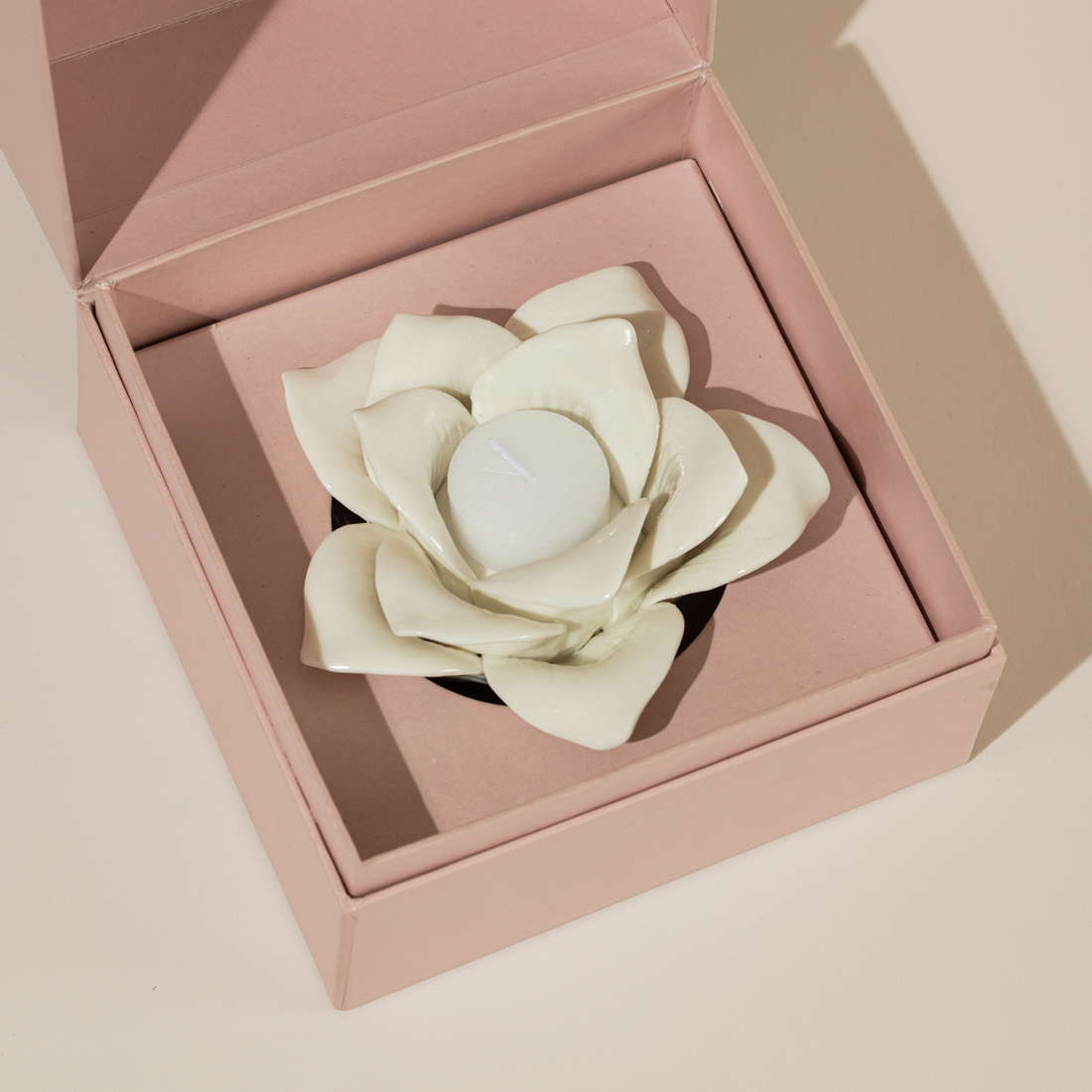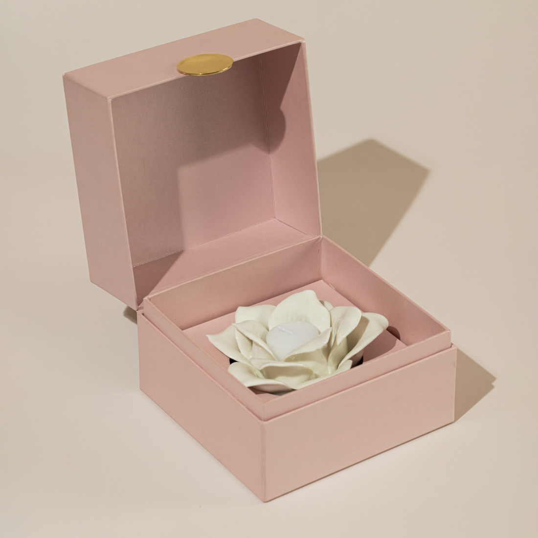 A ceramic flower-shaped candle in a customized gift box with a personalized name plate