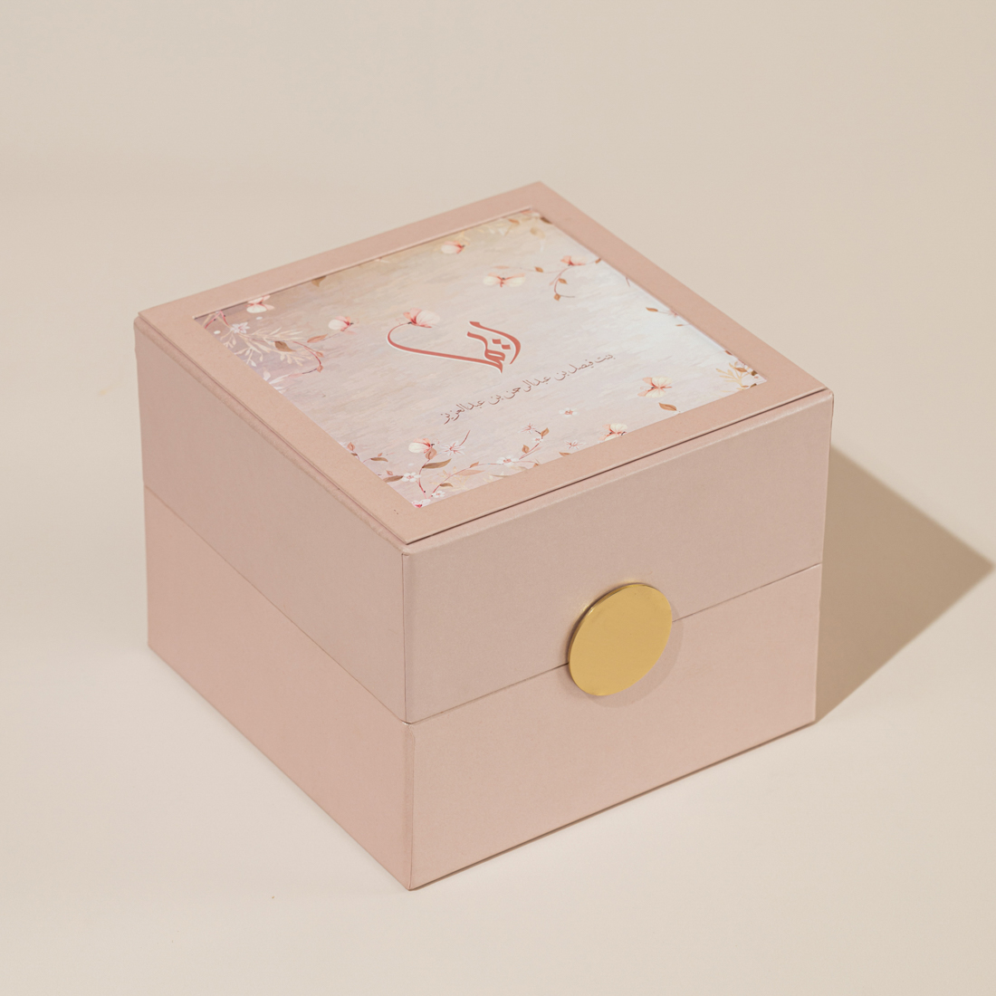 USD55A pink Murano glass candle in a decorated see-through box with a custom name plate. -