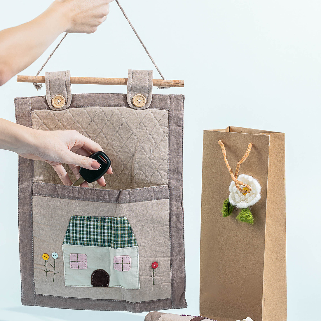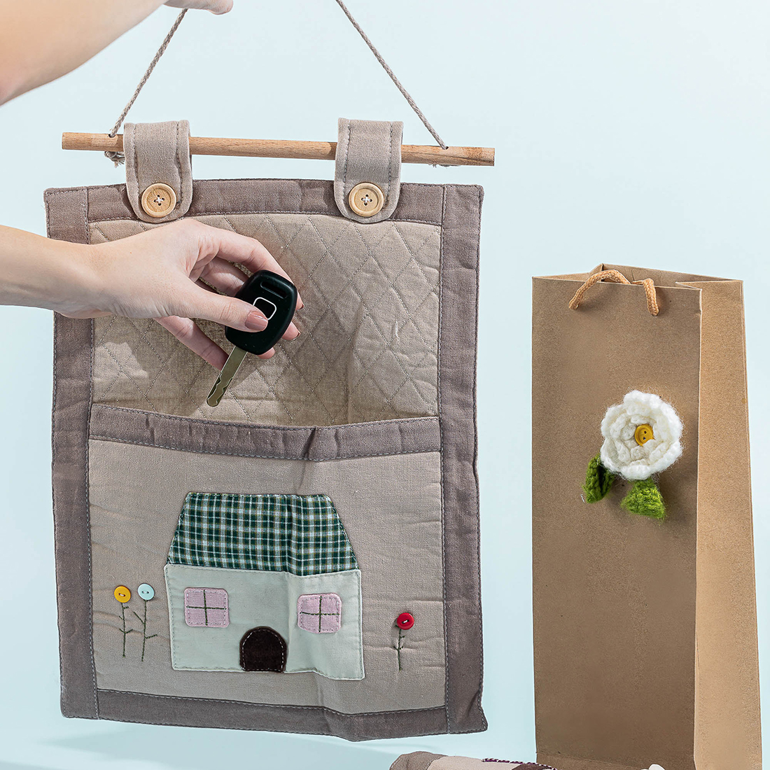 An embroidered door hanger with pouches used to hold keys, towels or any essentials
