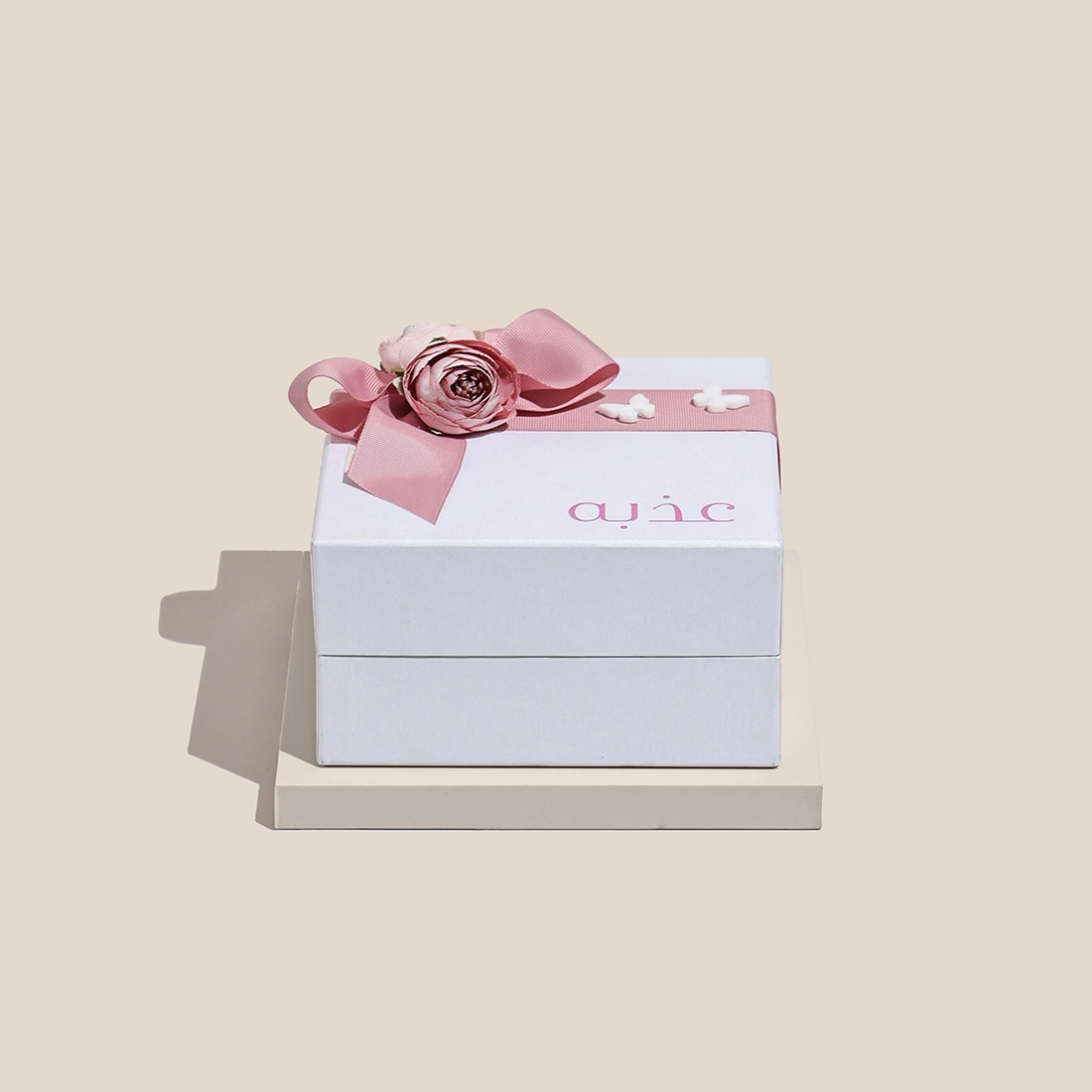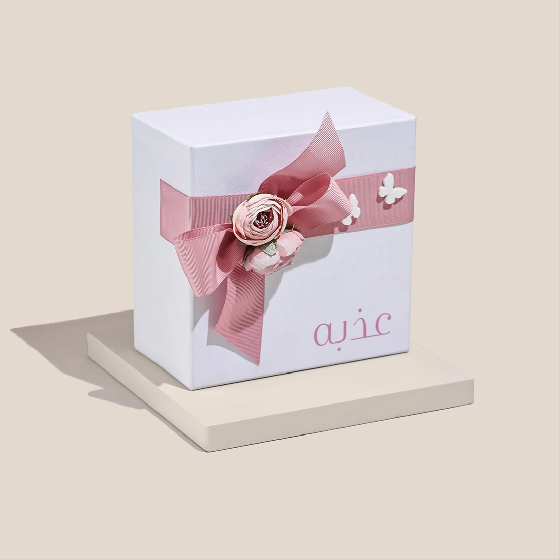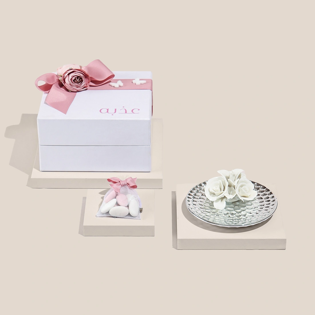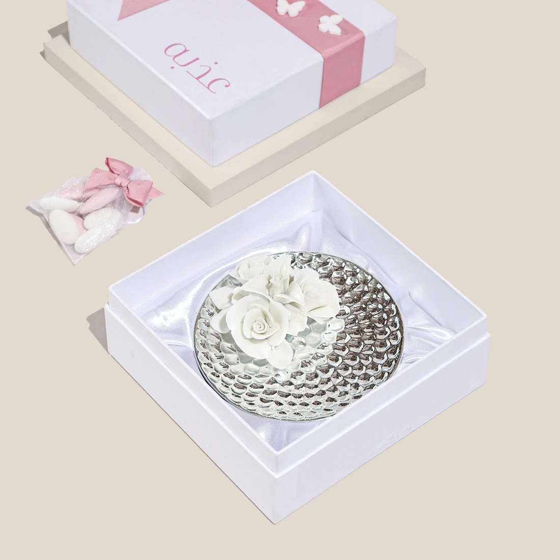 A hand-hammered plate with a ceramic flower and a bag of sugared almonds in a personalized gift box.