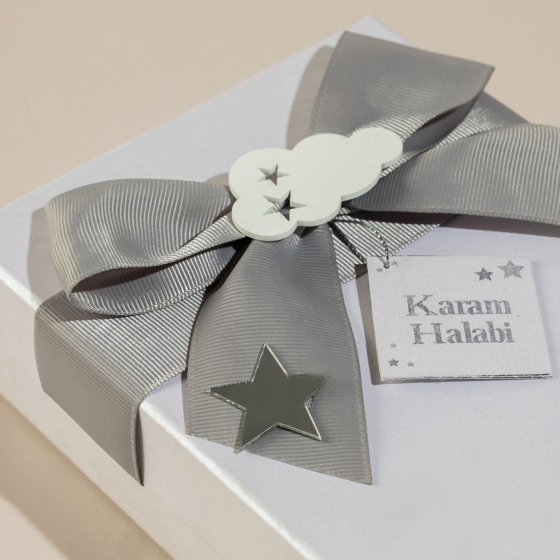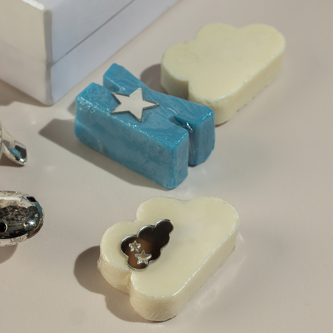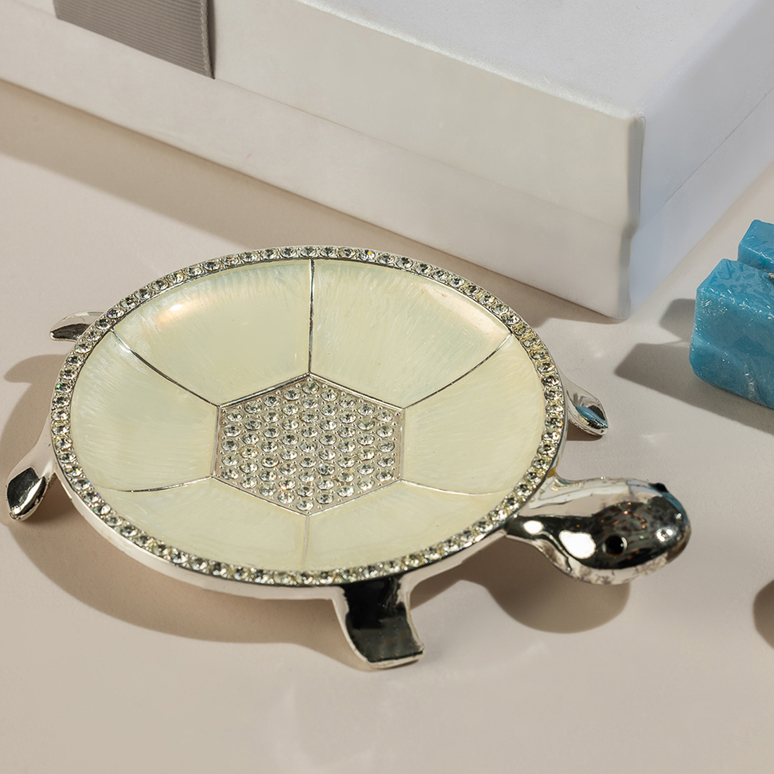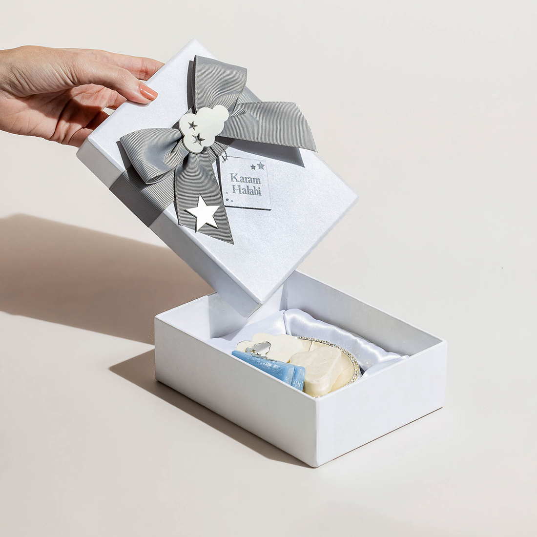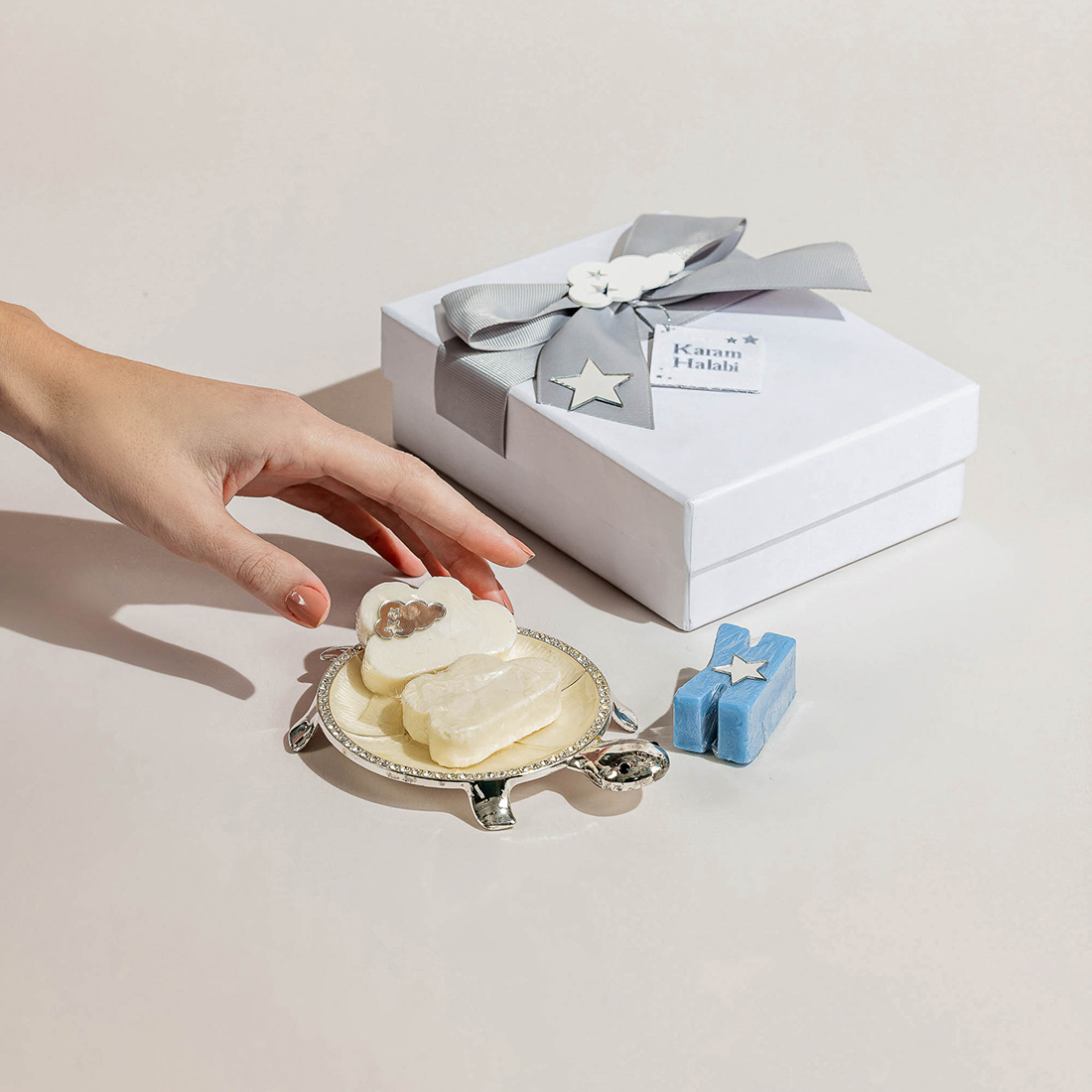 An embellished, turtle-shaped Mother of Pearl plate with the soaps in the form of clouds and the baby’s first initial
