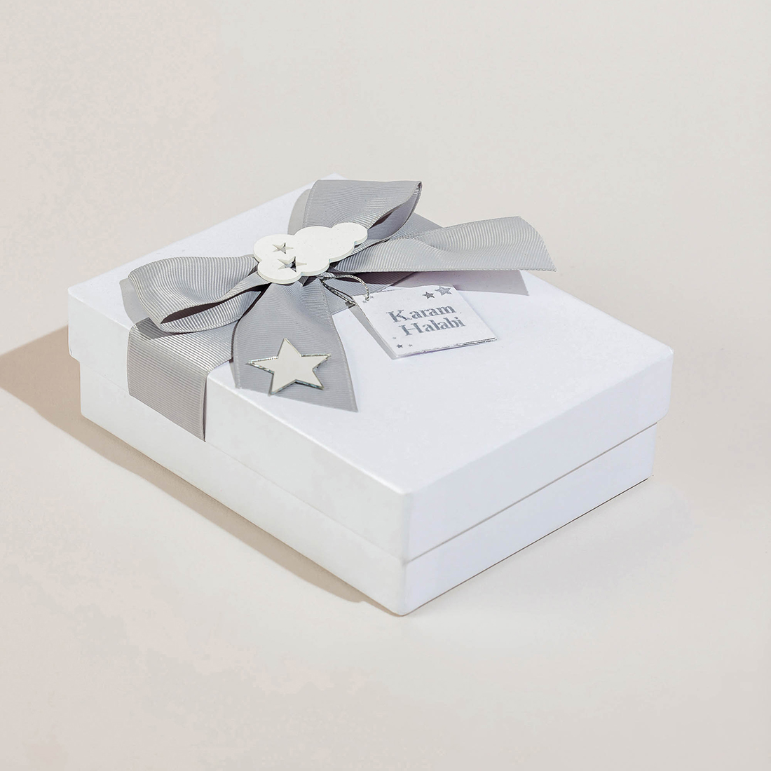 USD40A customized white gift box holding with five personalized chocolate pieces, two acrylic boxes of dragees, and a see-through box of personalized sugared almonds. -