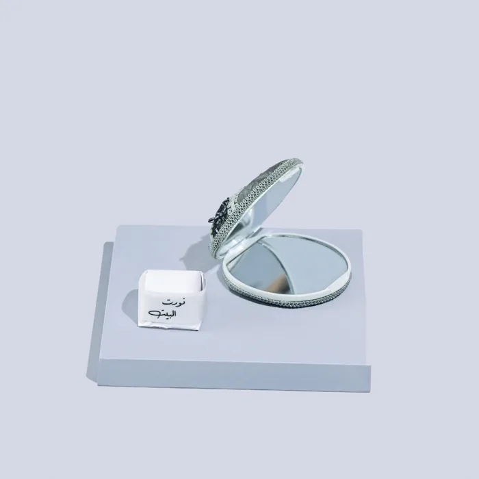 A fabric compact mirror with emboirdery and a personalized chocolate piece.