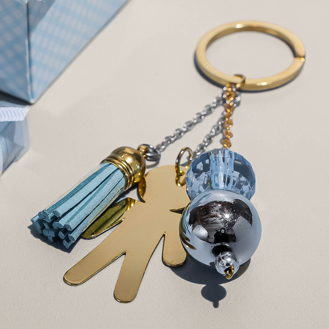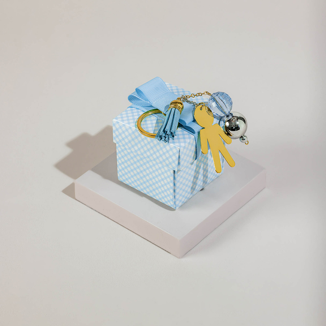 A mini box with a charmed keychain holding two pieces of chocolate and sugared almonds