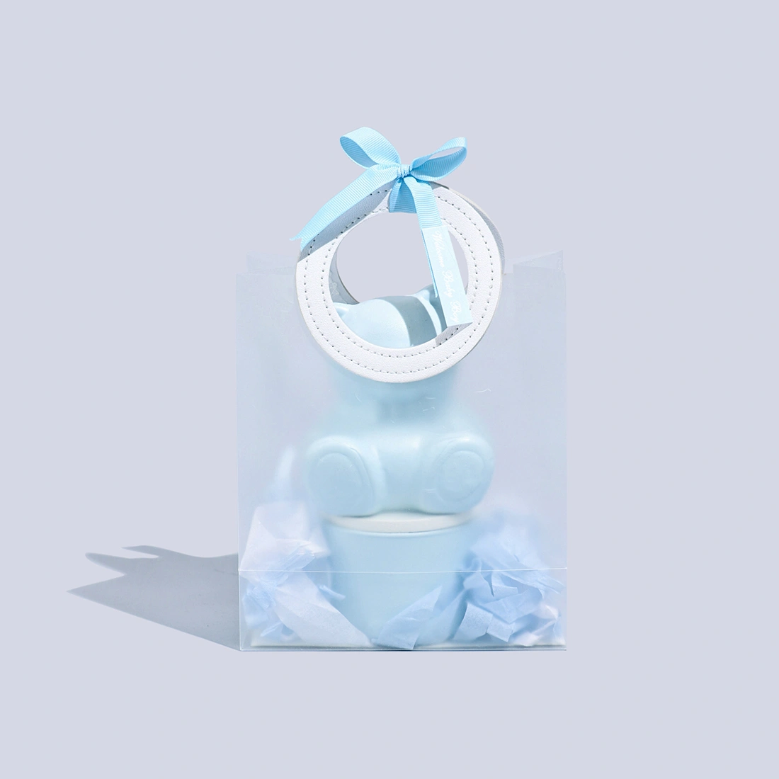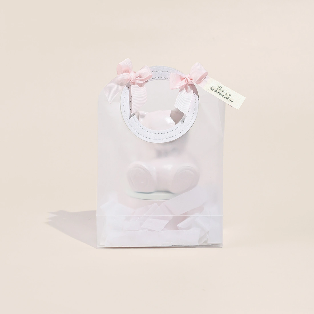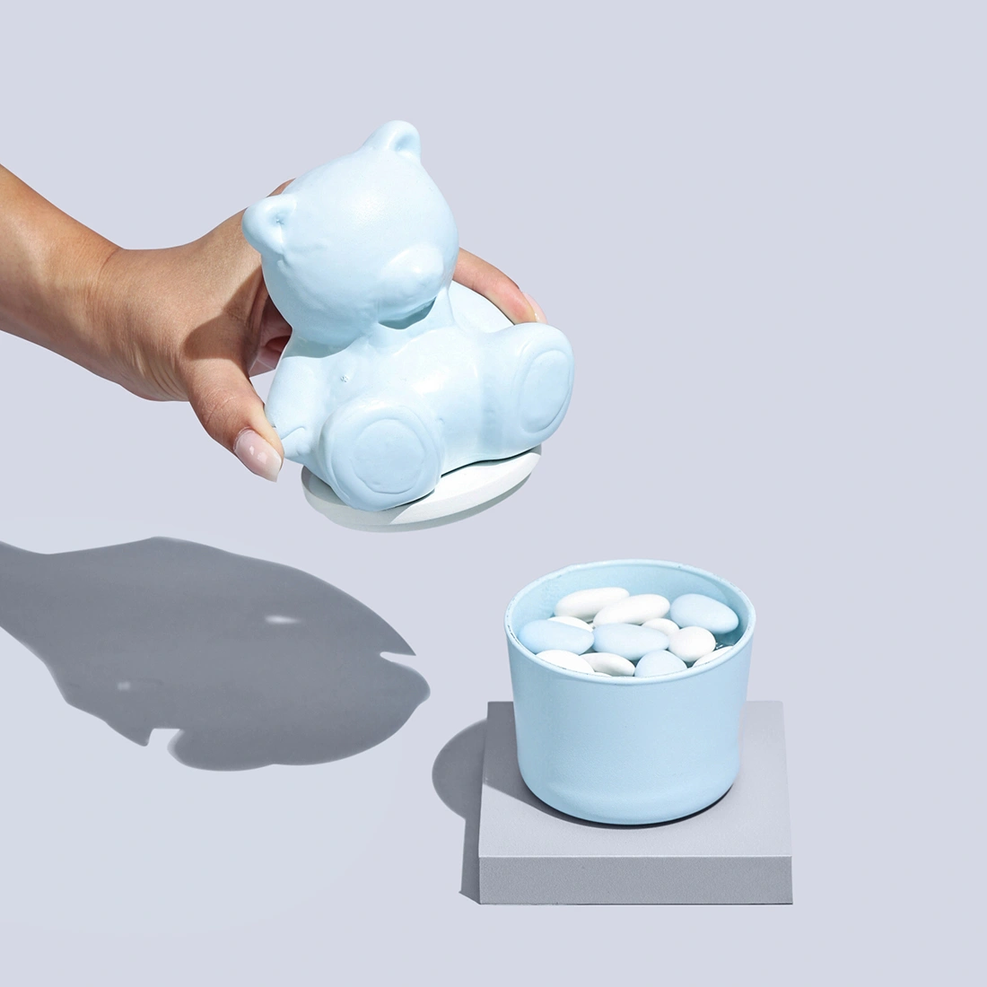 A ceramic bonbonniere with a teddy lid, filled with sugared almonds and placed in a gift bag with leather handles.