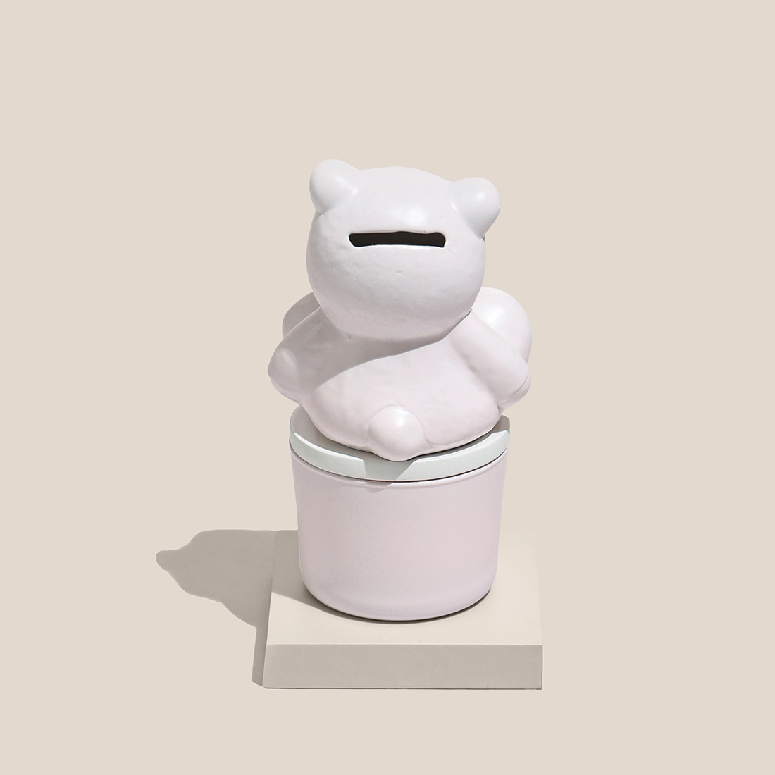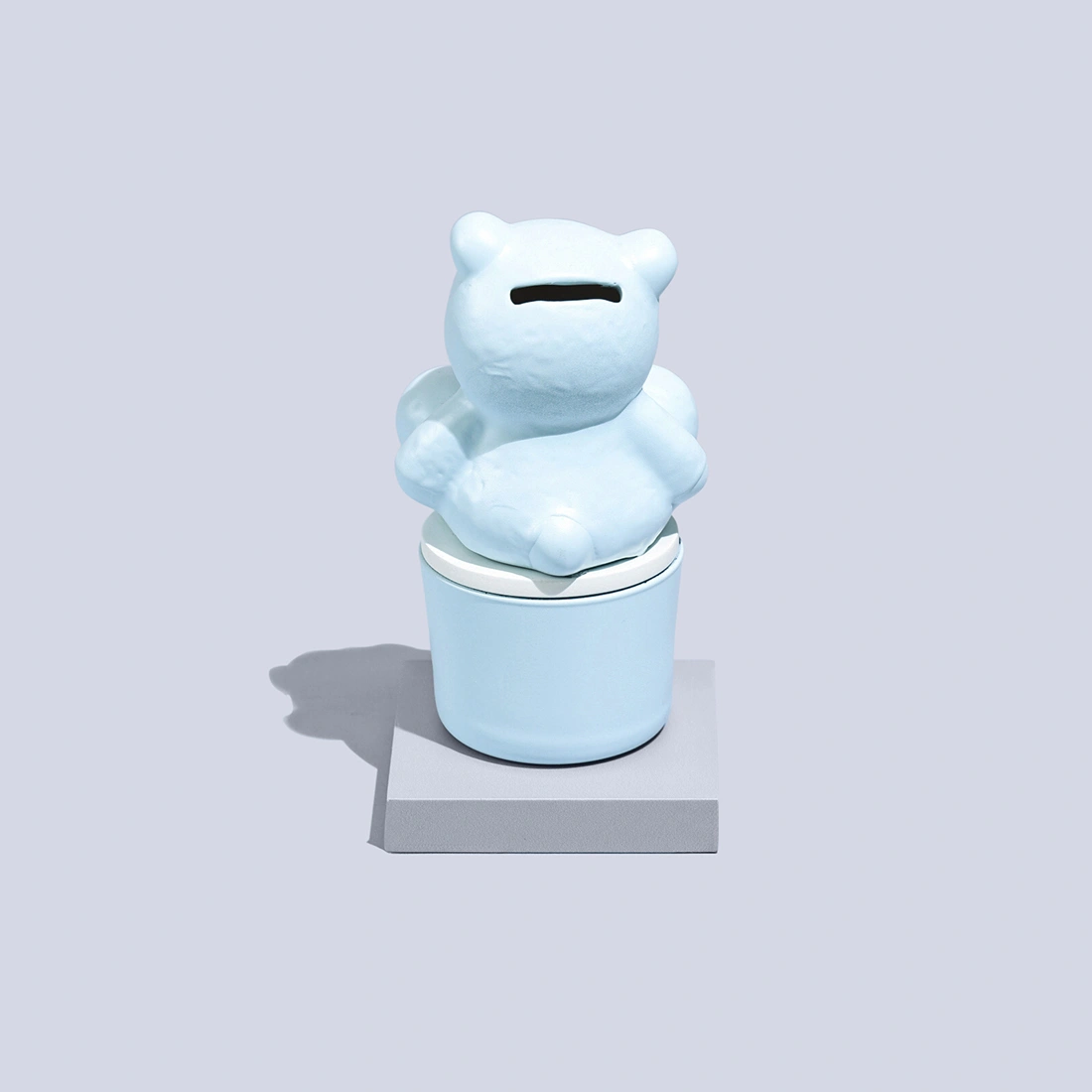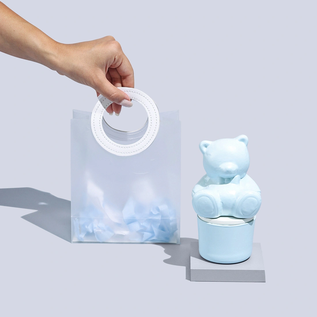 A ceramic bonbonniere with a teddy lid, filled with sugared almonds and placed in a gift bag with leather handles.