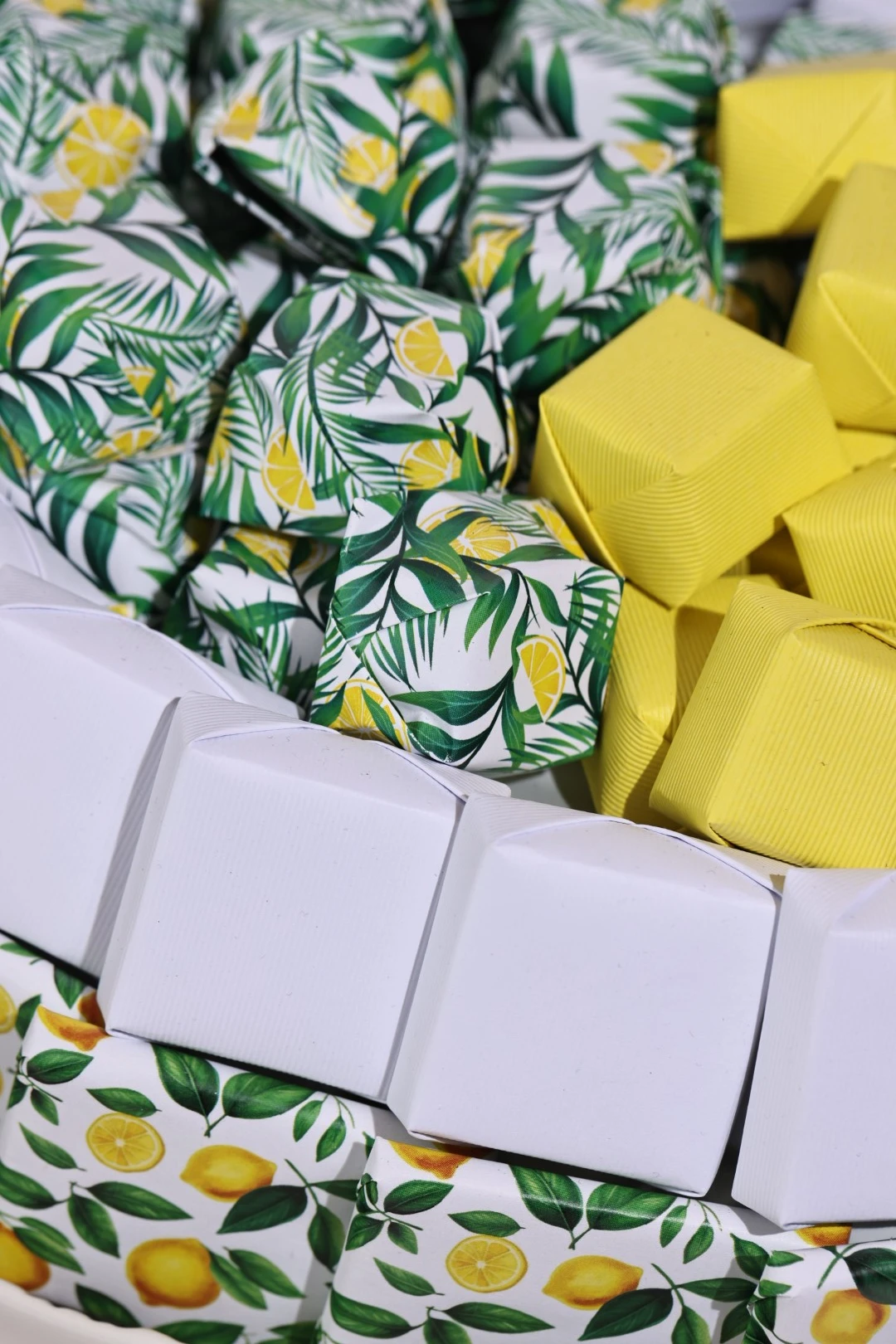 A porcelain bowl with handles, holding 1.3 KG of 100% premium Belgian chocolate, wrapped in a lemon-inspired palette with complimentary tones.