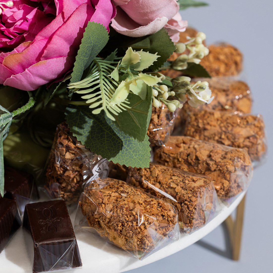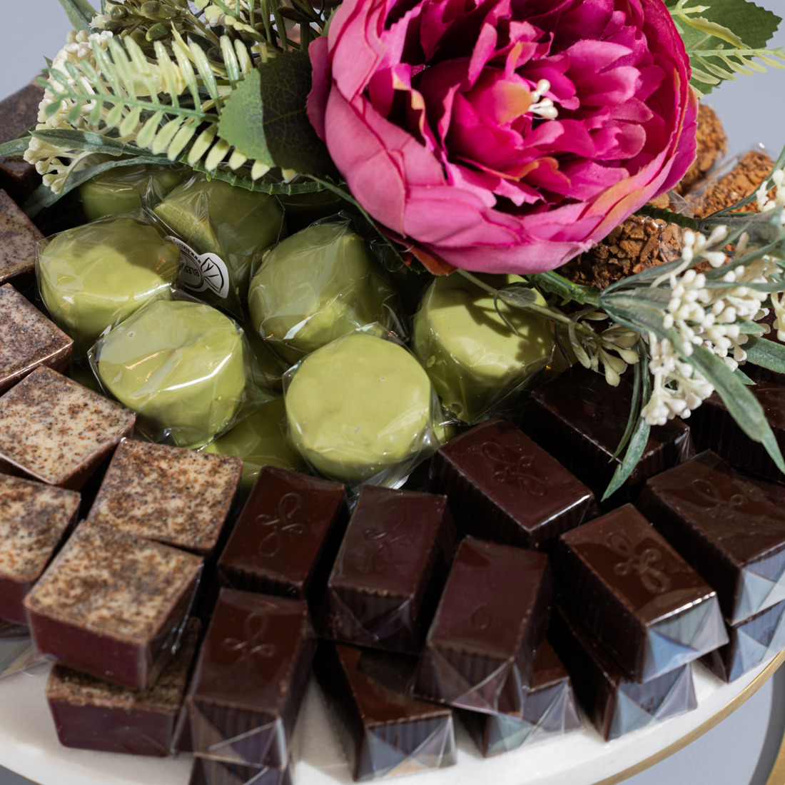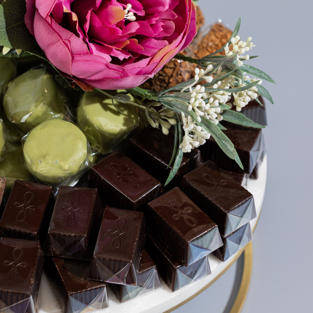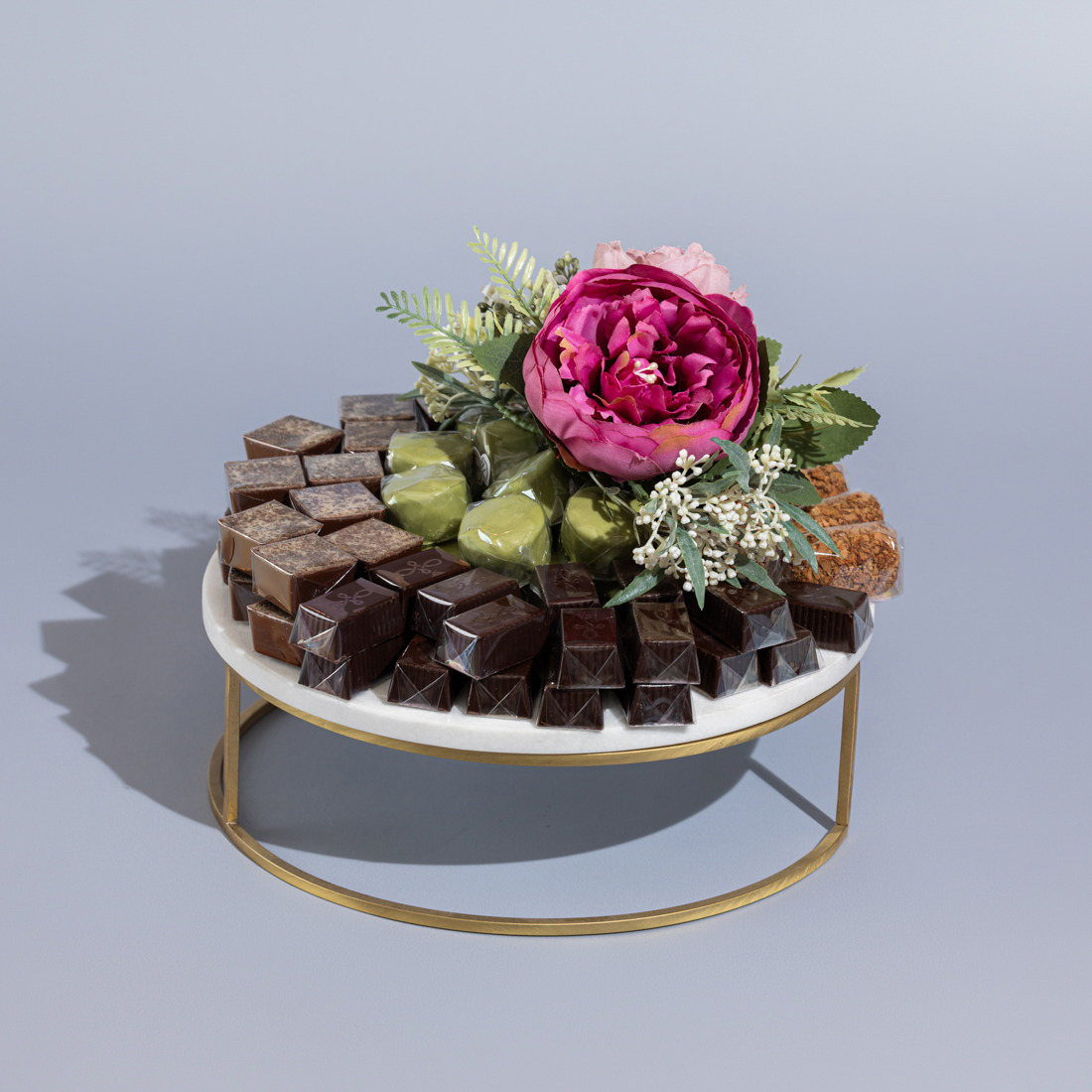 A marble stand holding 1120 grams of 100% premium Belgian chocolate, including: