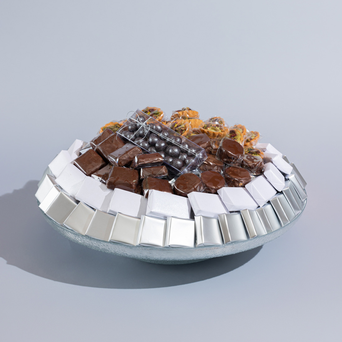 1600g Chocolate Arrangement in a Colored Glass Bowl