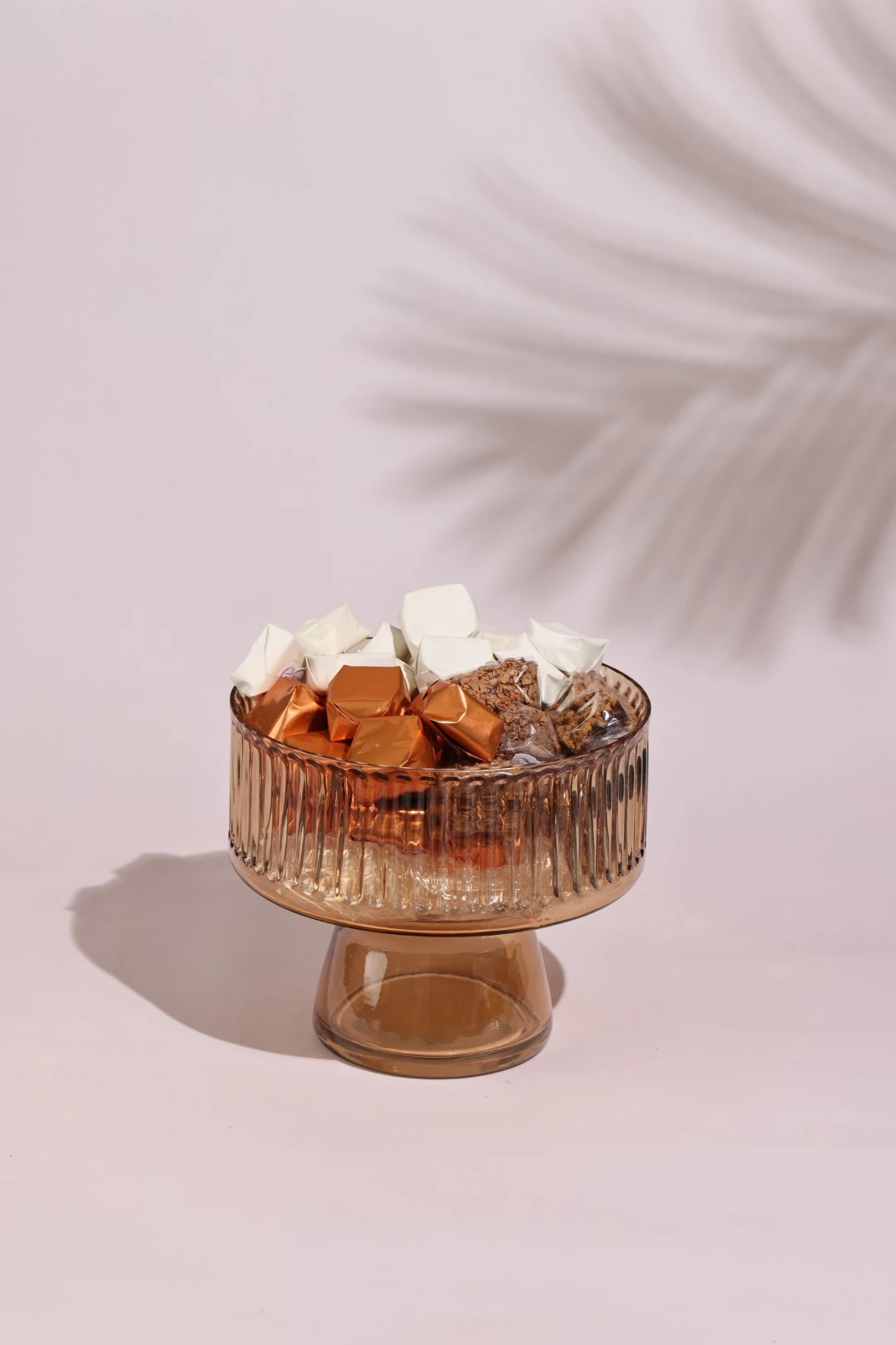 An orange glass footed bowl holding 1000 grams of 100% premium Belgian chocolate, wrapped in clear, beige and metallic bronze.