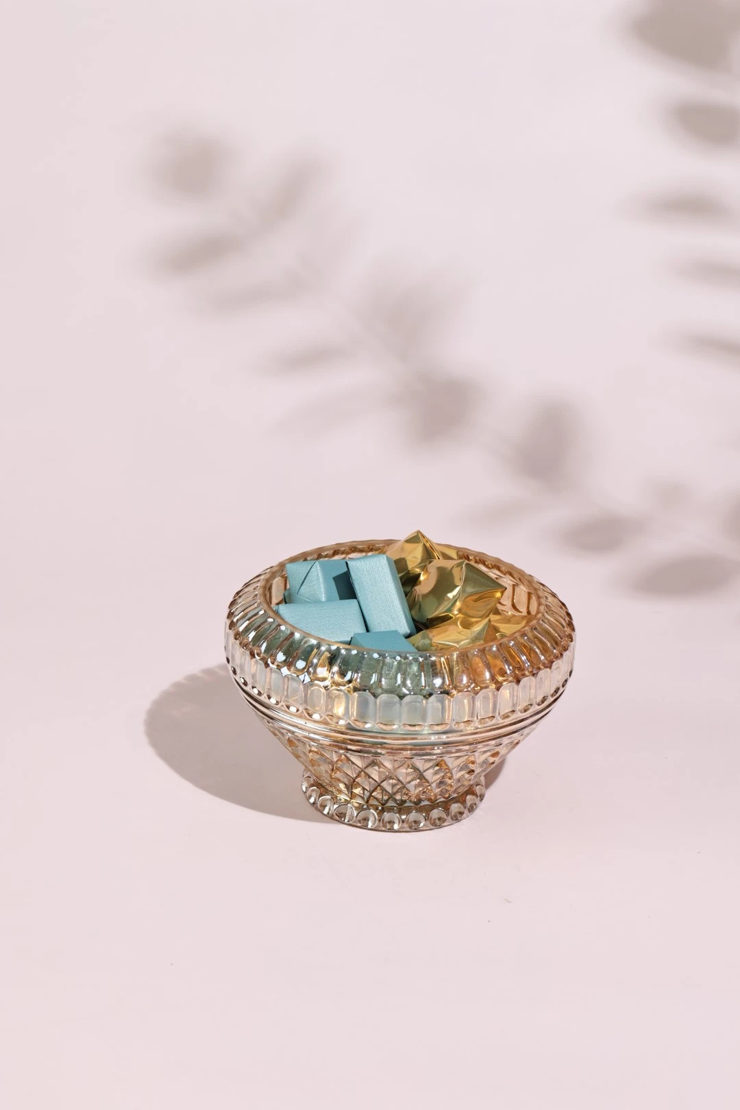 A glass bowl holding 400 grams of 100% premium Belgian chocolate wrapped in gold and blue.