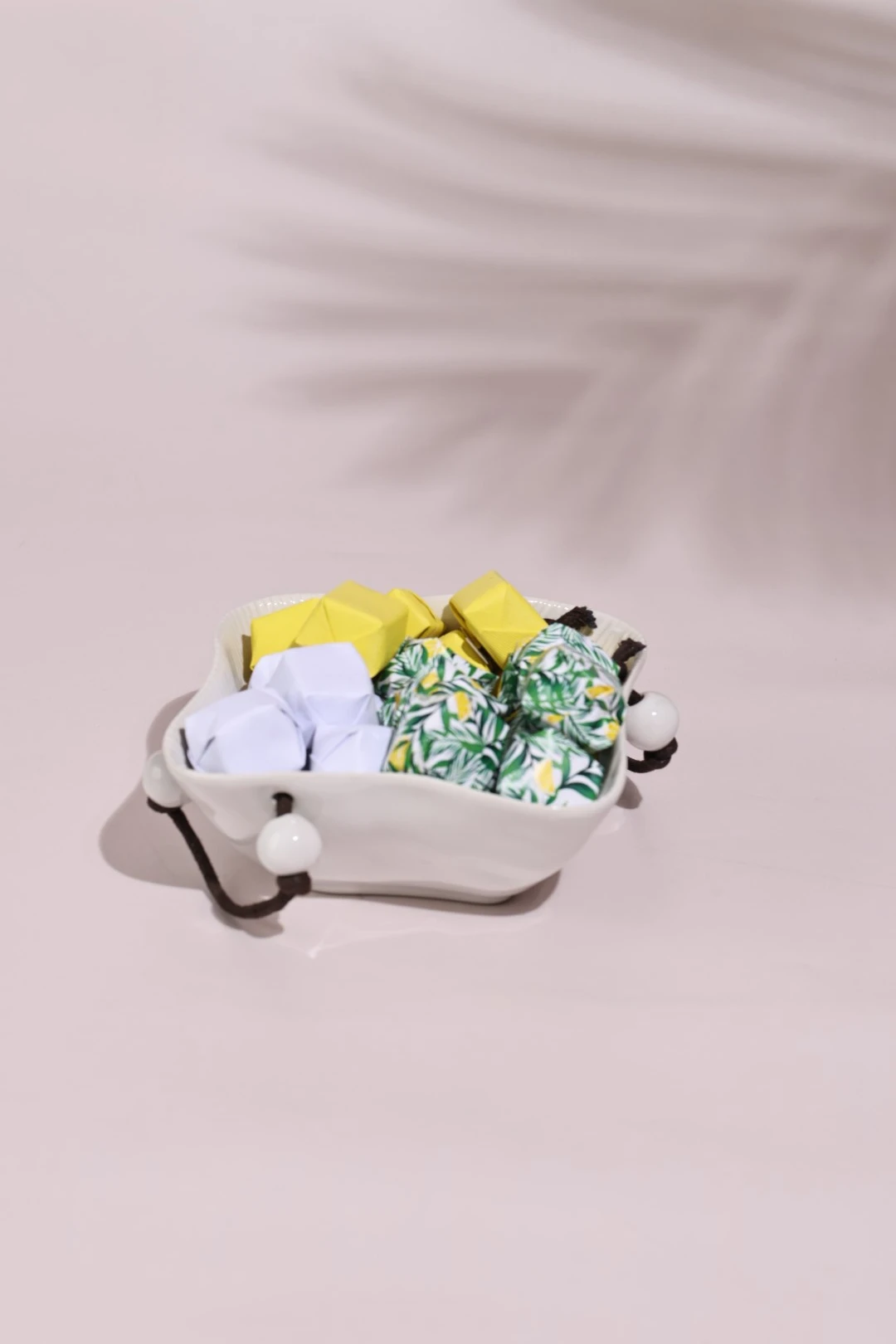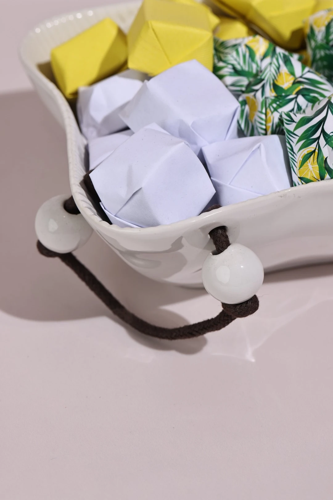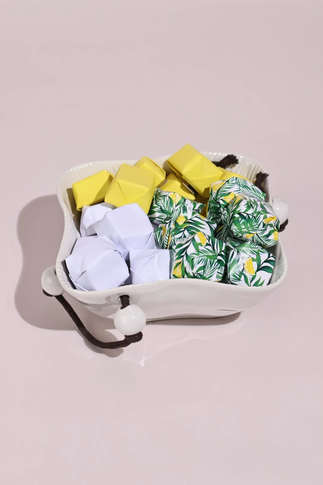 A porcelain plate with handles, holding 500 grams of 100% premium Belgian chocolate, wrapped in a lemon-inspired palette with complimentary tones.