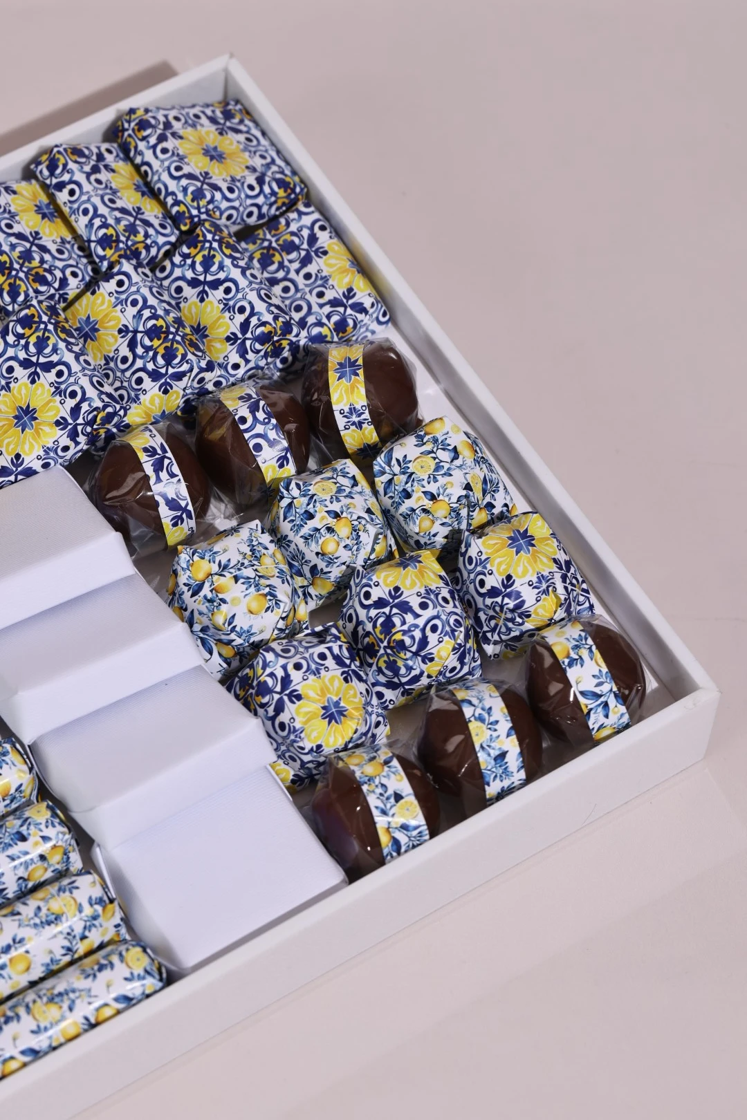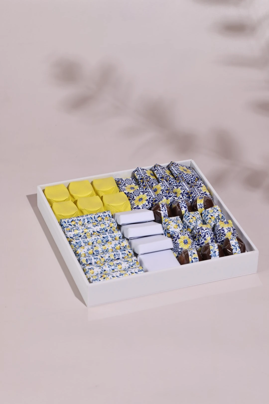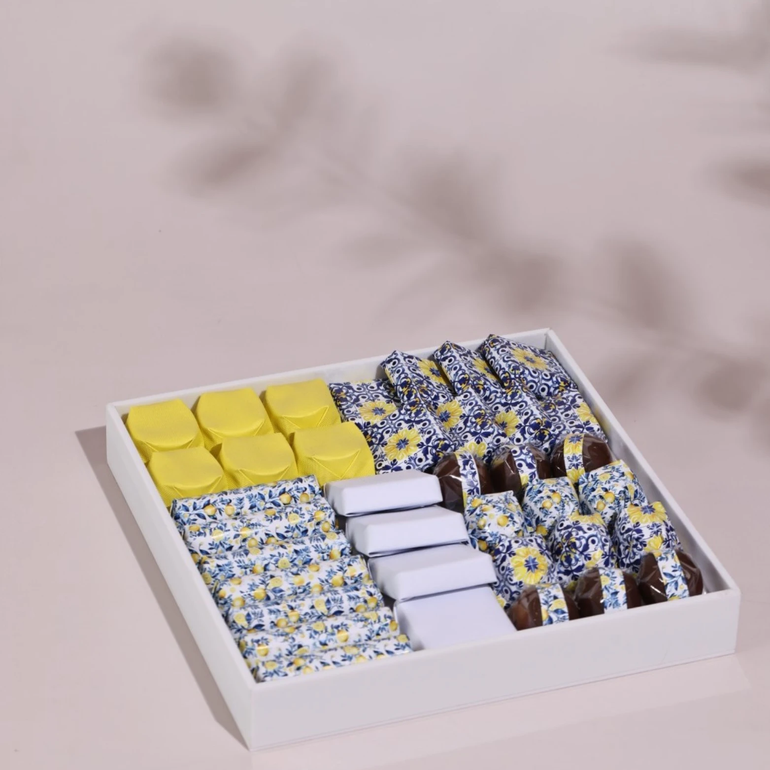 A white, wooden tray holding 800 grams of 100% premium Belgian chocolate, wrapped in a lemon-inspired palette with complimentary tones.