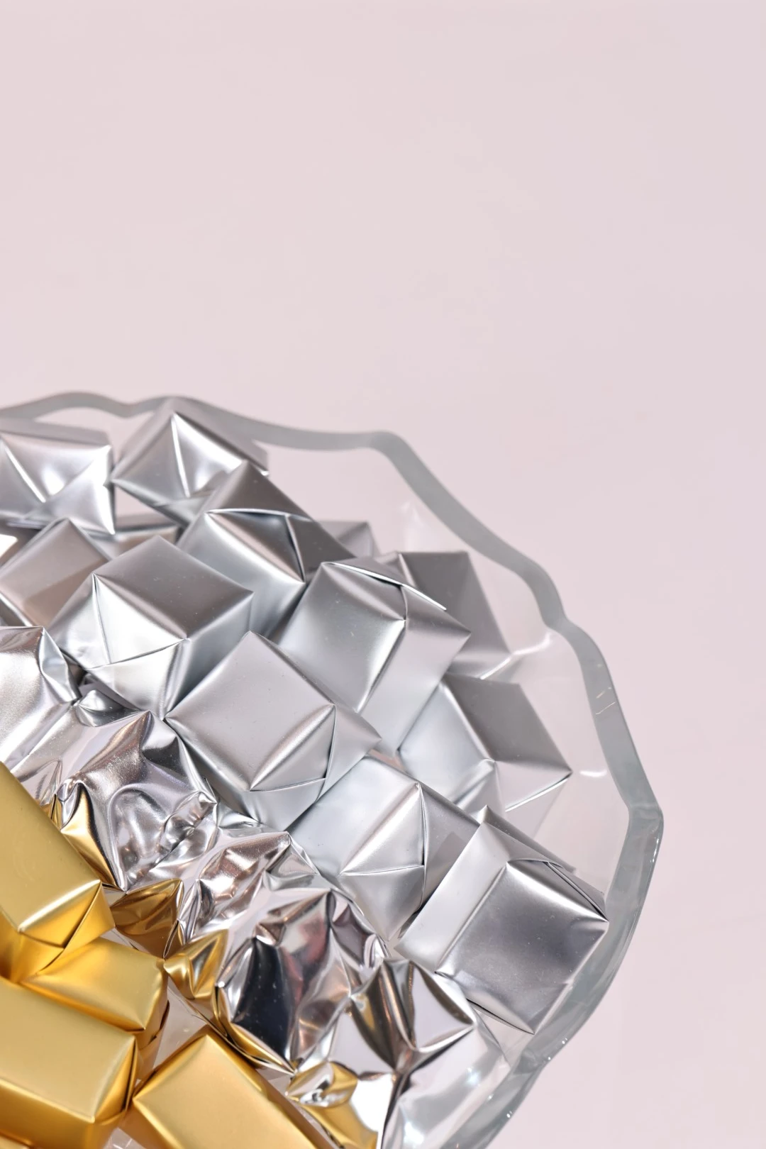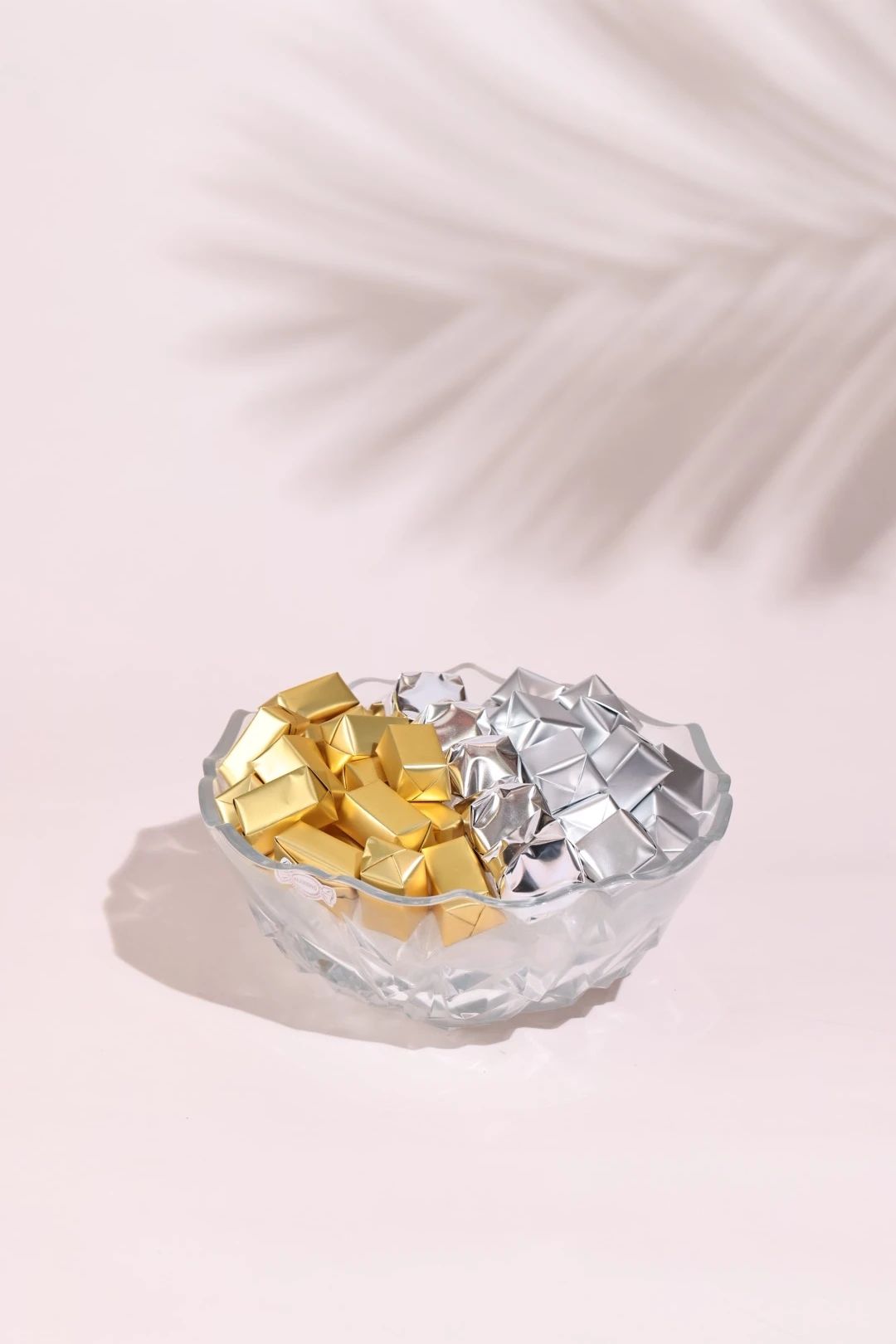 USD125An extravagant glass bowl, holding 1 KG of 100% premium Belgian chocolate wrapped in metallic tones. -
