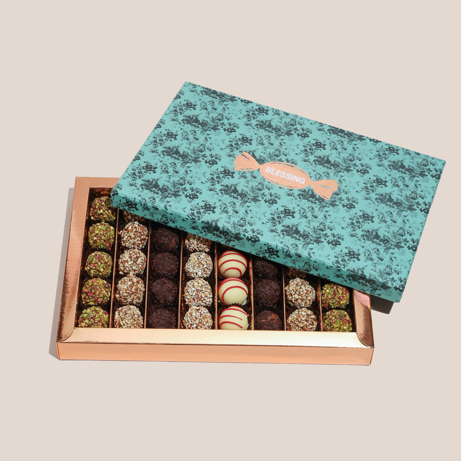 An assorted box holding 40 pieces of 100% premium Belgian milk and white chocolate truffles.