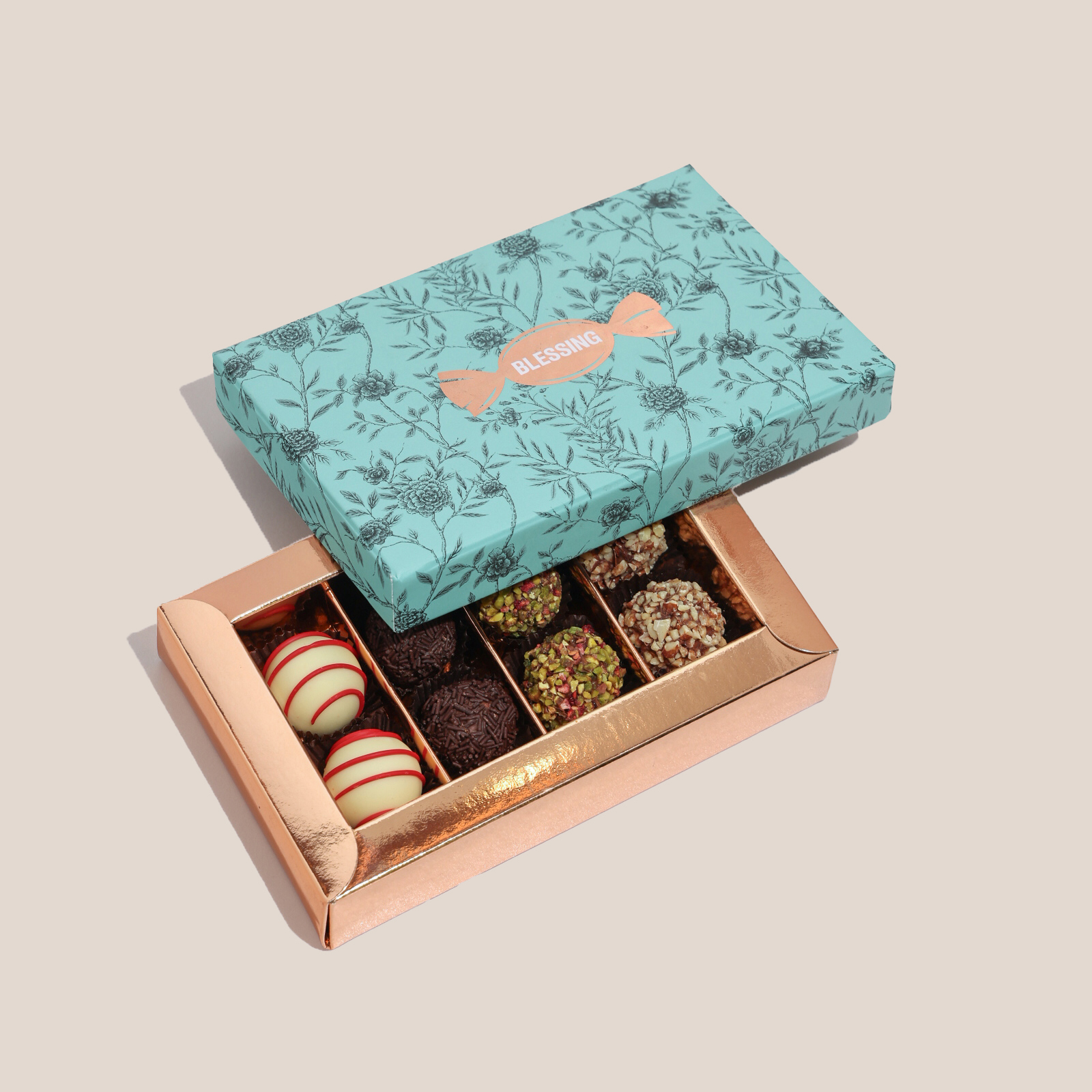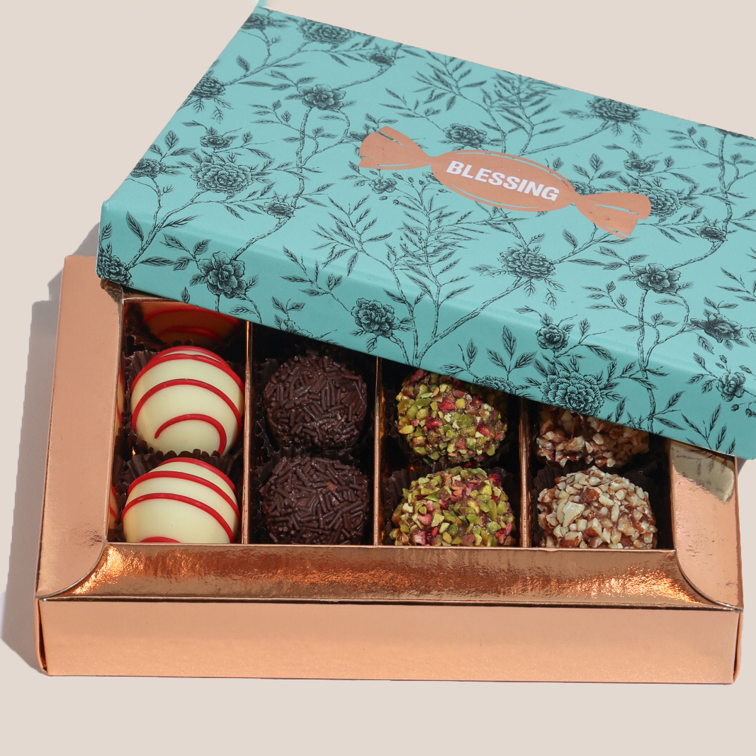 An assorted box holding 8 pieces of 100% premium Belgian milk and white chocolate truffles.