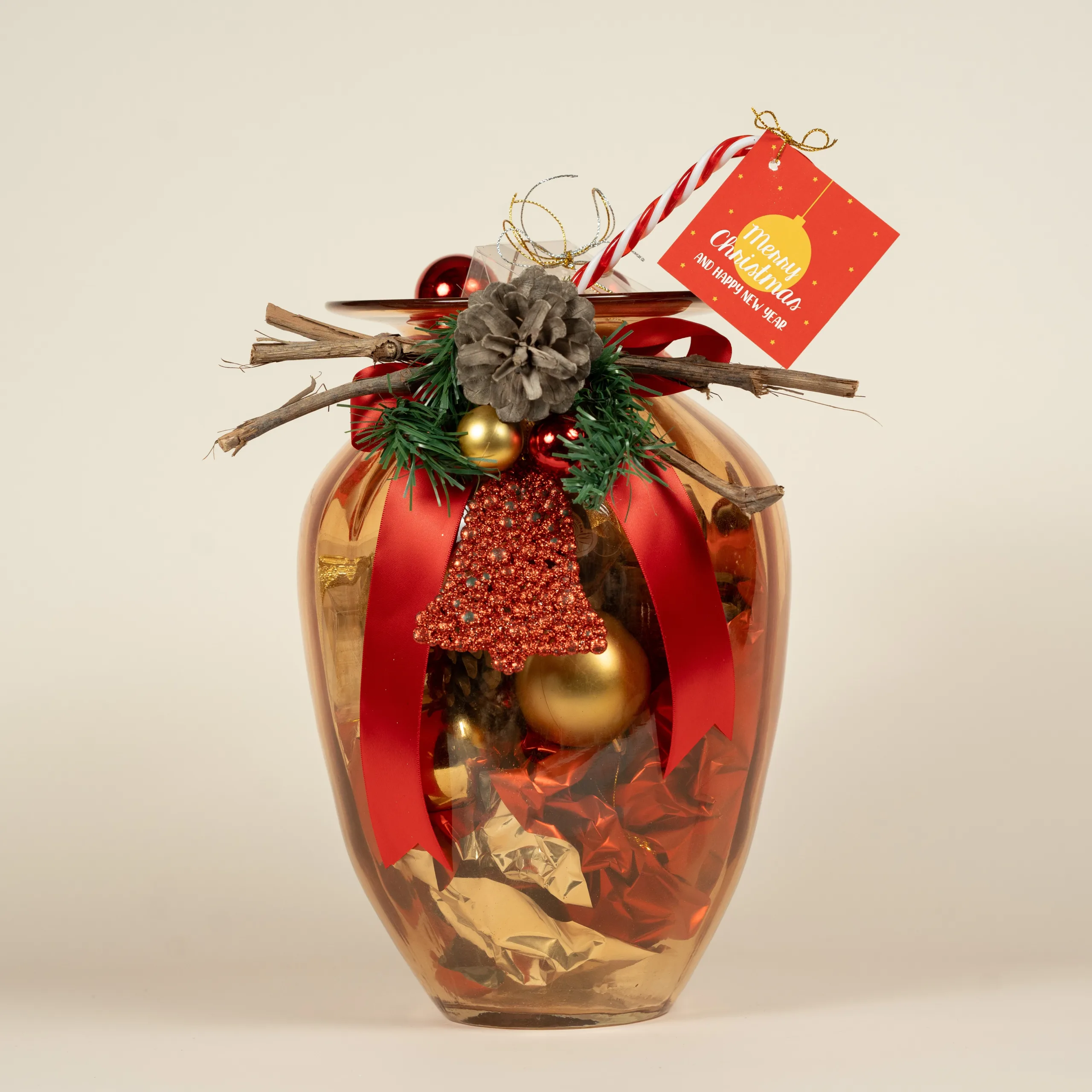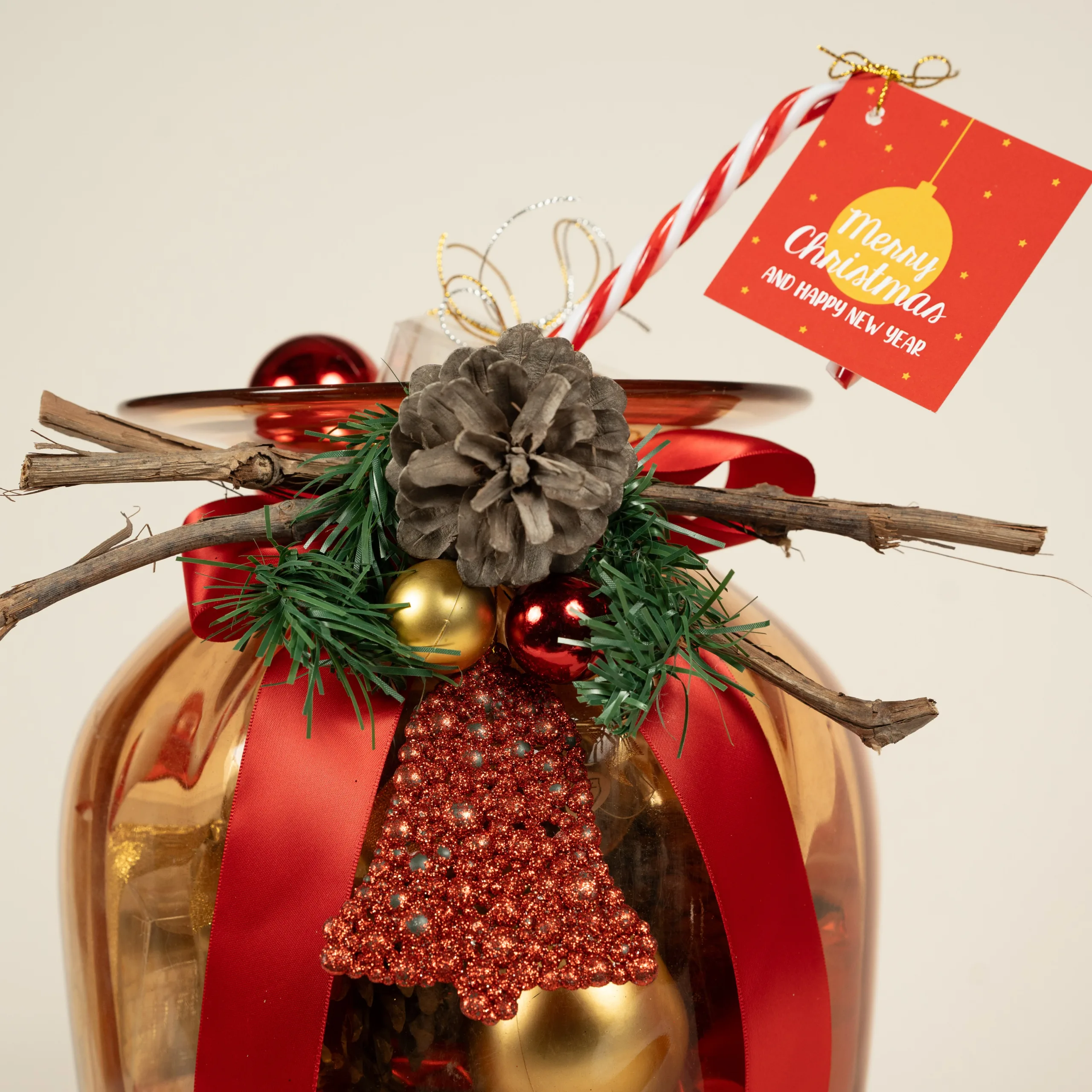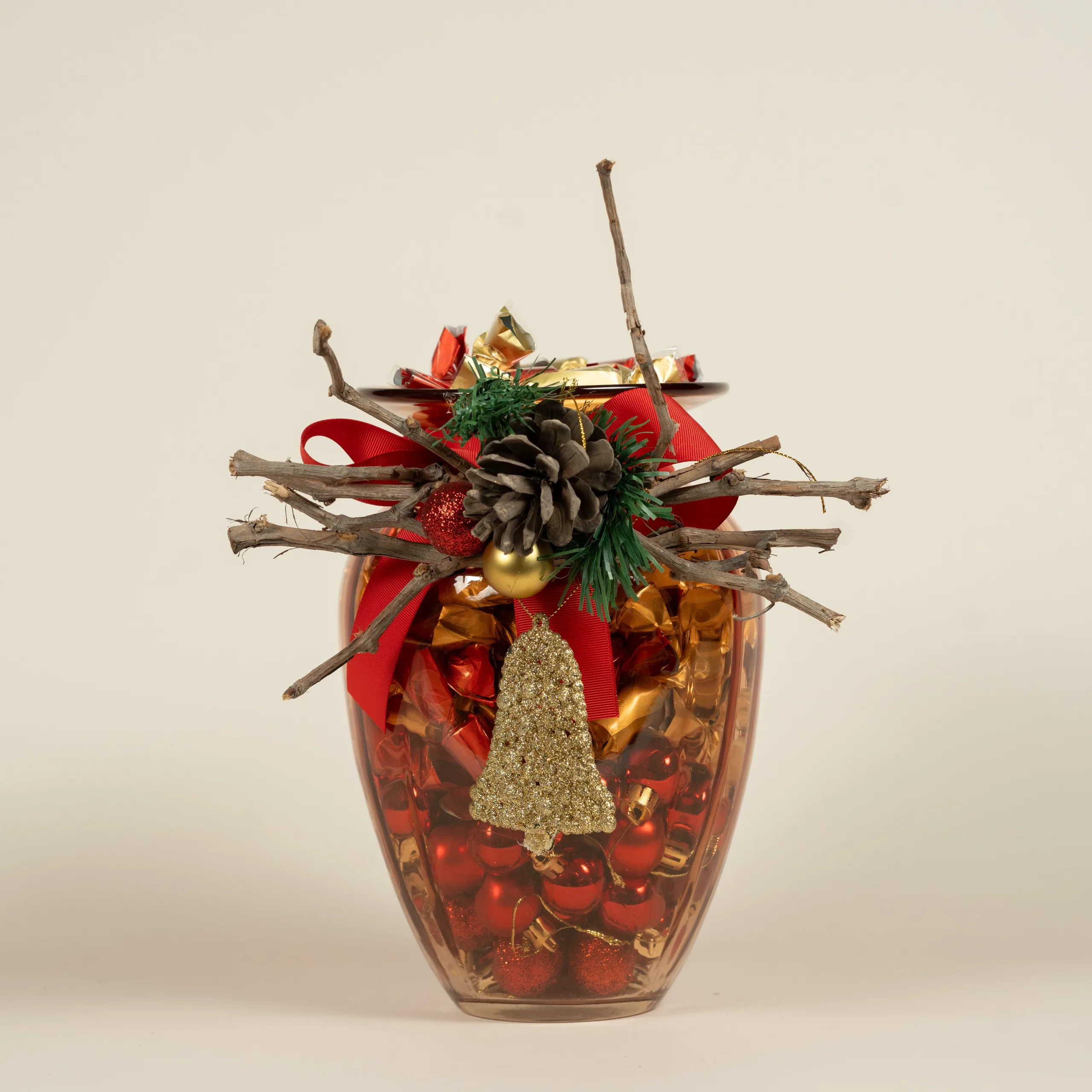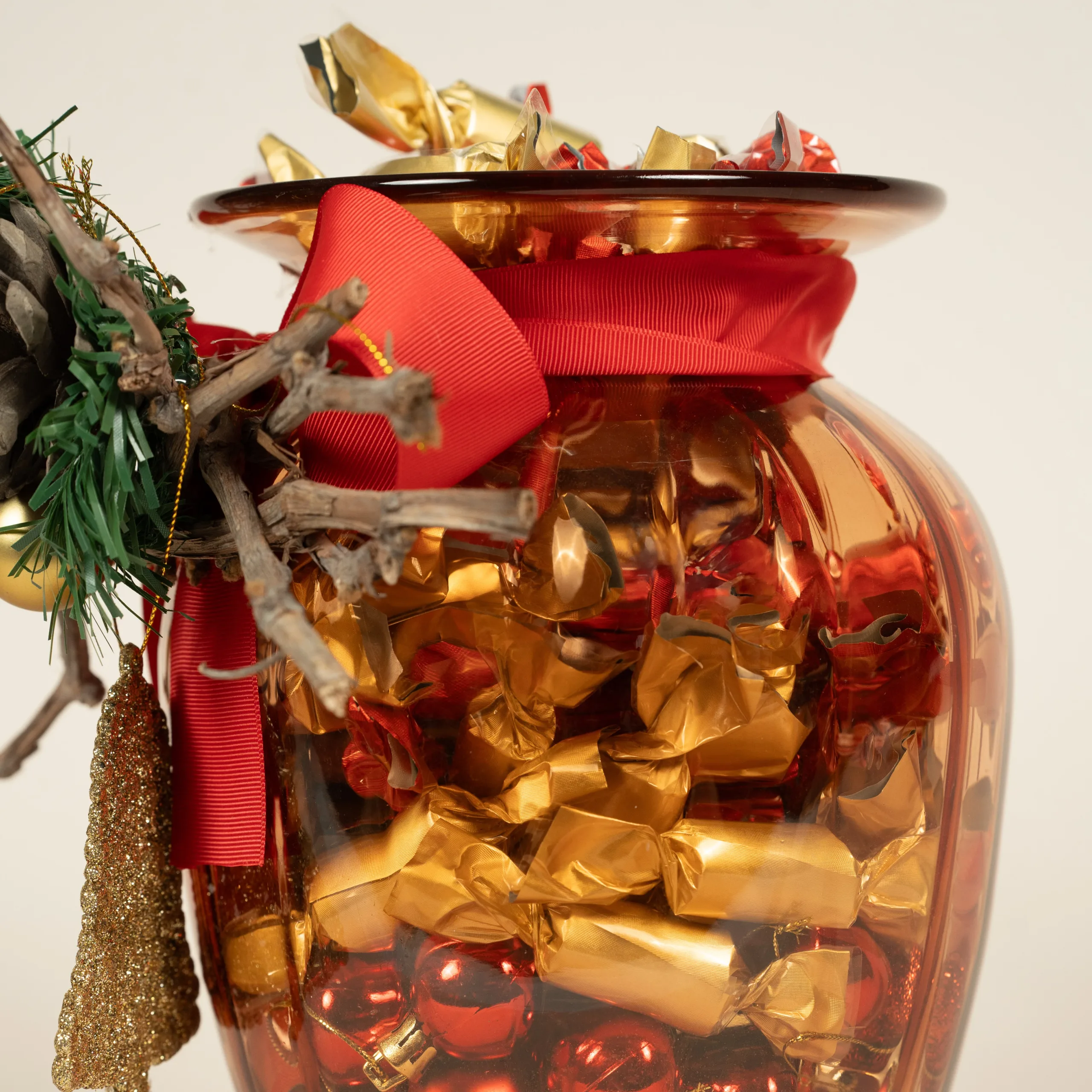 A festive golden glass vase filled with 100% premium Belgian chocolate and decorated with Christmas accents.
