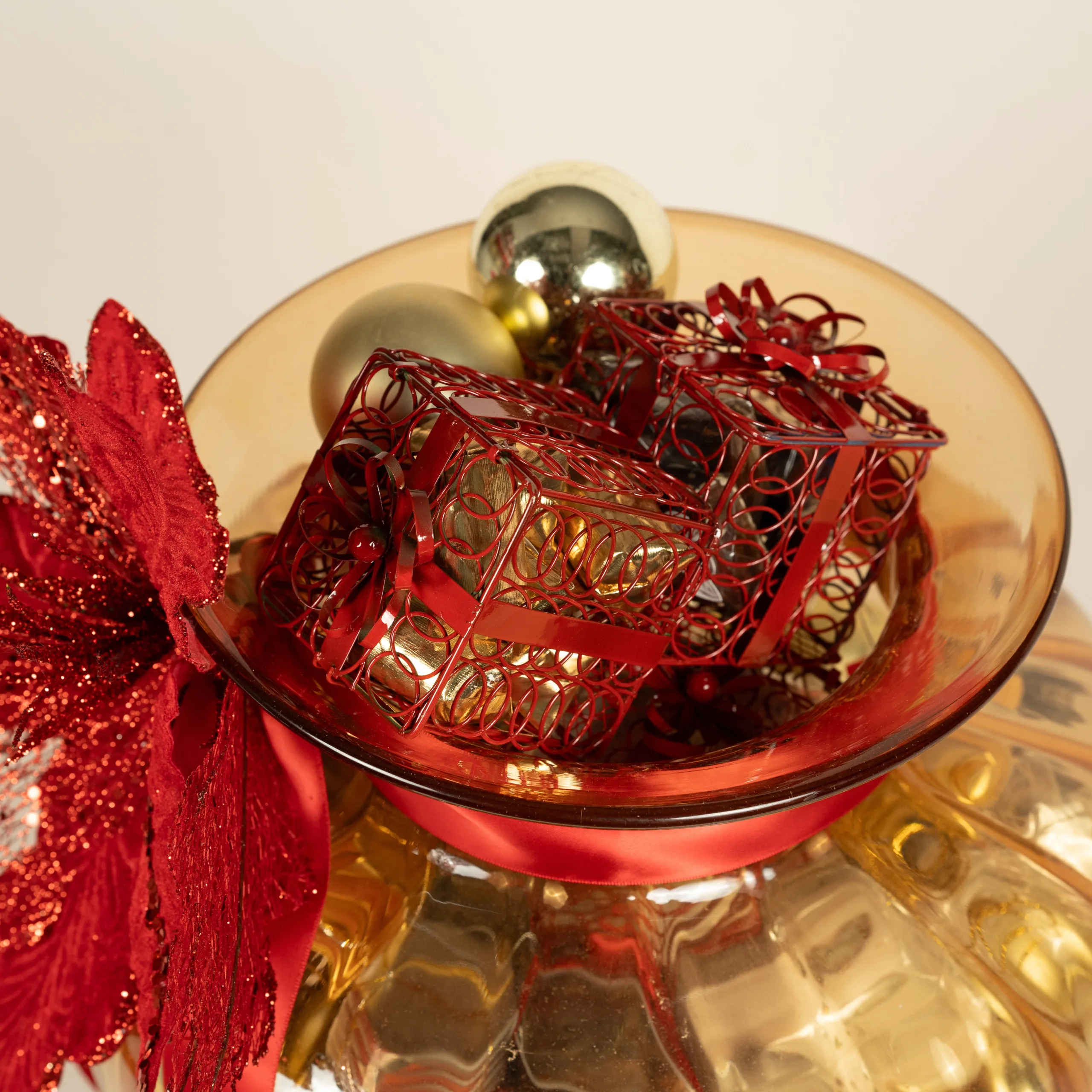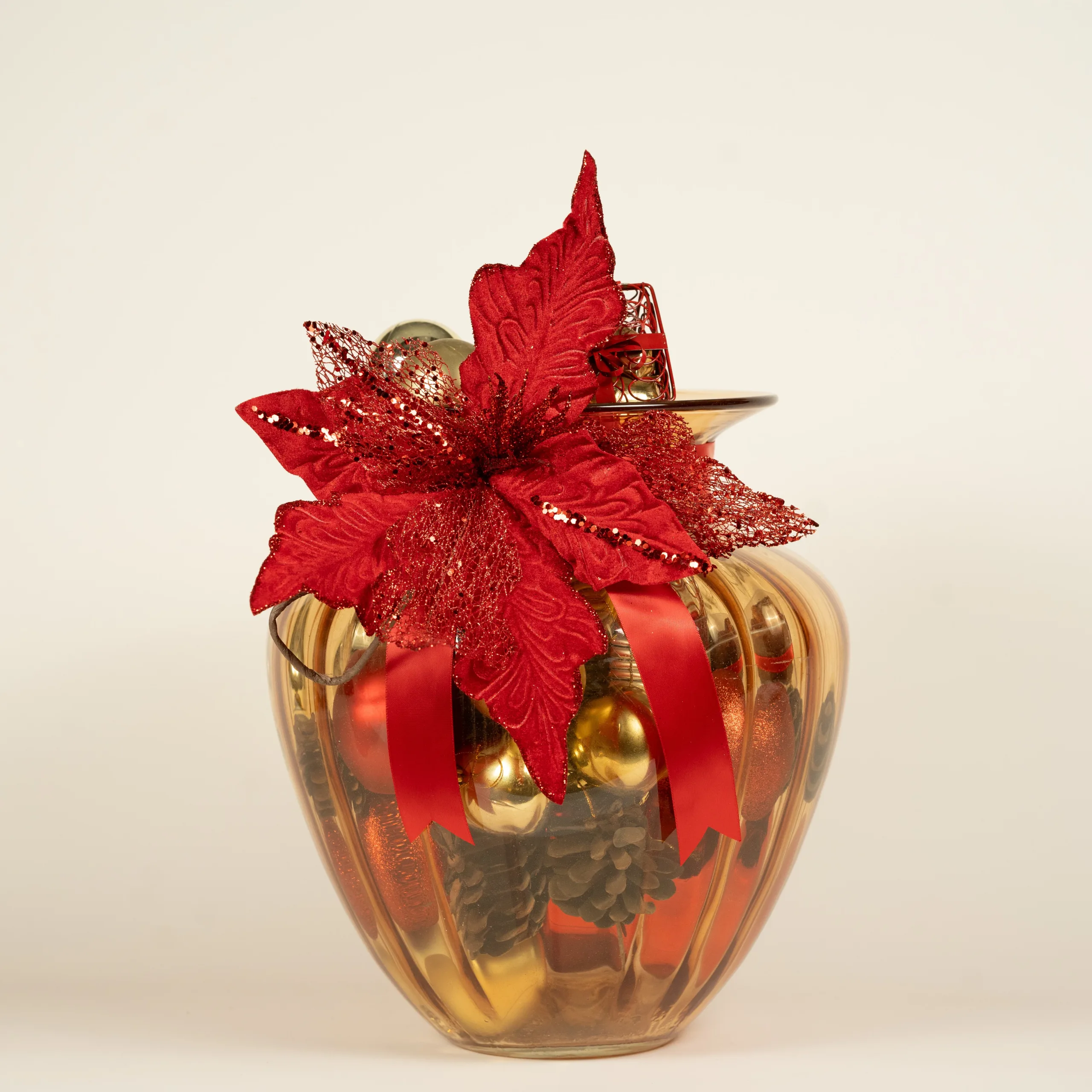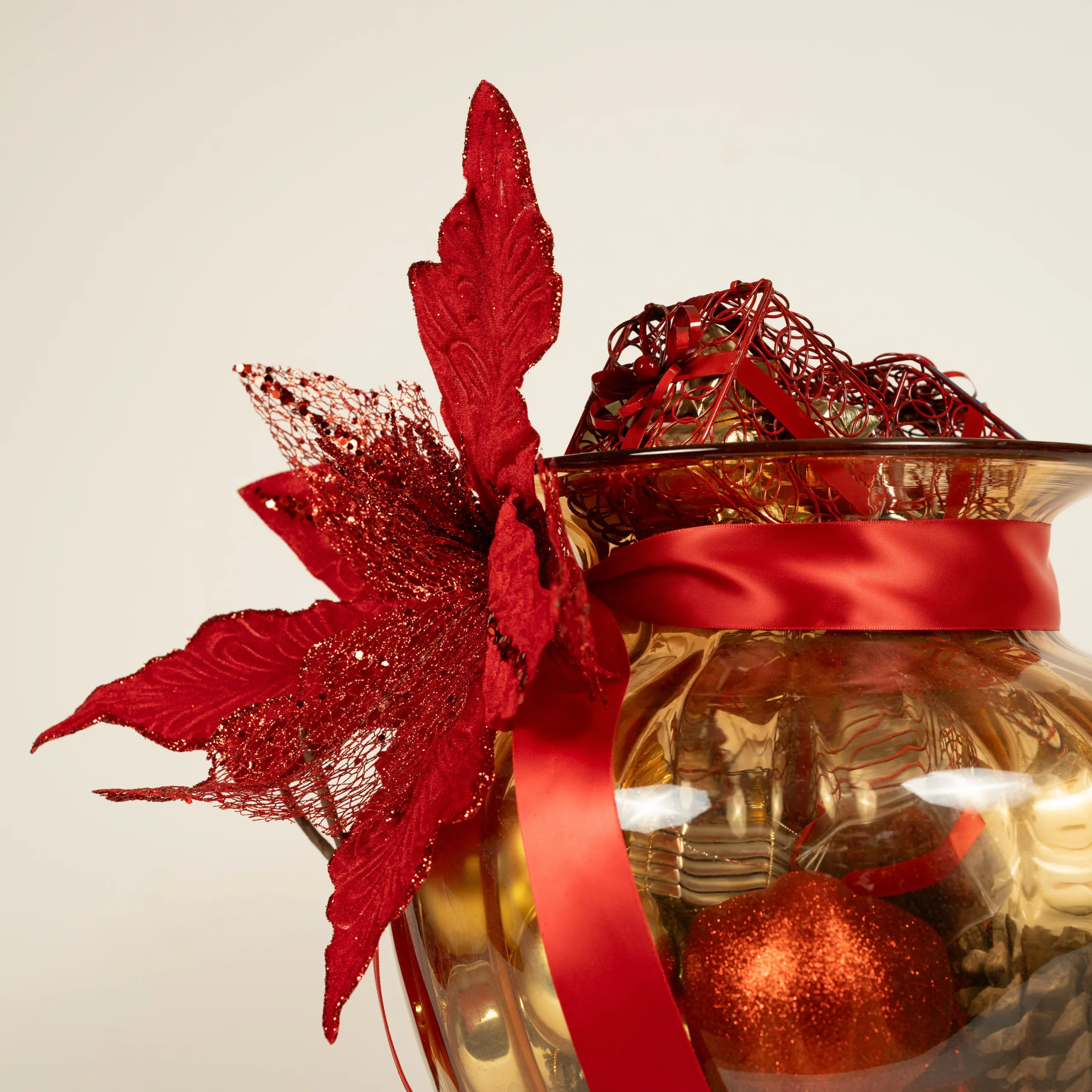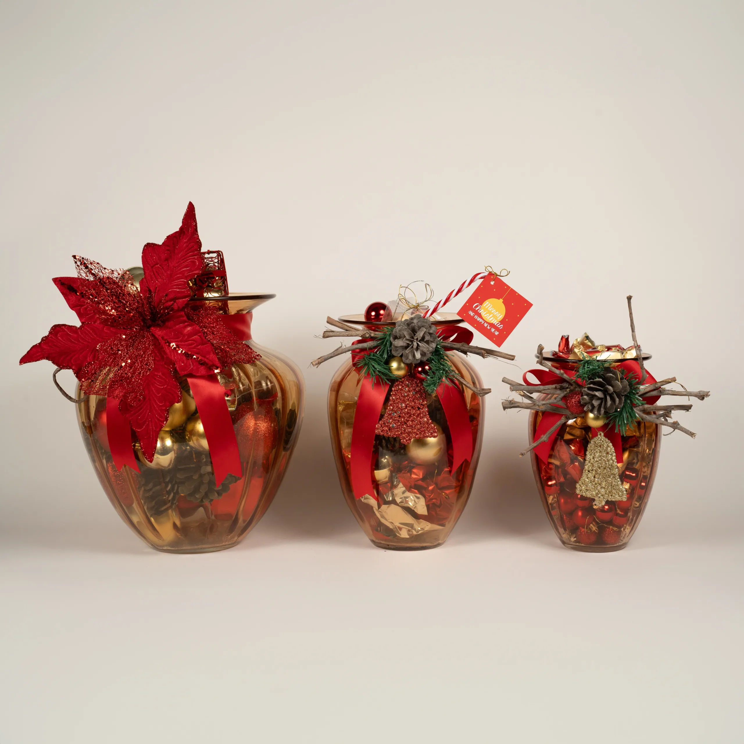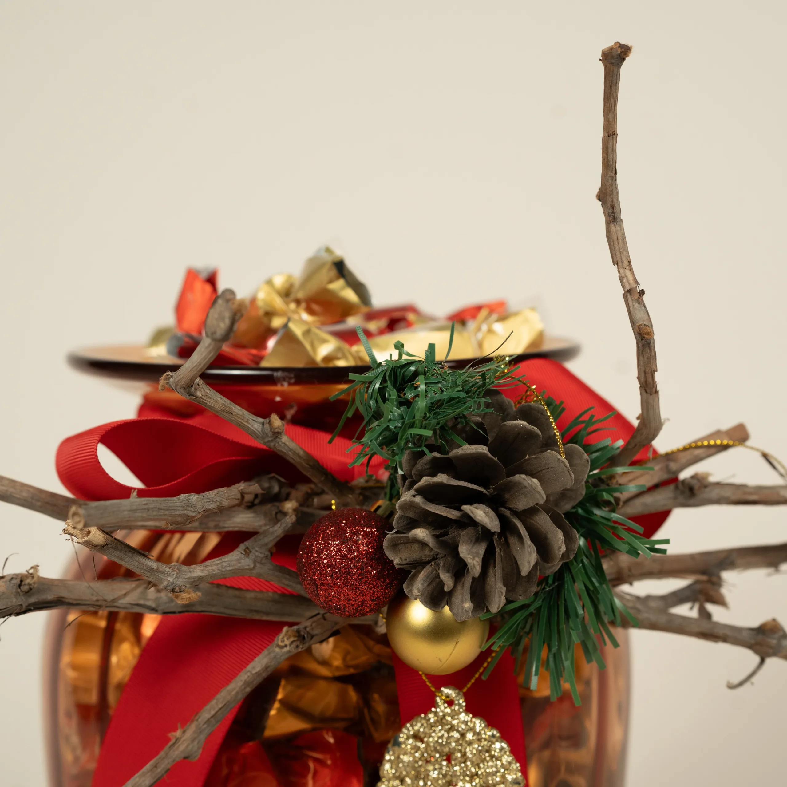A festive golden glass vase filled with 100% premium Belgian chocolate and decorated with Christmas accents.