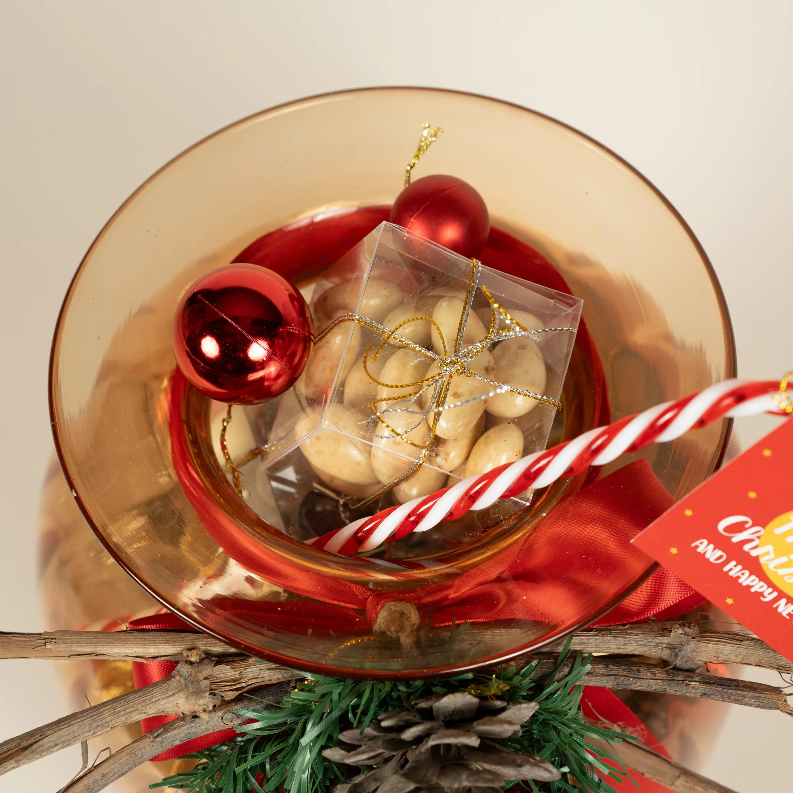 USD30A tall decorative glass filled with 280g of 100% premium Blegian chocolate and decorated with festive Christmas accents, perfect as a holiday centerpiece. -