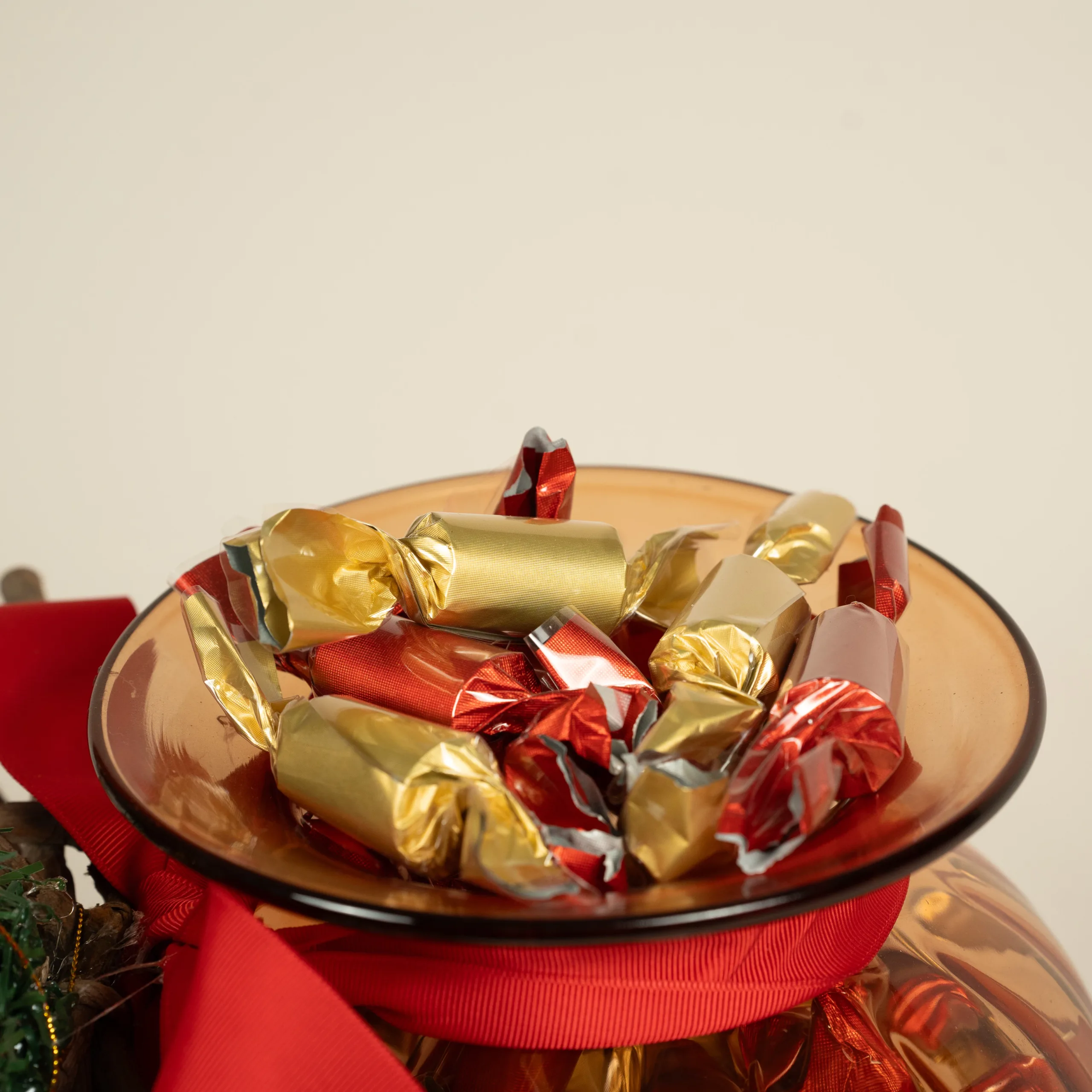 USD110A festive glass platter filled with 1.1 KG of 100% premium Belgian chocolate, complemented by Christmas decorations, perfect for holiday celebrations.
