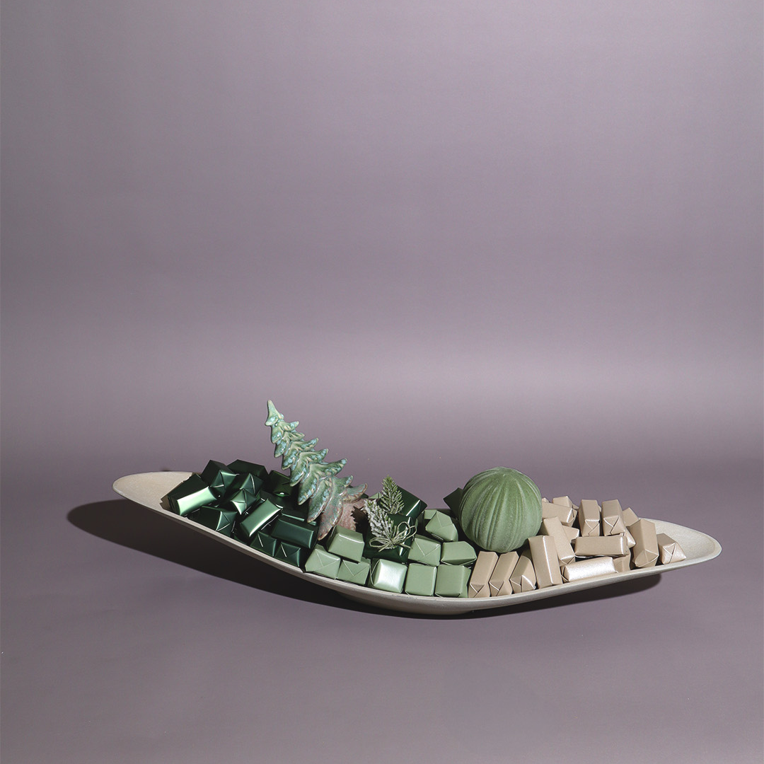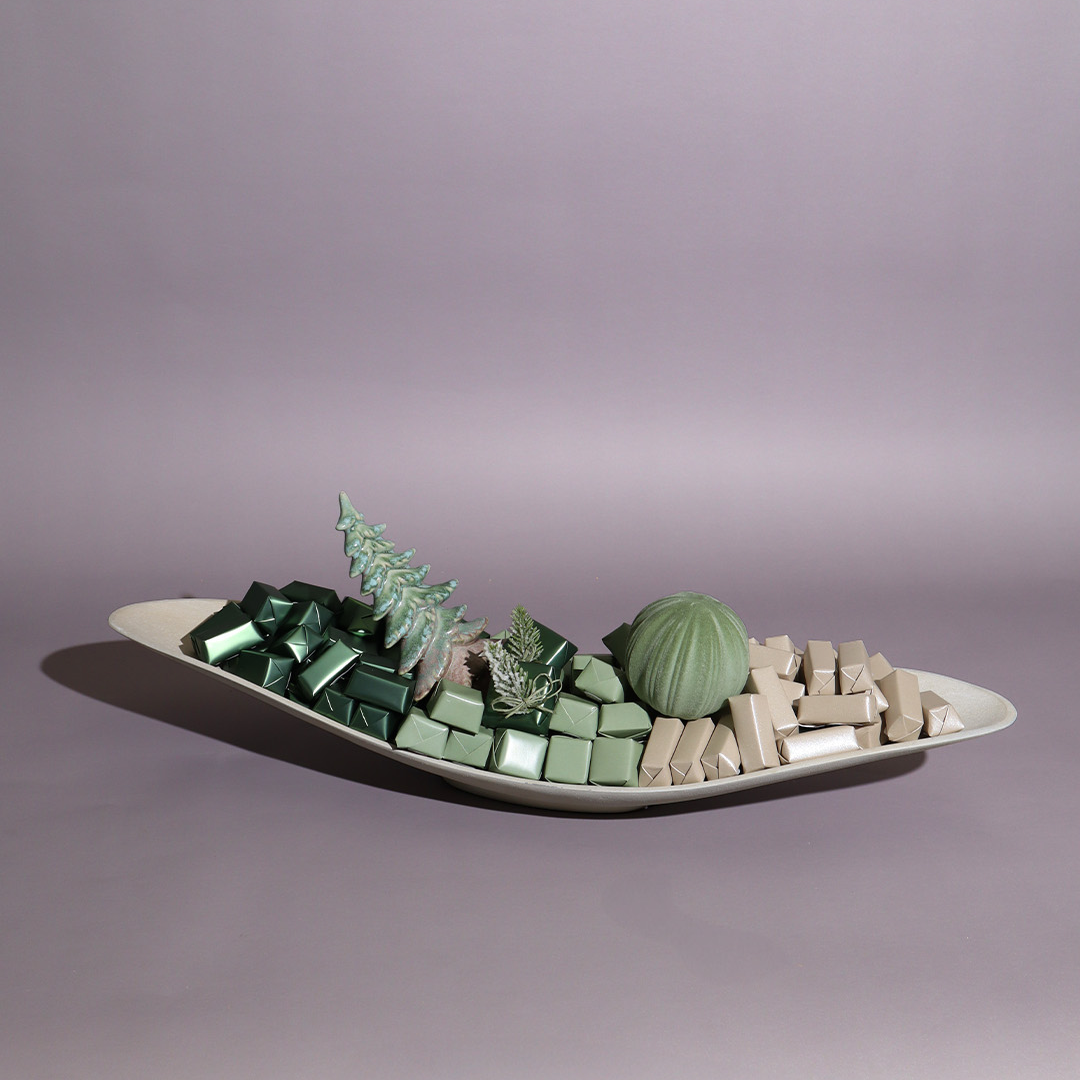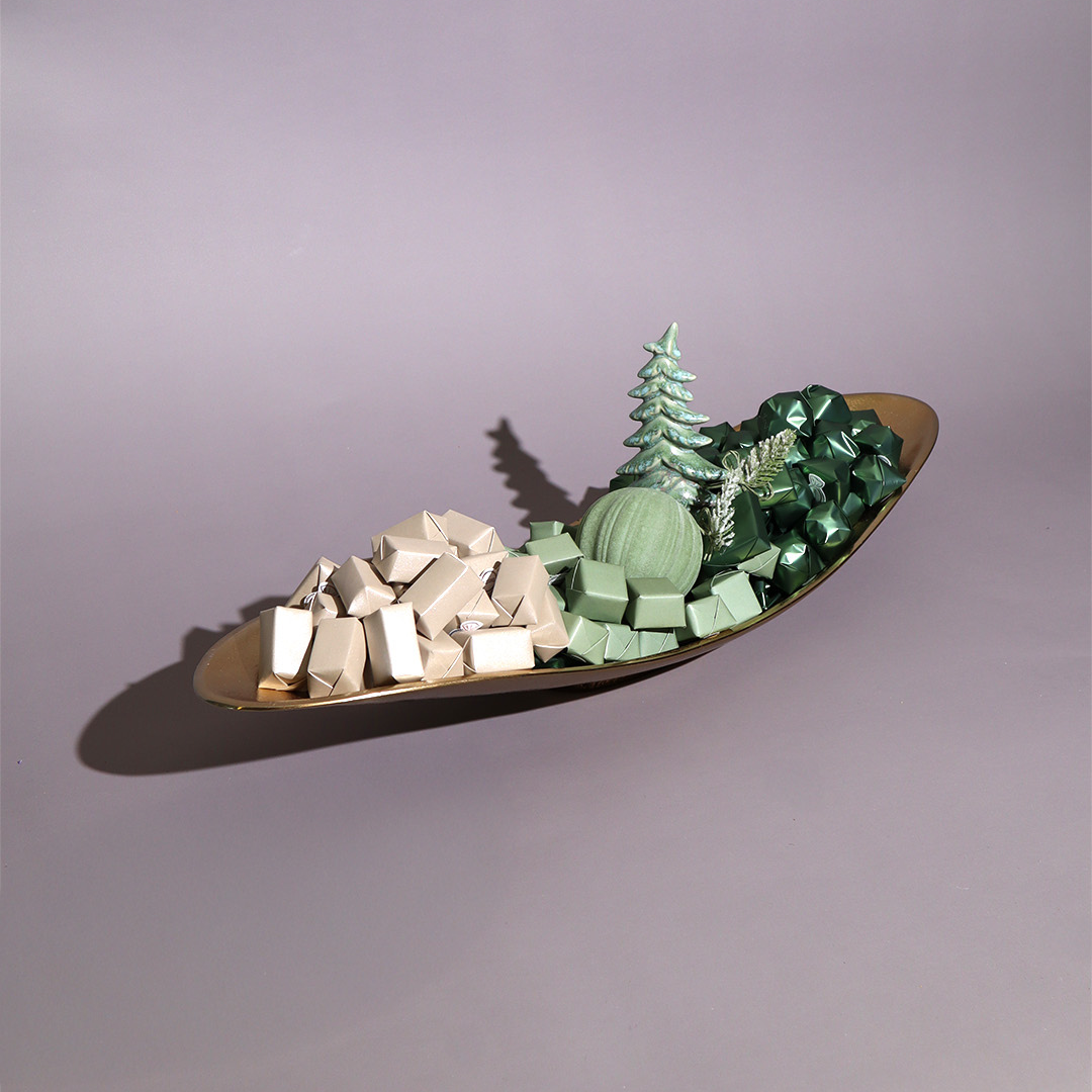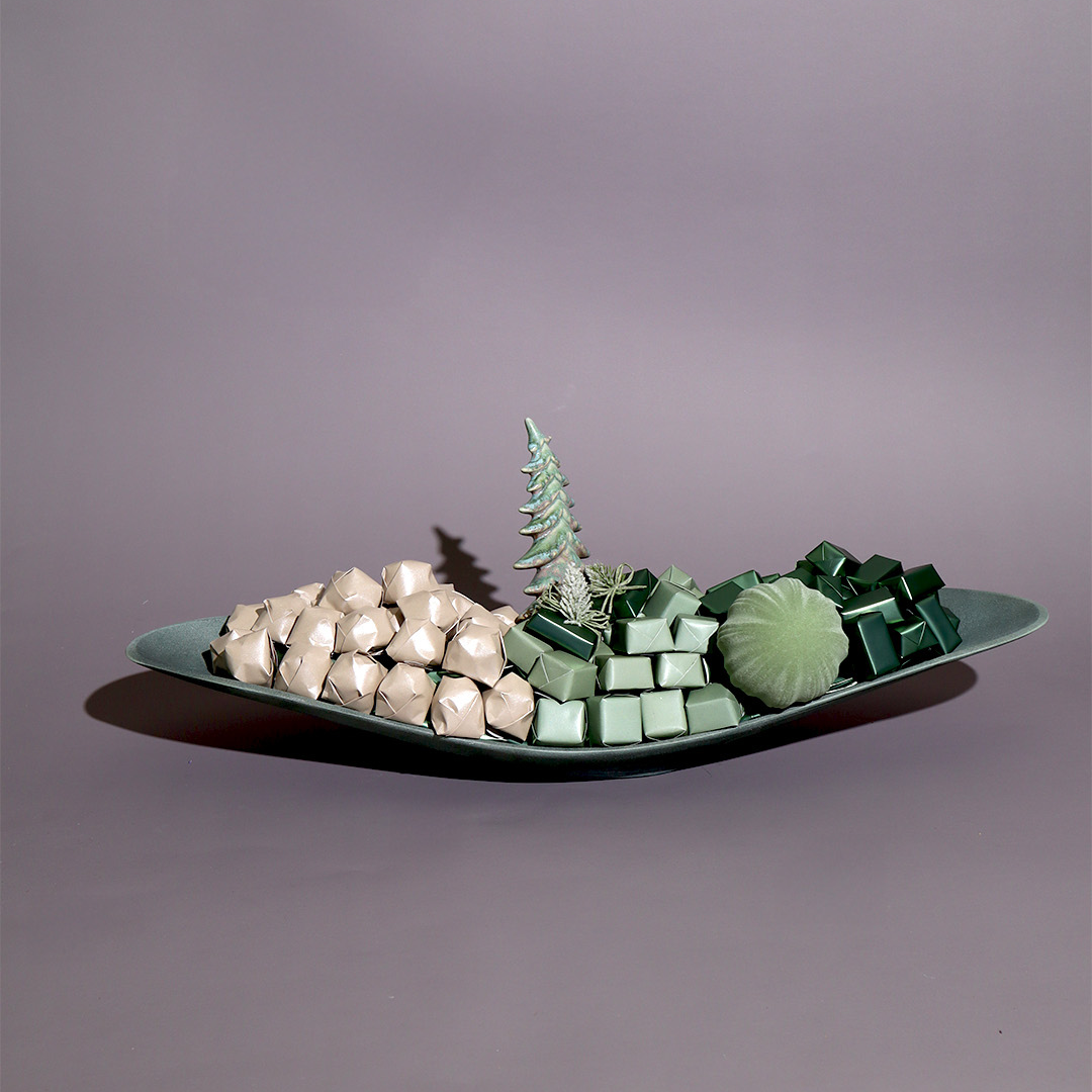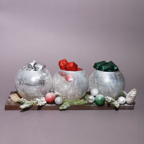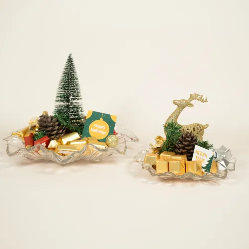 USD30 – USD50Price range: USD30 through USD50A curvy glass plate filled with 100% premium Belgian chocolate, complemented by Christmas decorations and festive accents. -
