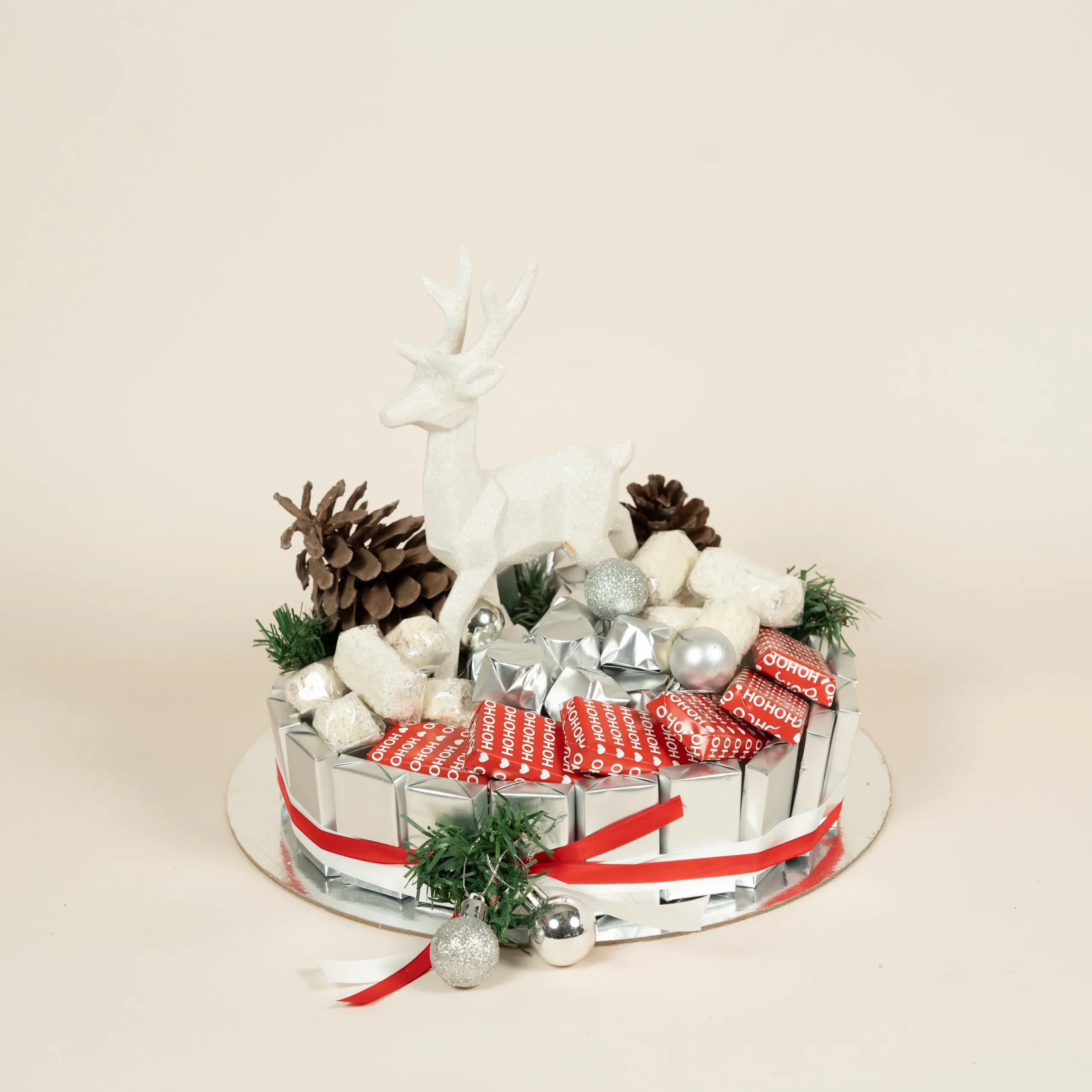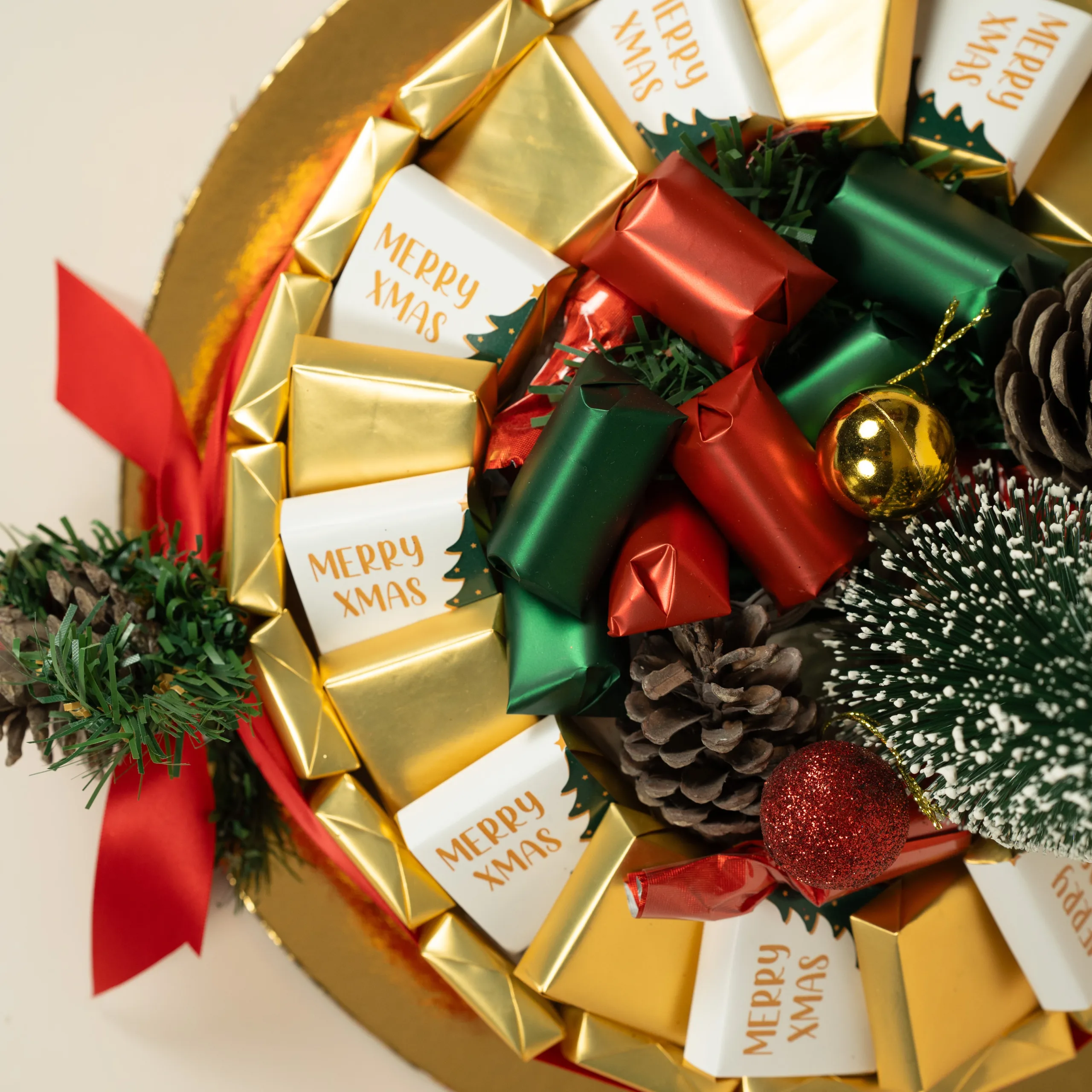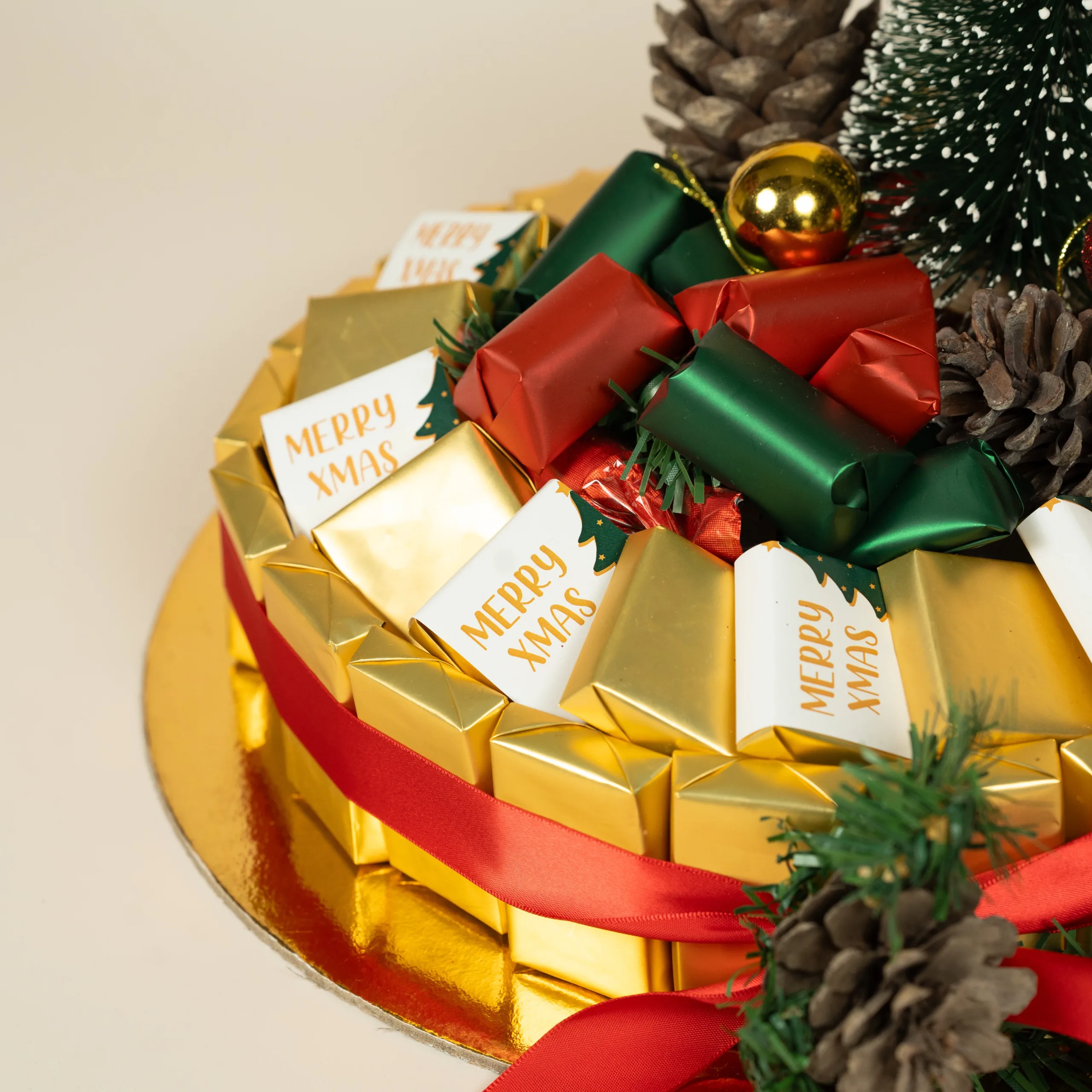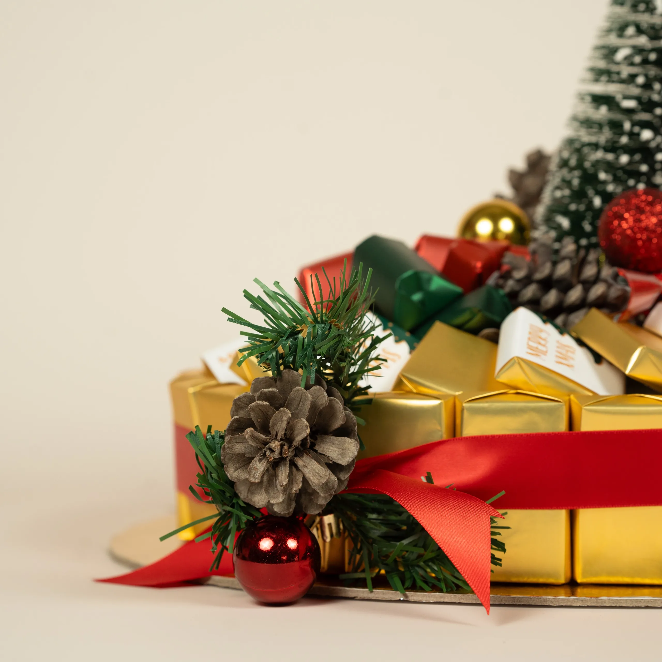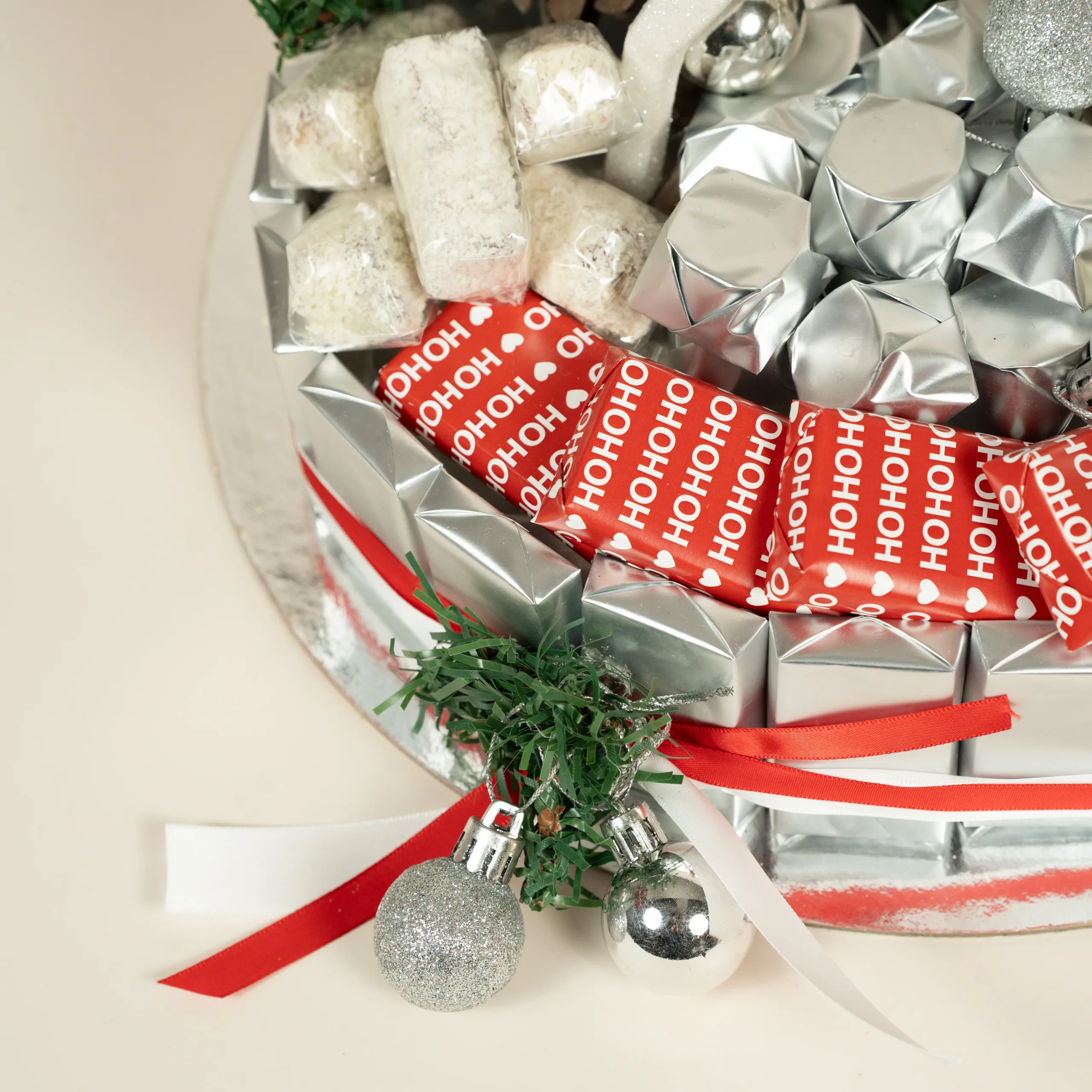 A festive 1 KG chocolate arrangement, available in silver or gold, decorated with Christmas accents and perfect for holiday gifting.