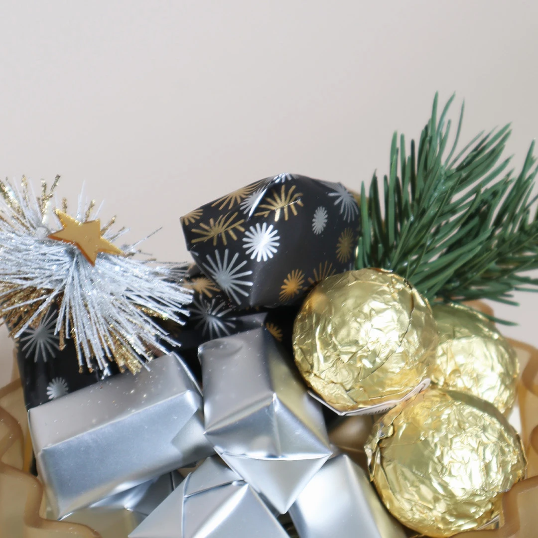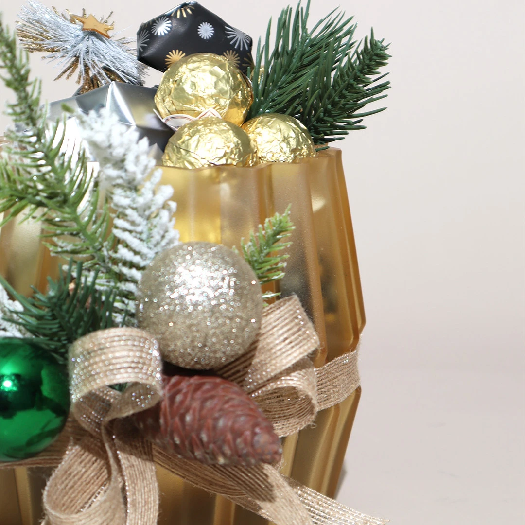 A gold, ribbed glass vase filled with 800 grams of 100% premium Belgian chocolate.