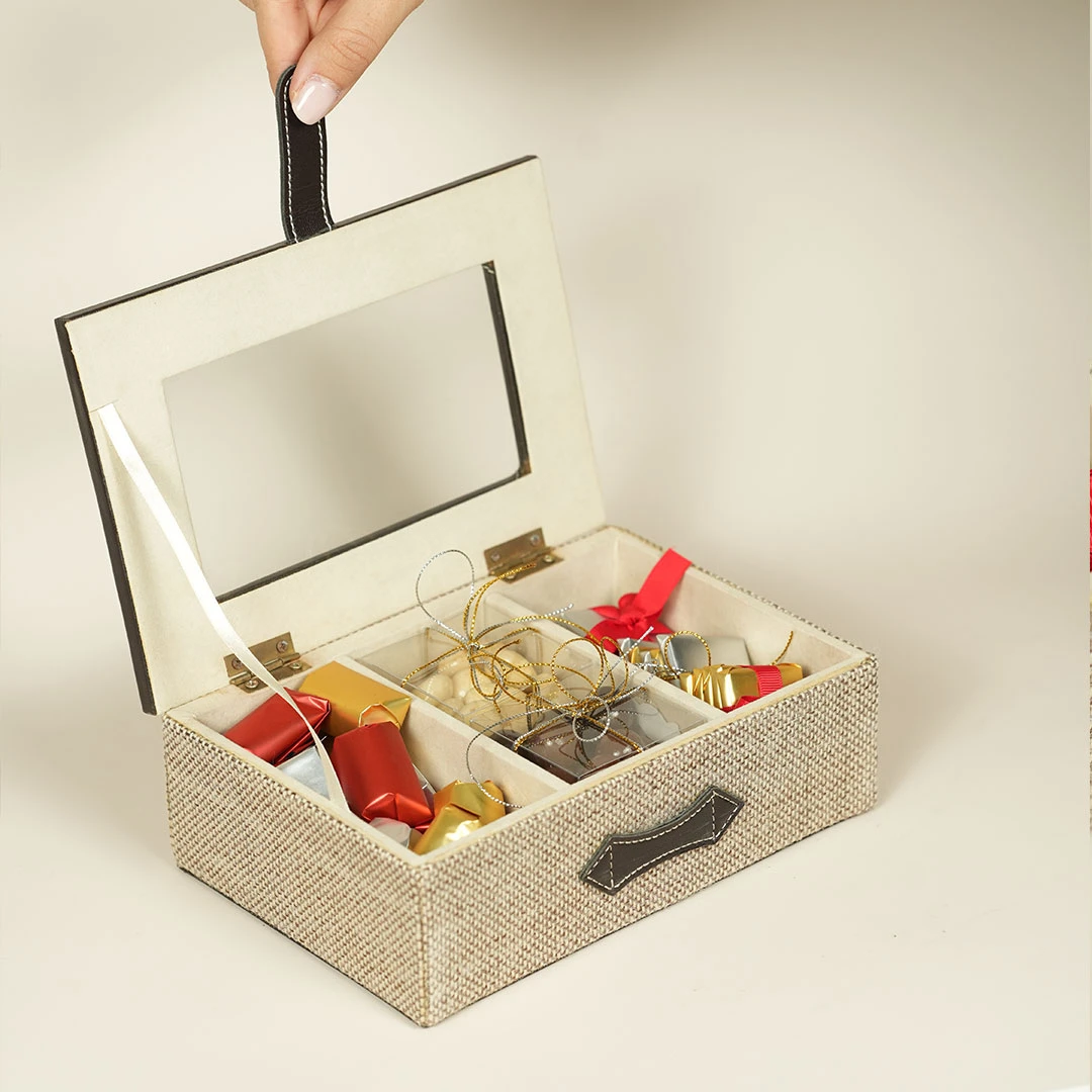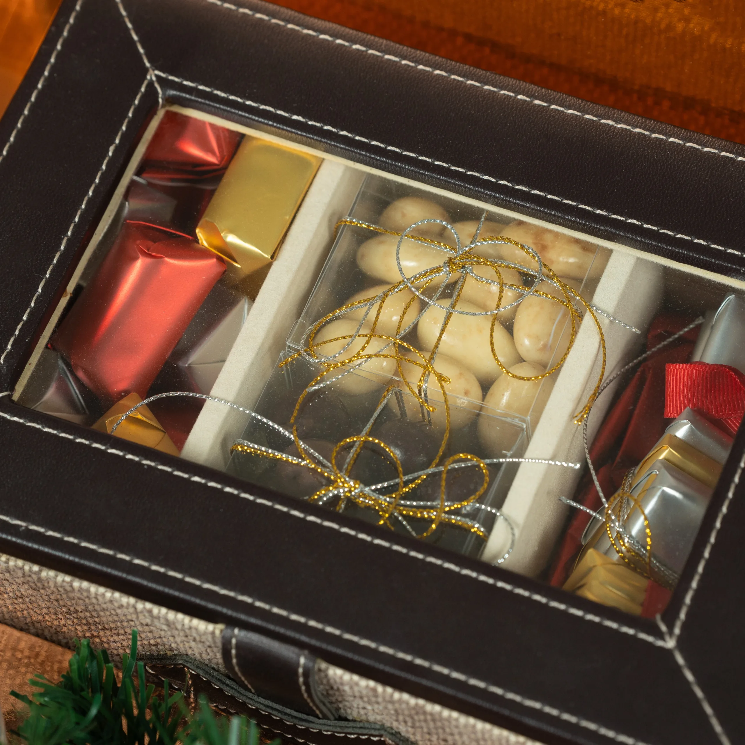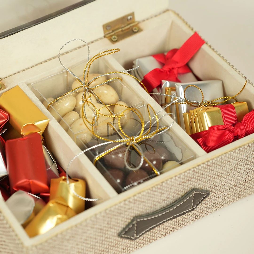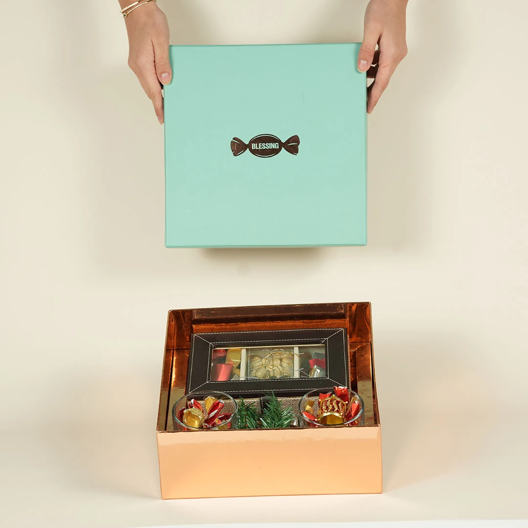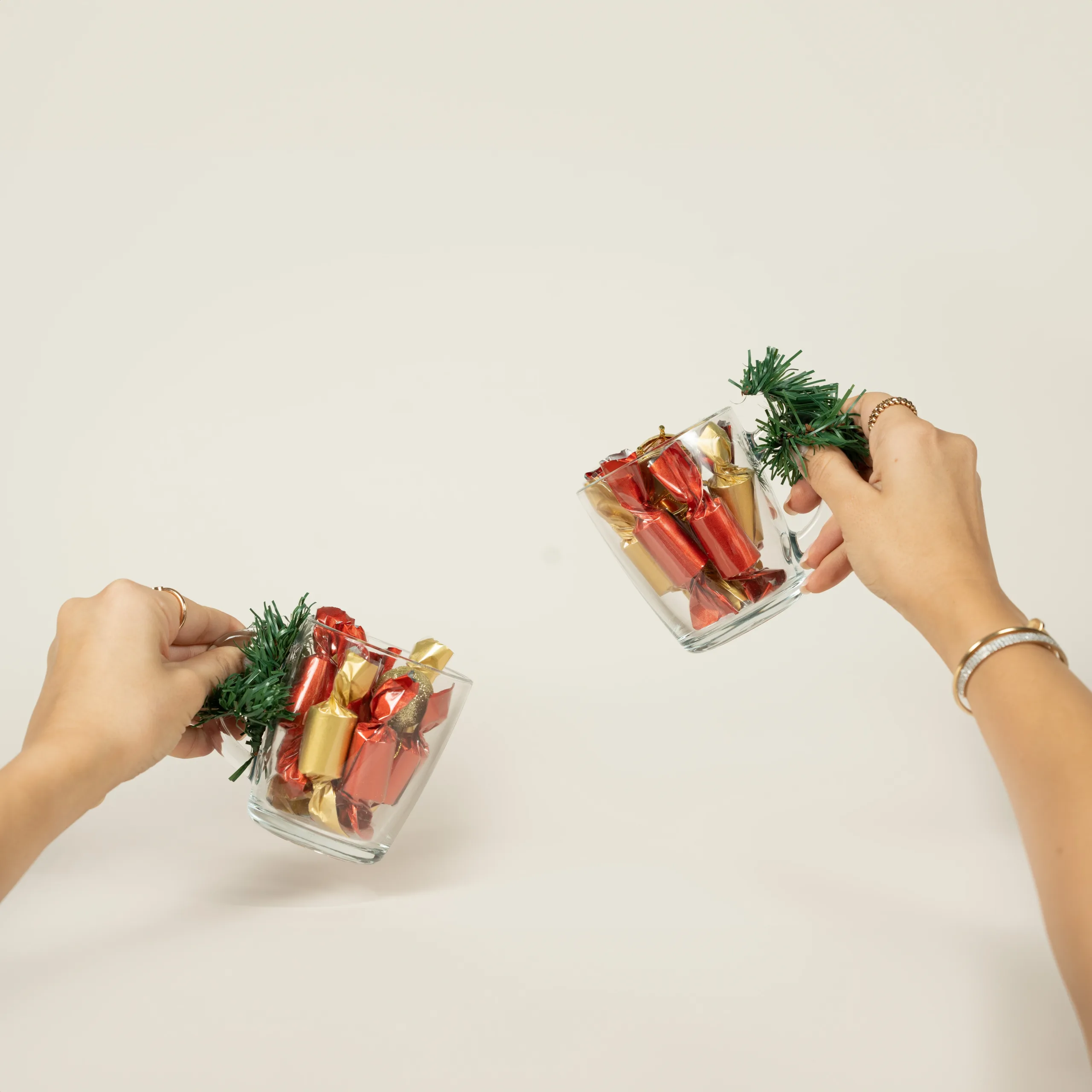 A tea box with 500 grams of 100% premium Belgian chocolate and two glass mugs, complemented by festive accents, perfect for enjoying hot tea and chocolate this Christmas.