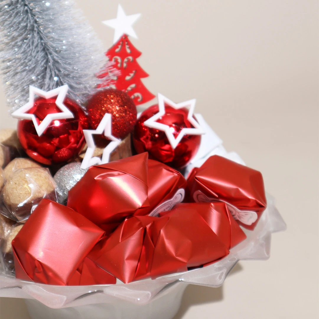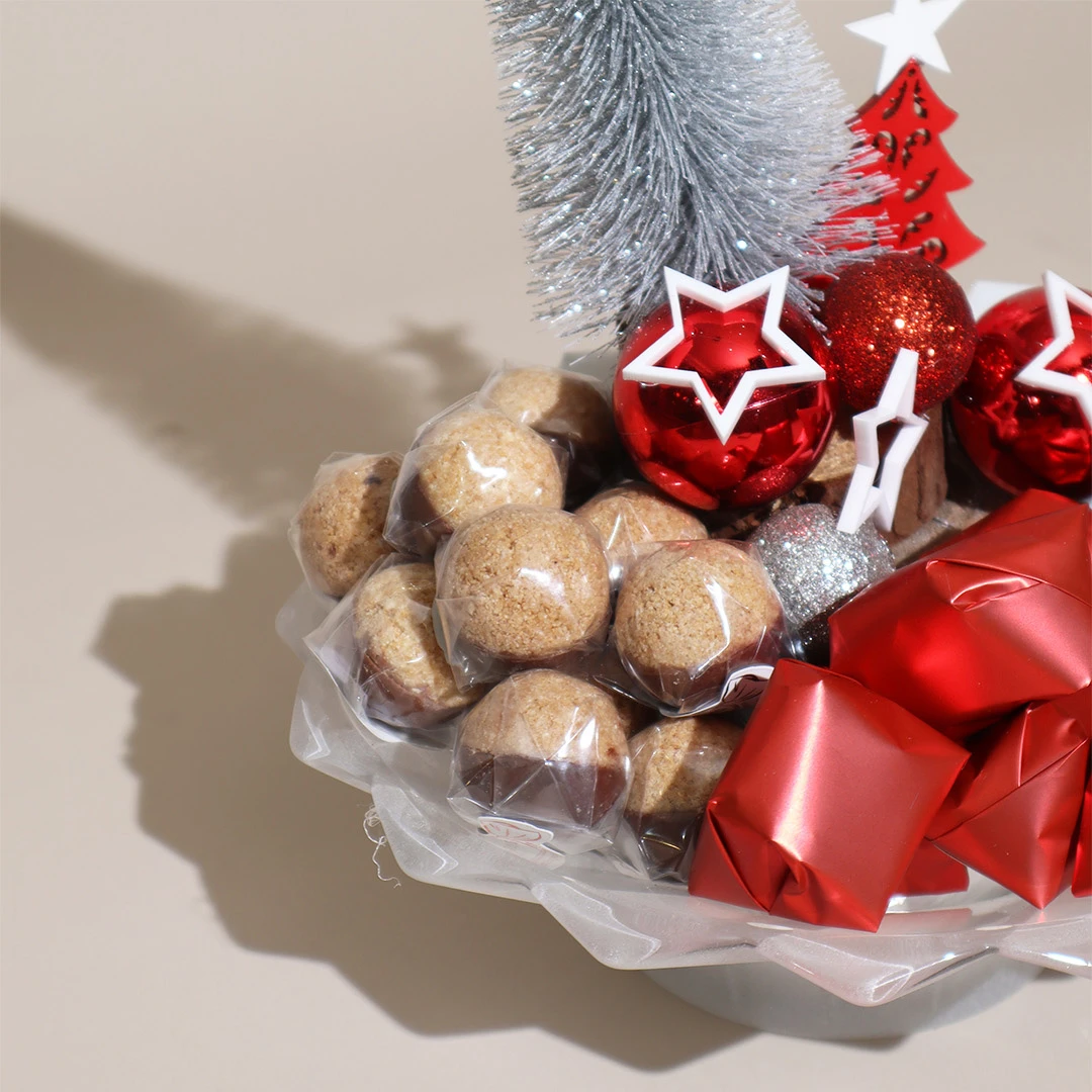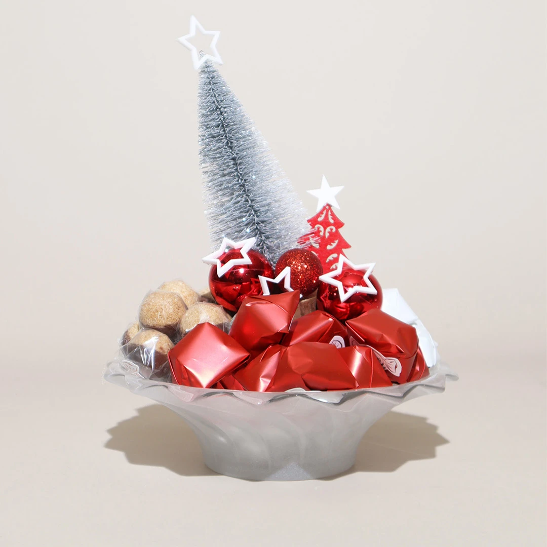 A festive, grey Murano bowl filled with 400 grams of 100% premium Belgian chocolate.