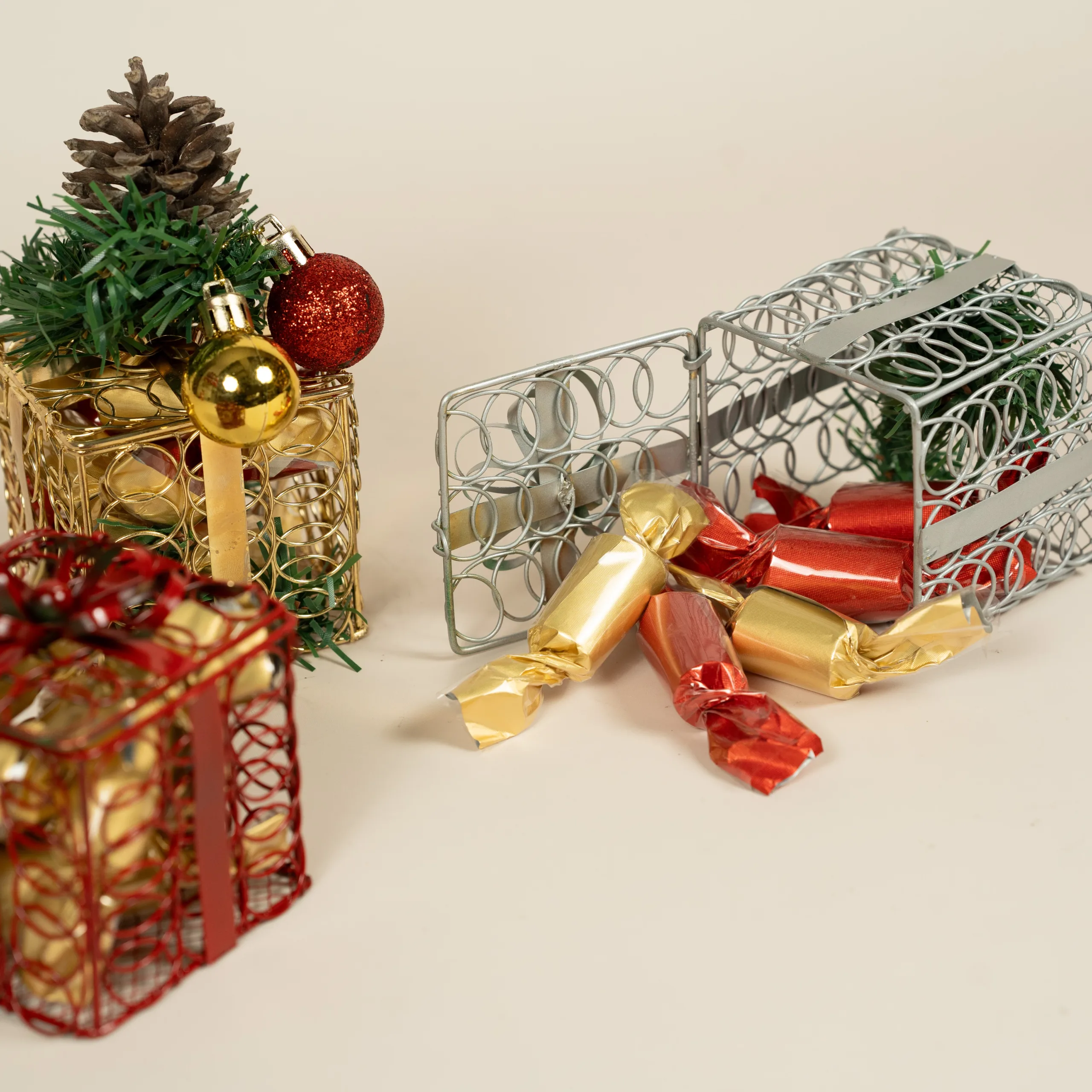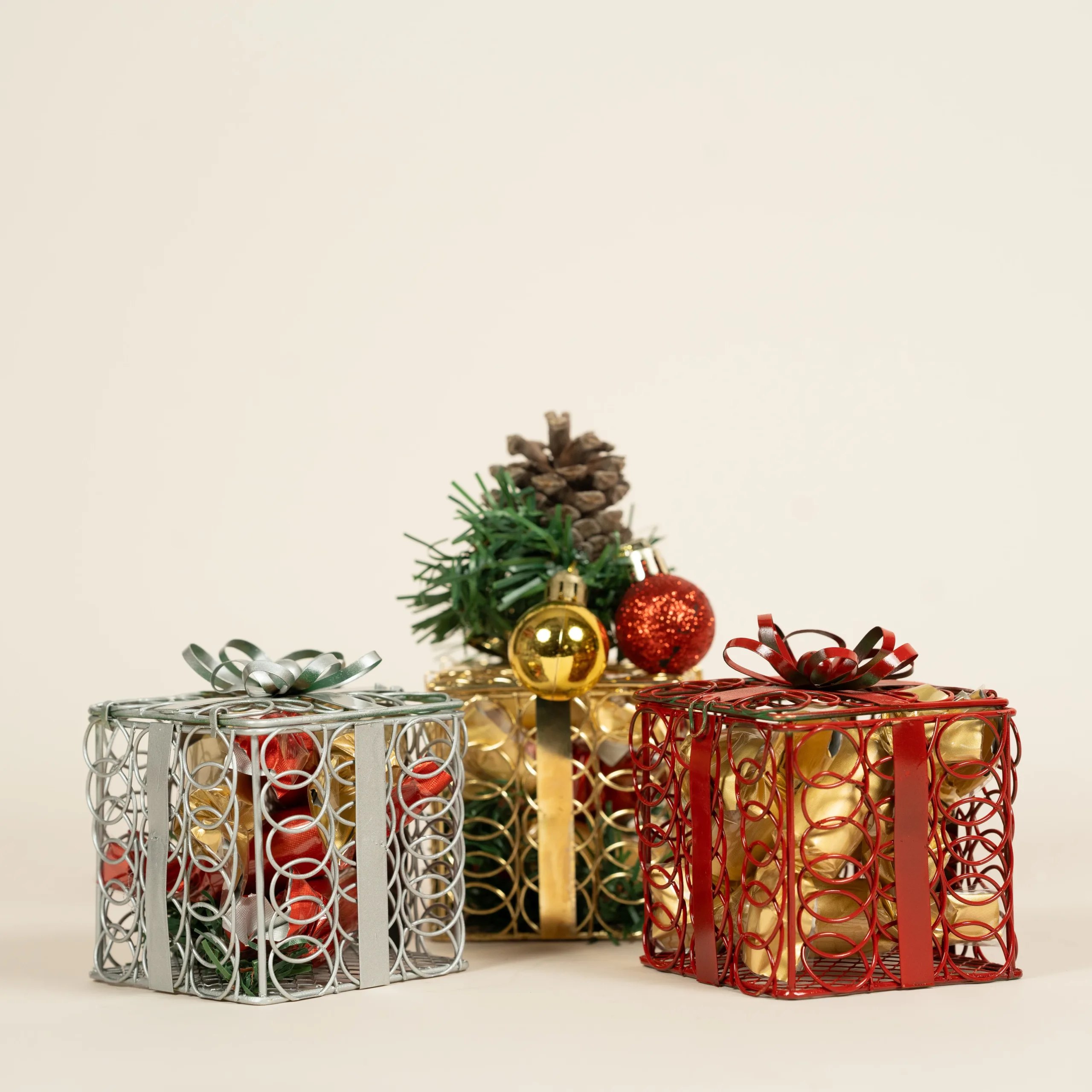 A metal gift box in silver, gold, and red, filled with 100% premium Belgian chocolate and decorated with holiday ornaments.