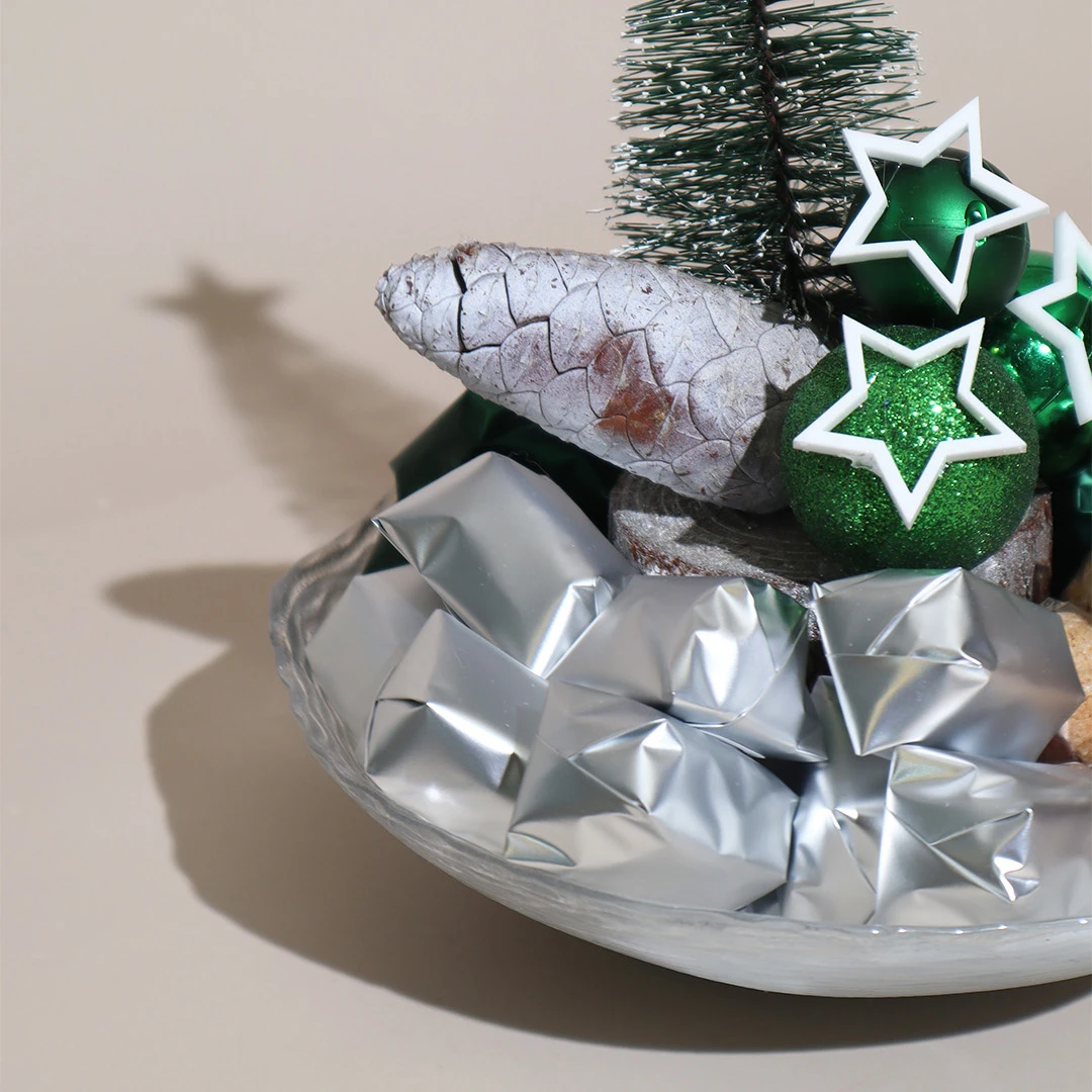 $45A crystal-clear plate featuring a festive arrangement and 560 grams of 100% premium Belgian chocolate, complete with a miniature snowy green tree and holiday ornaments. -