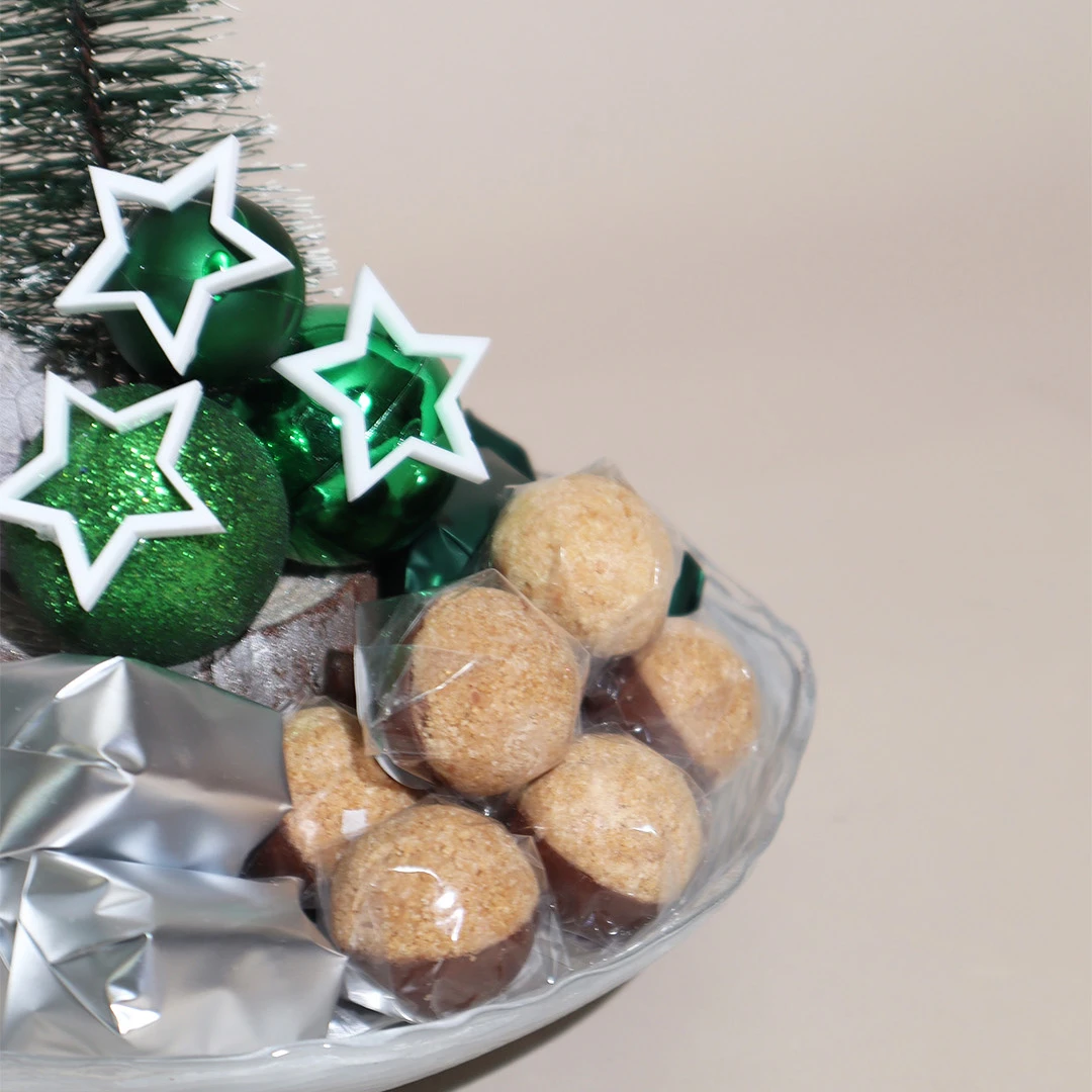 $110A festive glass platter filled with 1.1 KG of 100% premium Belgian chocolate, complemented by Christmas decorations, perfect for holiday celebrations. -