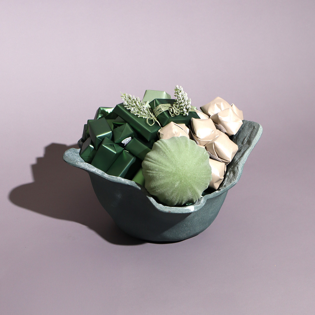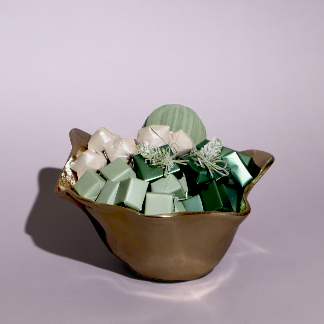 USD150A hand-painted, metallic footed bowl filled with 1.2 KG of 100% premium Belgian chocolate. -