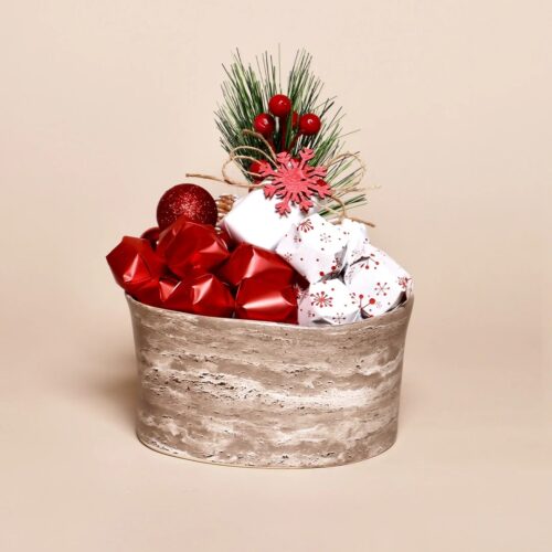 USD50 – USD80Price range: USD50 through USD80A festive golden glass vase filled with 100% premium Belgian chocolate and decorated with Christmas accents. -